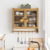 24.8” Vintage Wall Cabinet with Glass Door, Double Fluted Door Storage Cabinet with 3 Tiers of Storage and Towel Rack, for Kitchen, Dining Room, Bathroom, Natural