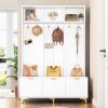 75.4″ Large Storage Hall Tree, Modern Multi-Functional Storage Bench with High Gloss Fluted Doors, Luxurious Coat Rack with 6 Gold Hooks, Tall Storage Cabinet for Living Room, Living Room, White