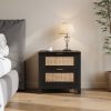 AODAILIHB Accent Bed Side Table, Rattan Night Stands Decor Drawer set of 2, Natural Wood Side Table with Wireless Charging Station, Black