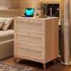 AOGLLATI Rattan Nightstand with Charging Station & 3 Drawers for Bedroom