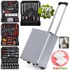 799PCS Aluminum Trolley Case Tool Set, Complete Tool Box Set with Rolling Wheels, Household Hand Tools Kit for Men, Silver