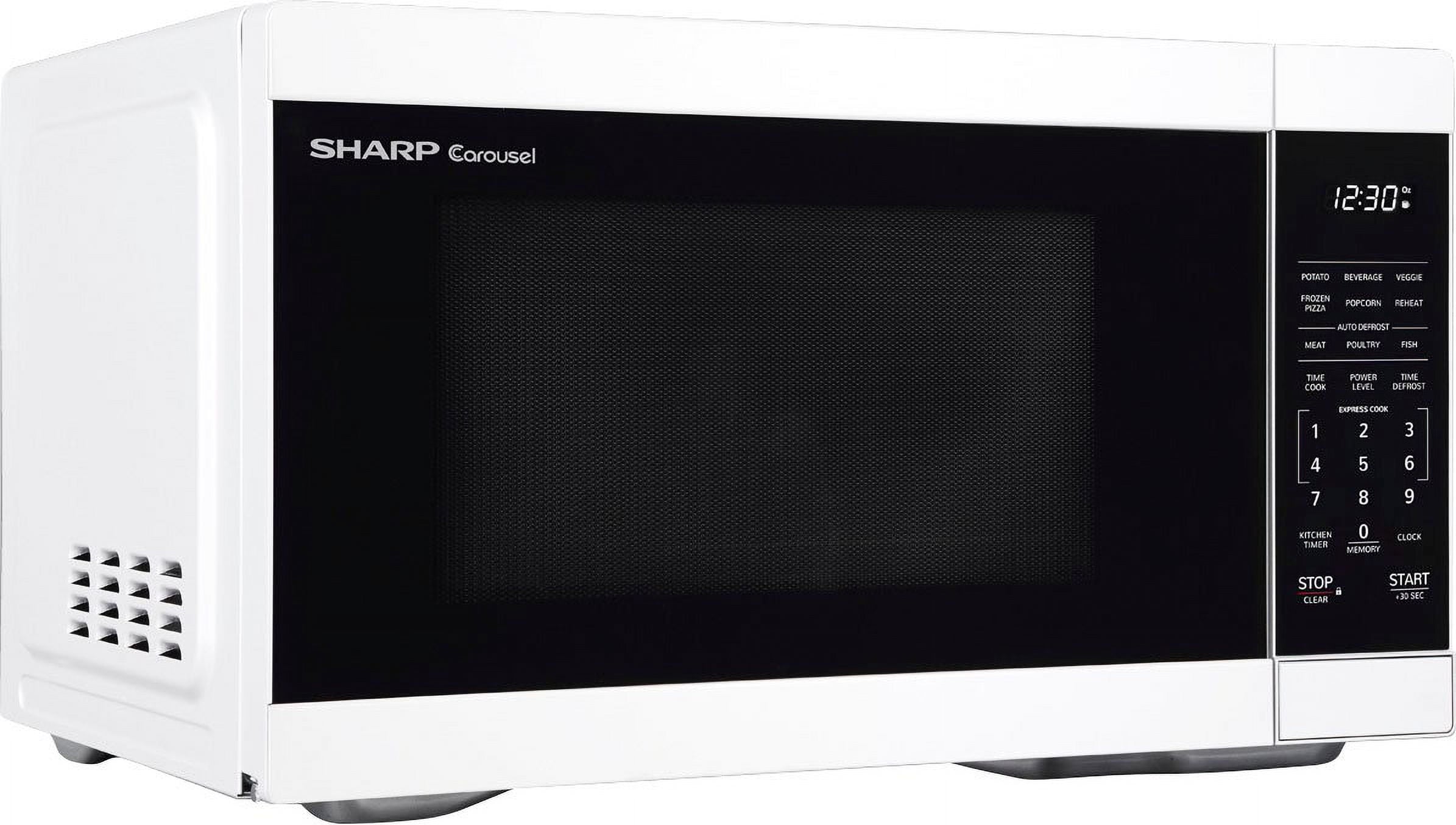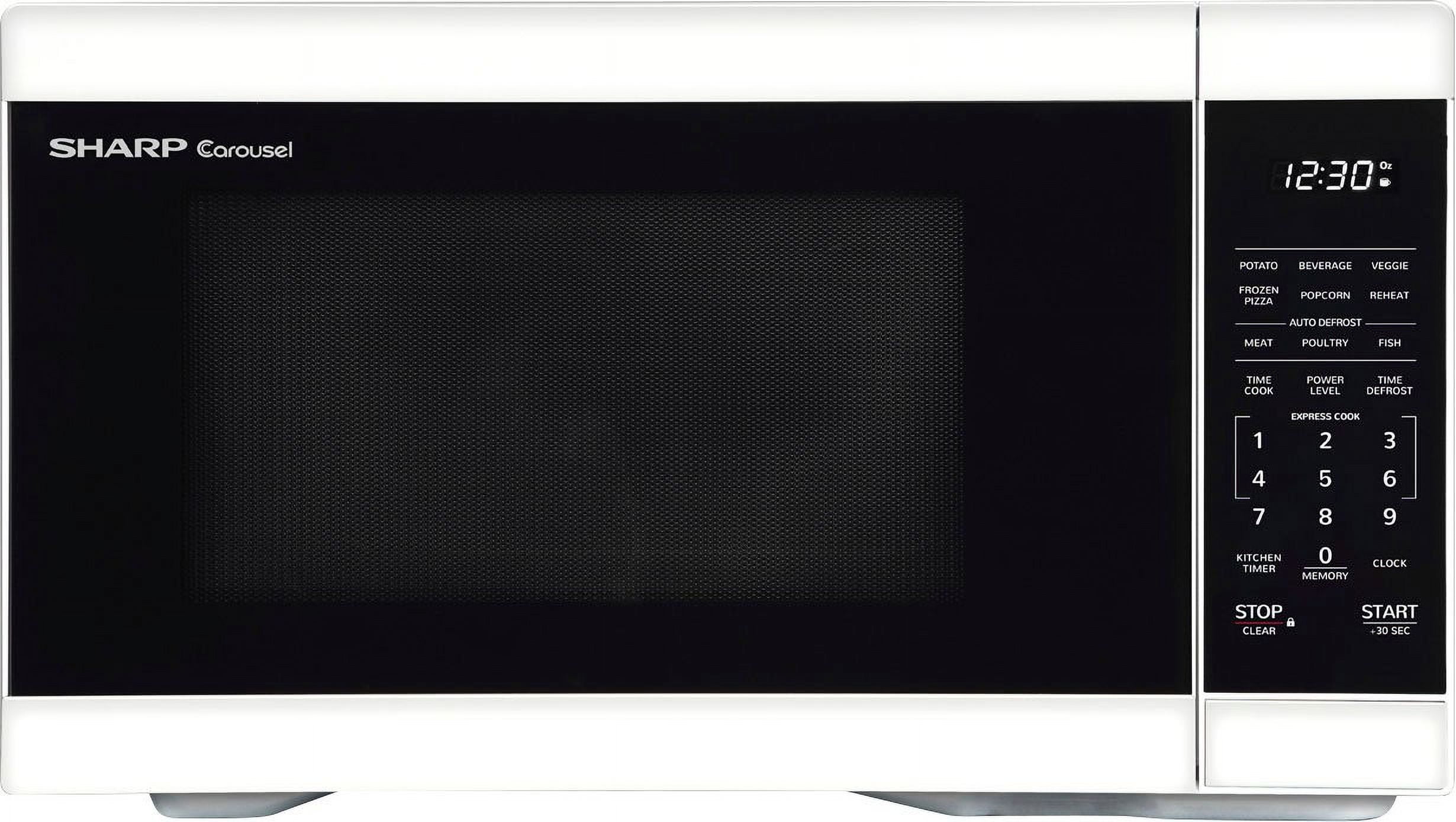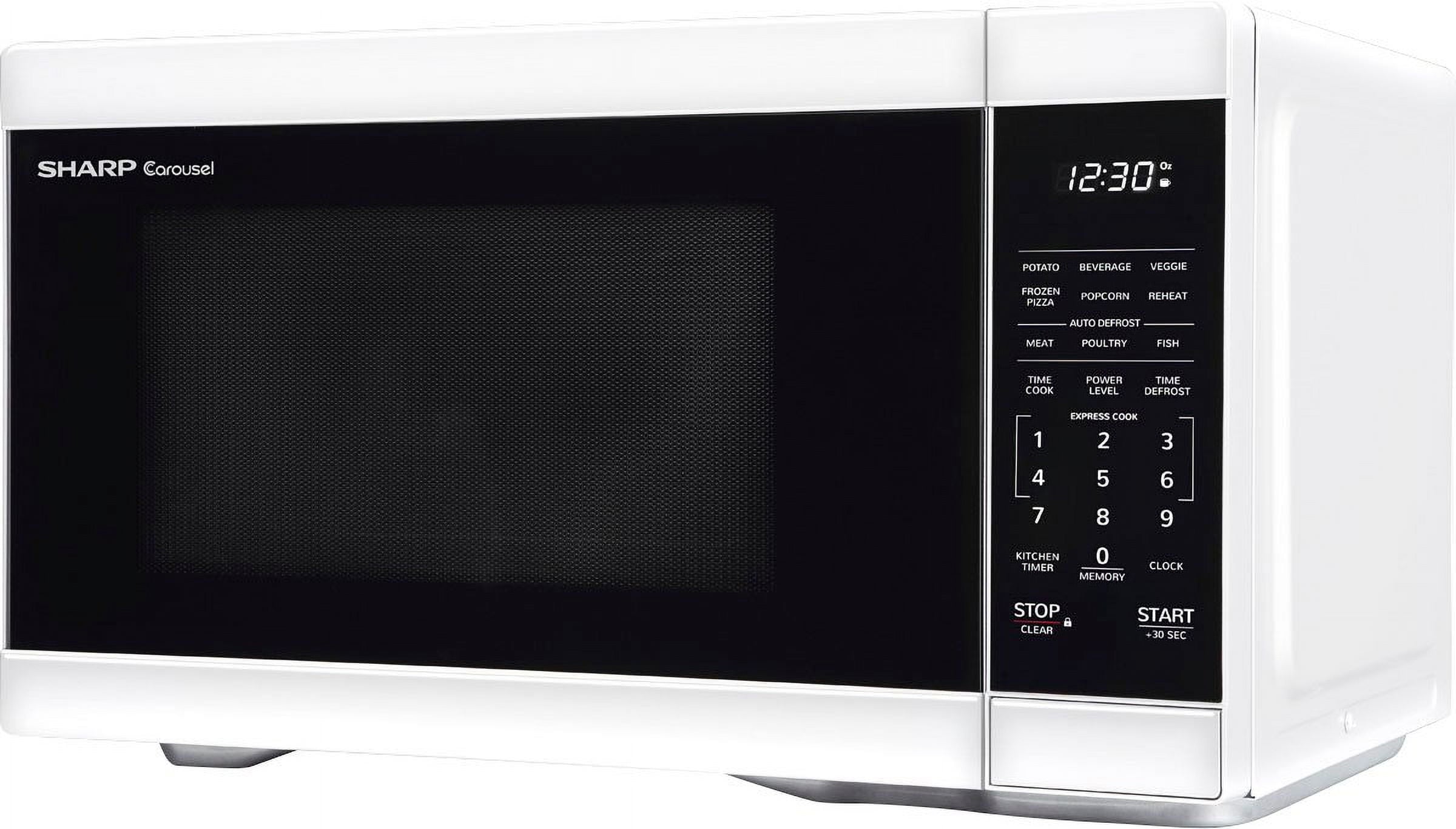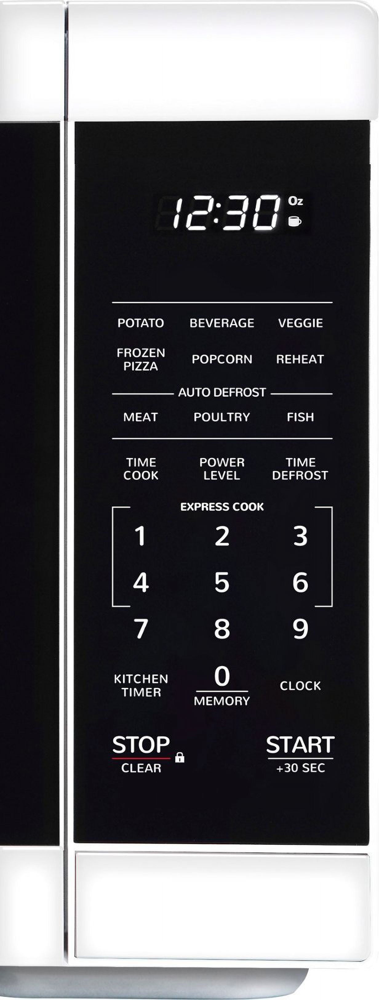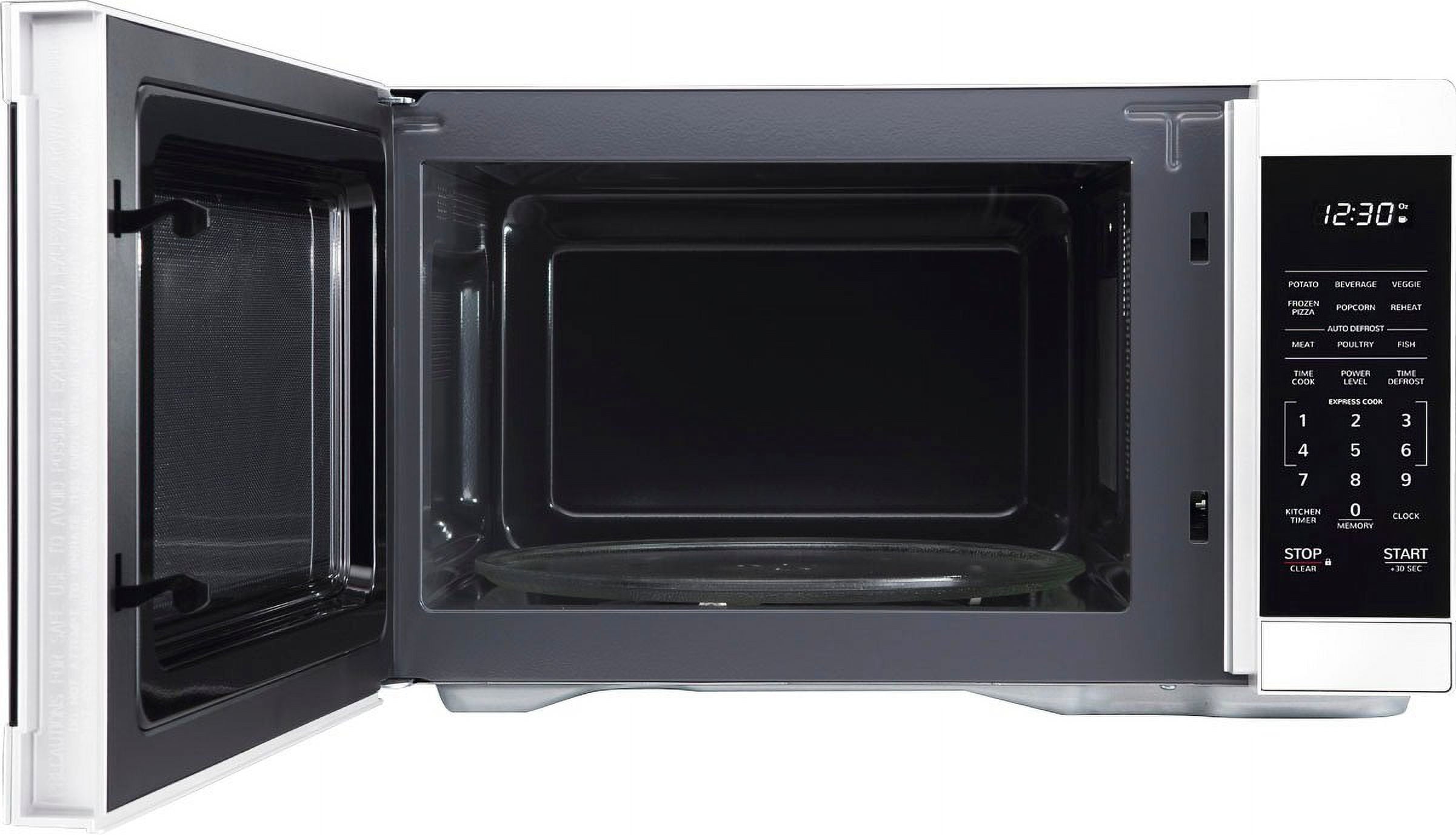 The Mid-Size, 1.1 cu. ft., 1000 Watt Microwave Oven in White takes up less space on your countertop and is our smallest oven for a full size dinner plate. The is packed with thoughtfull and innoivative features. Convenient preset buttons make cooking and reheating favorite foods and beveragesa breeze. Offer One-Touch cooking for up to 6 minutes. The +30 second key for instant start or adding time. Easy-to-clean White finish with stylish gray interior, and LED lights complement your style. The 12.4″ Dishwasher safe glass turntable makes easy clean up. The White LED is bright and easy to read.