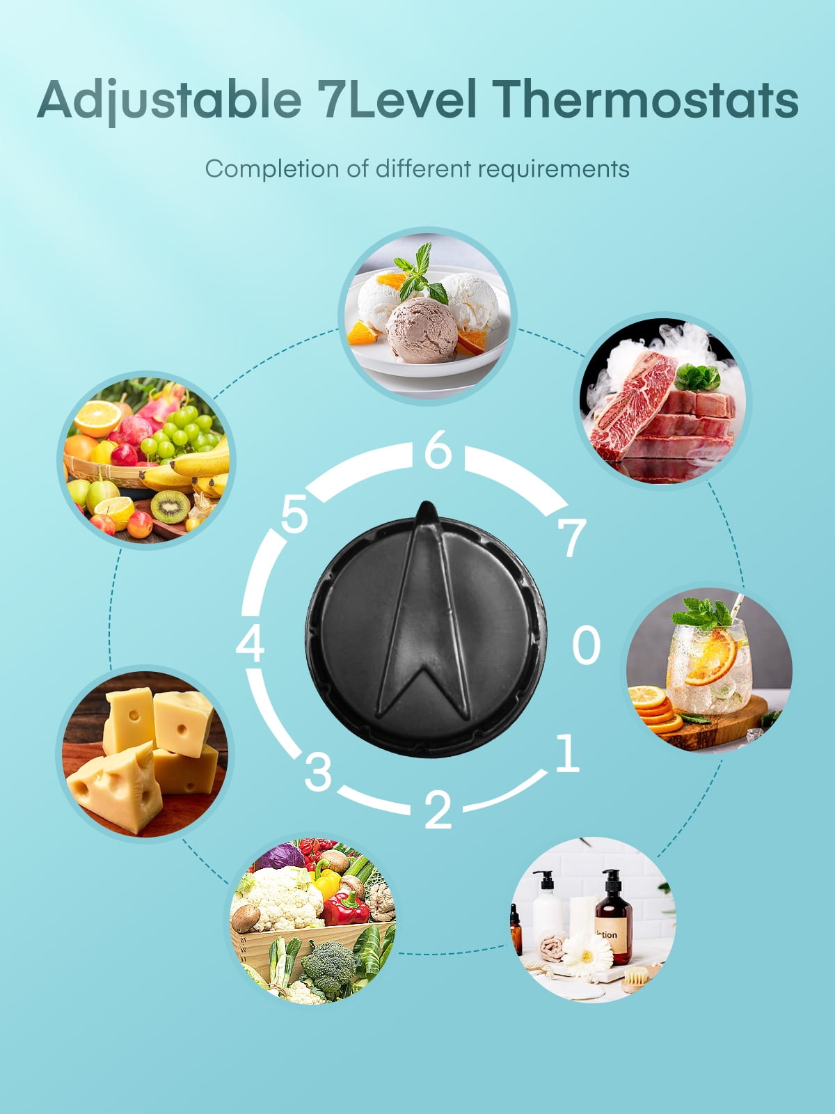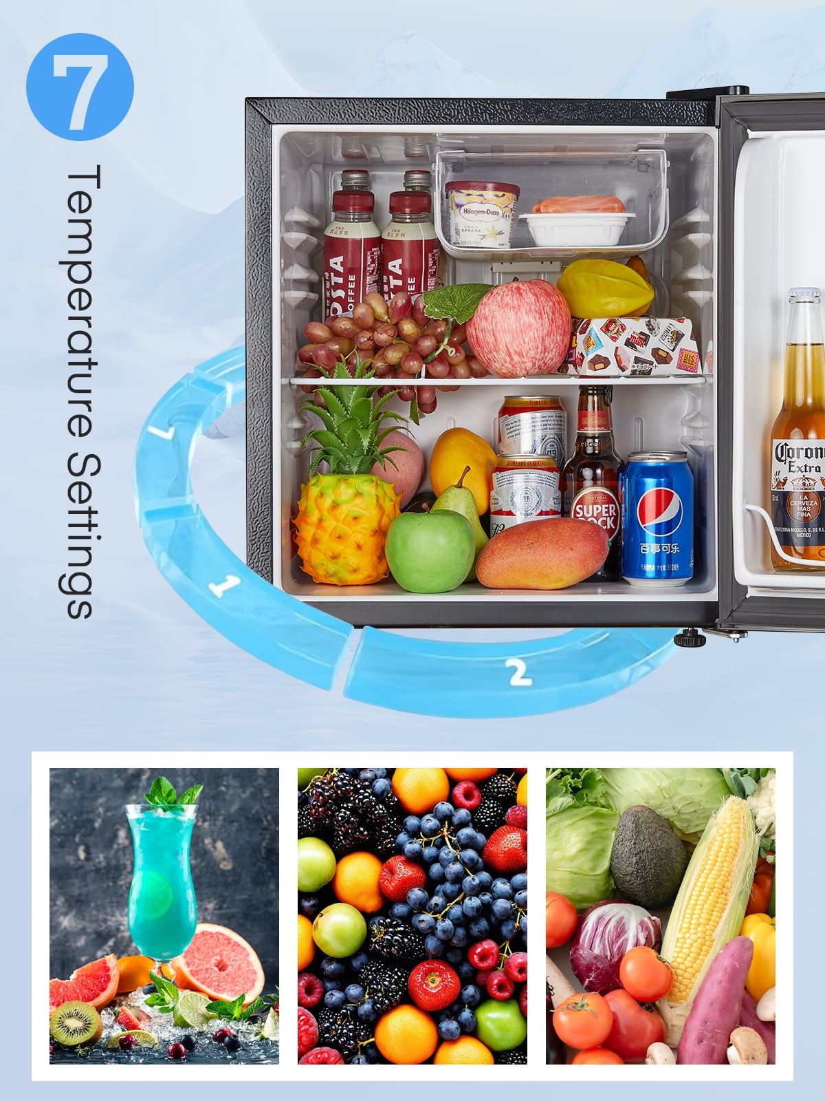• Spacious Dual – Zone Storage:With 1.6 cu ft for refrigeration and 0.16 cu ft for freezing, it suits various items. The 7 – level temp control sets the ideal cold for drinks, snacks, fruits, or beauty products.
