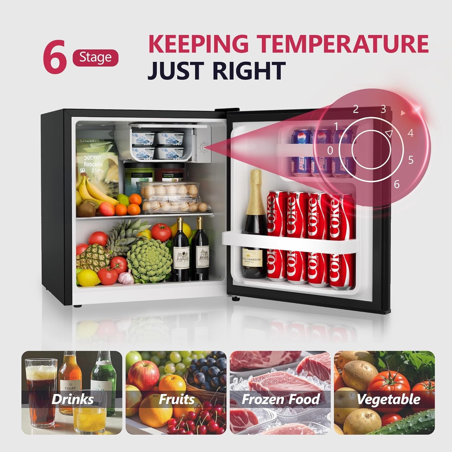 • 【PRECISION COOLING & SUPERIOR FRESHNESS】Equipped with a 6-speed adjustable temperature control, mini fridge with freezer ensures optimal cooling for all your needs. The 1.5Cu.ft built-in freezer and 0.2Cu.ft soft freeze compartment keep fruits, veggies, and frozen treats like ice cream in dorm fridge perfectly preserved, keeping your food fresh longer.