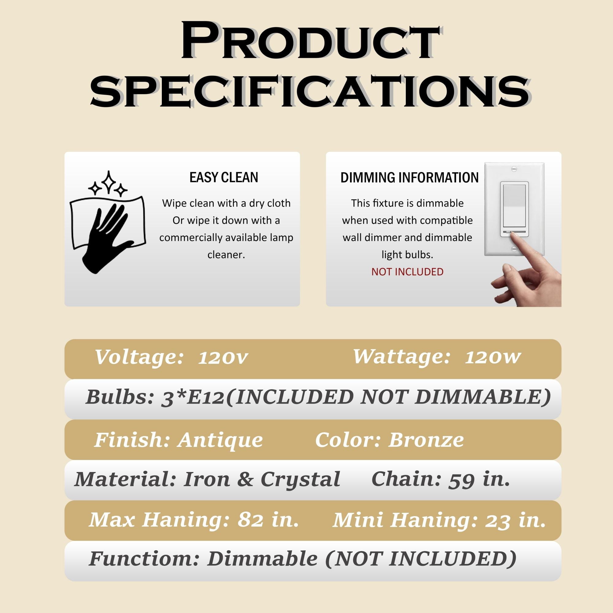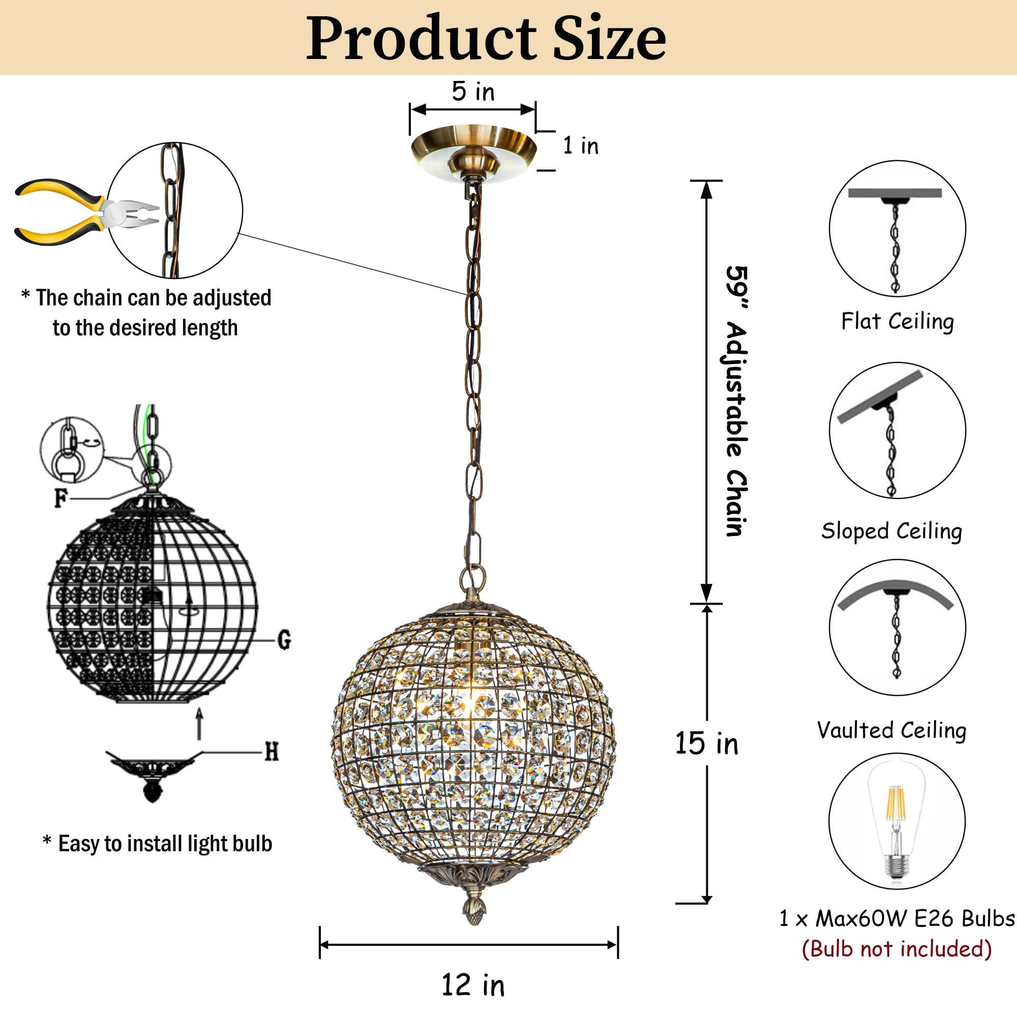 - Overall product: W11.8″ × H14.9″; Maximum hanging length: H83″; Minimum hanging length: H21″ (Chain Adjustable)