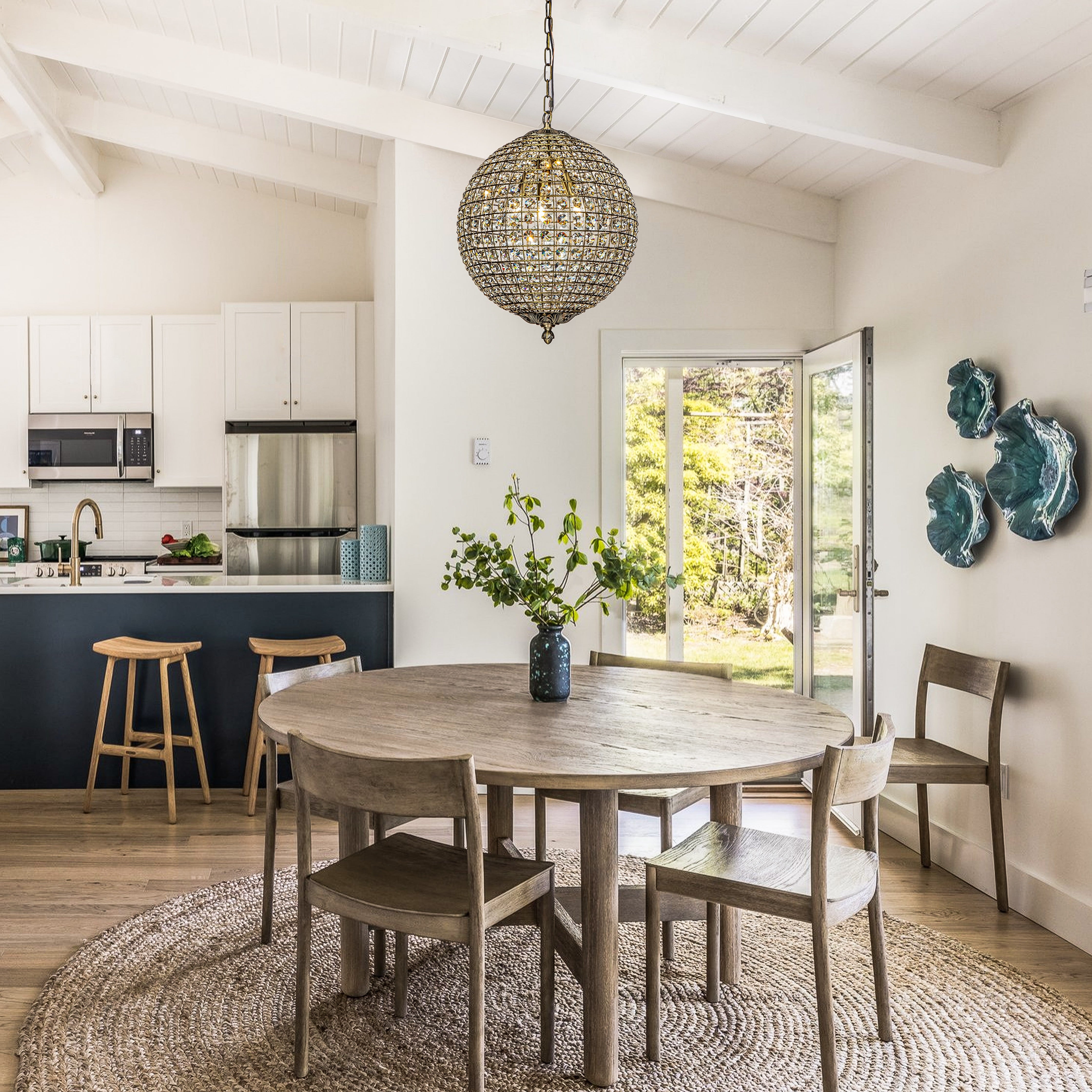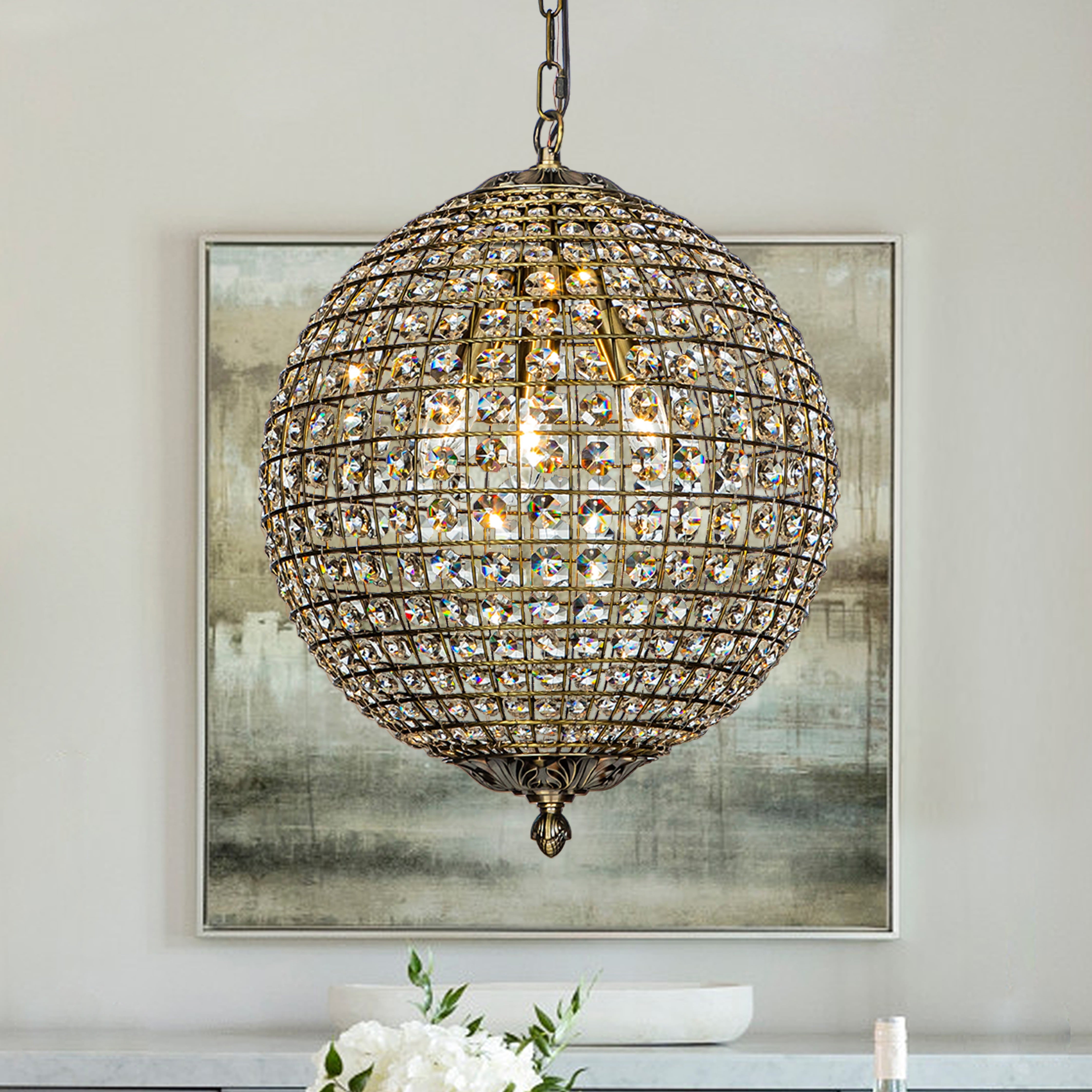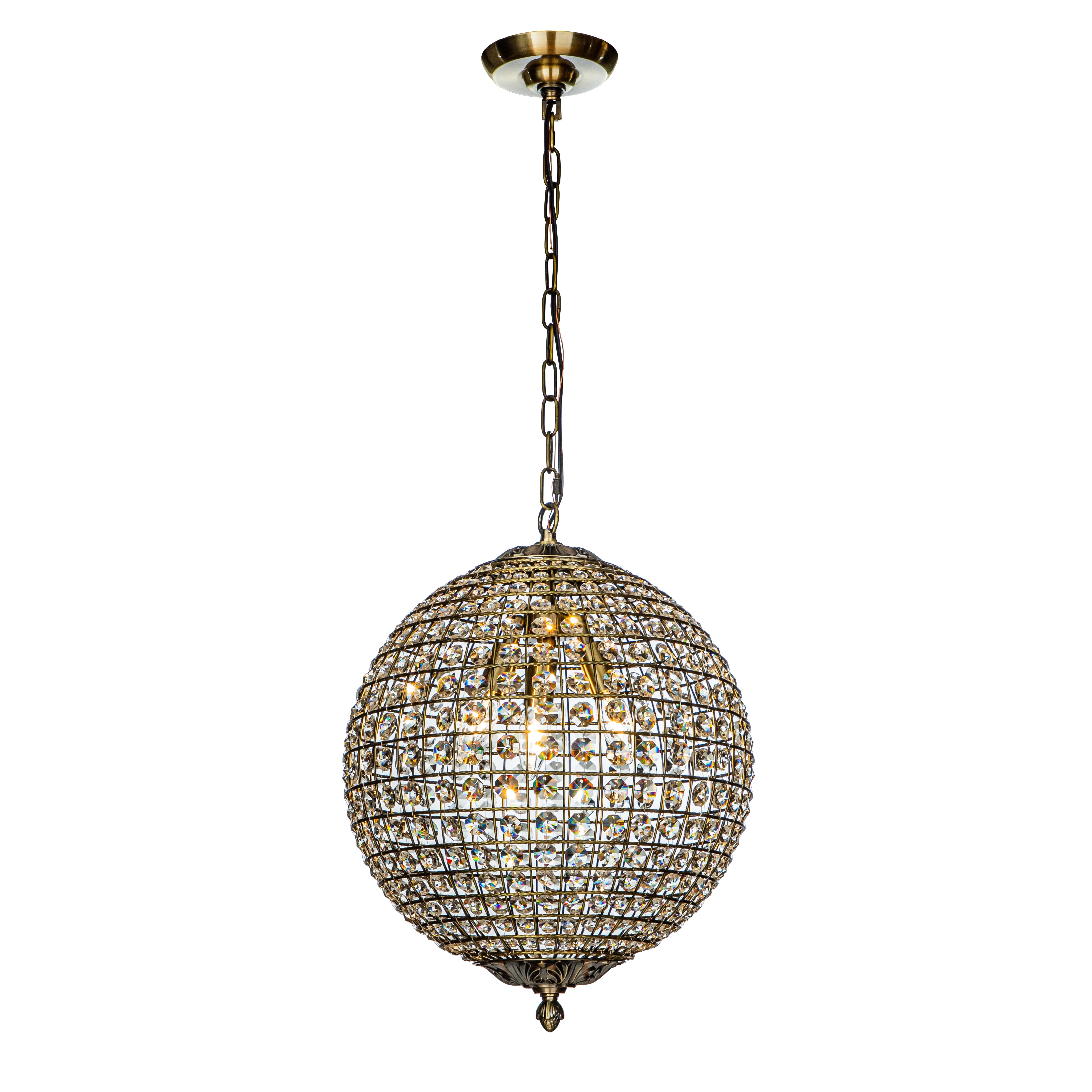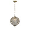 Decor your dining room with elegant scattered light from this crystal globe pendant. Brilliant-cut crystals sit between the lattices in the cage-style shade on this chandelier, delivering maximum refraction and reflection from the glow. Antique goldtone finishing on the strong metal framework adds an extra glam touch. The antique gold frame contrasts the crystals with delicate lattice work that your guests will love it. It only measures 12″ tall, so it can work in space-conscience homes. This fixture hangs from an adjustable chain and has a sloped ceiling-compatible canopy. This small chandelier is ideal for your foyer, living room, dining room, entryway, or studio, both residential and commercial spaces.