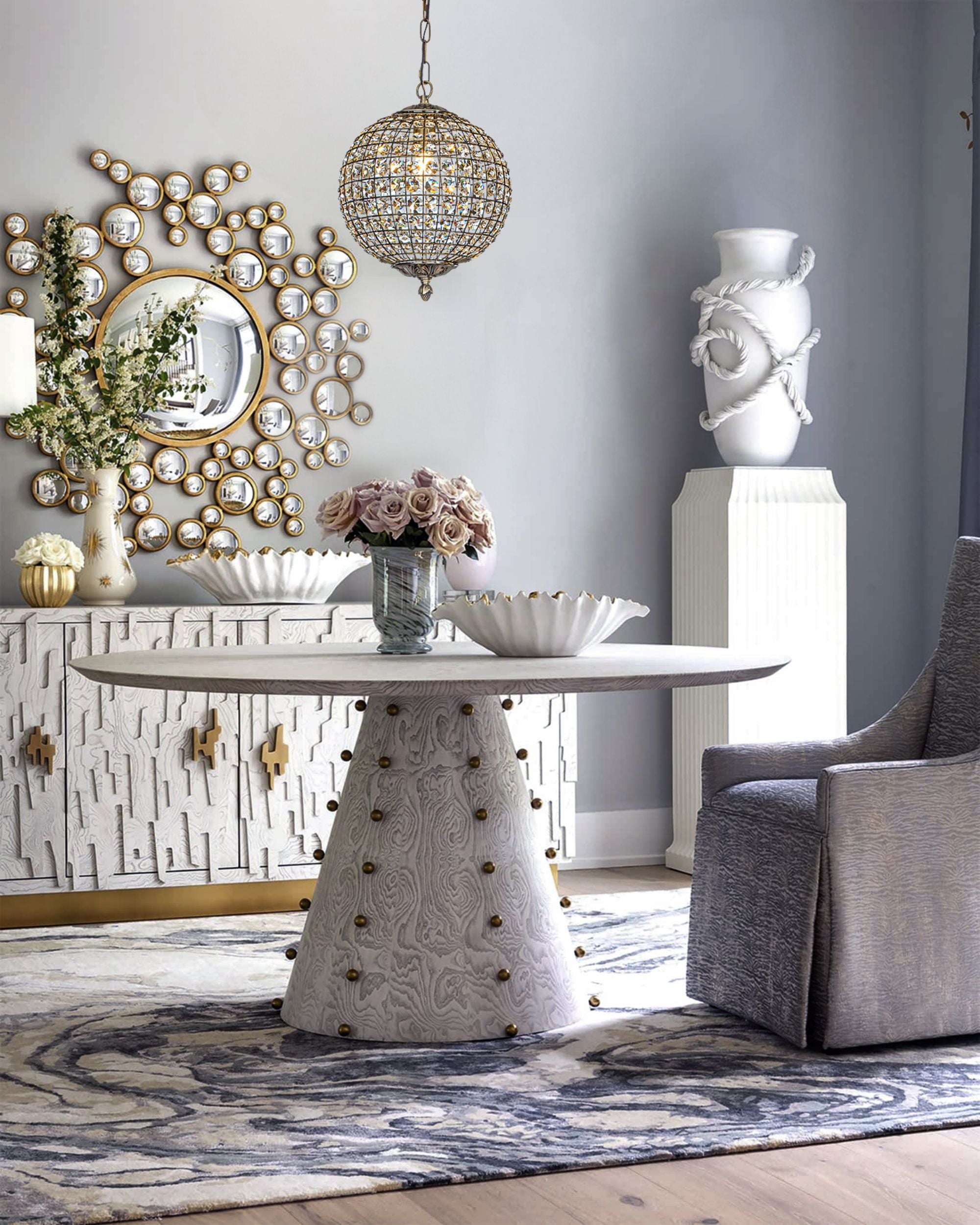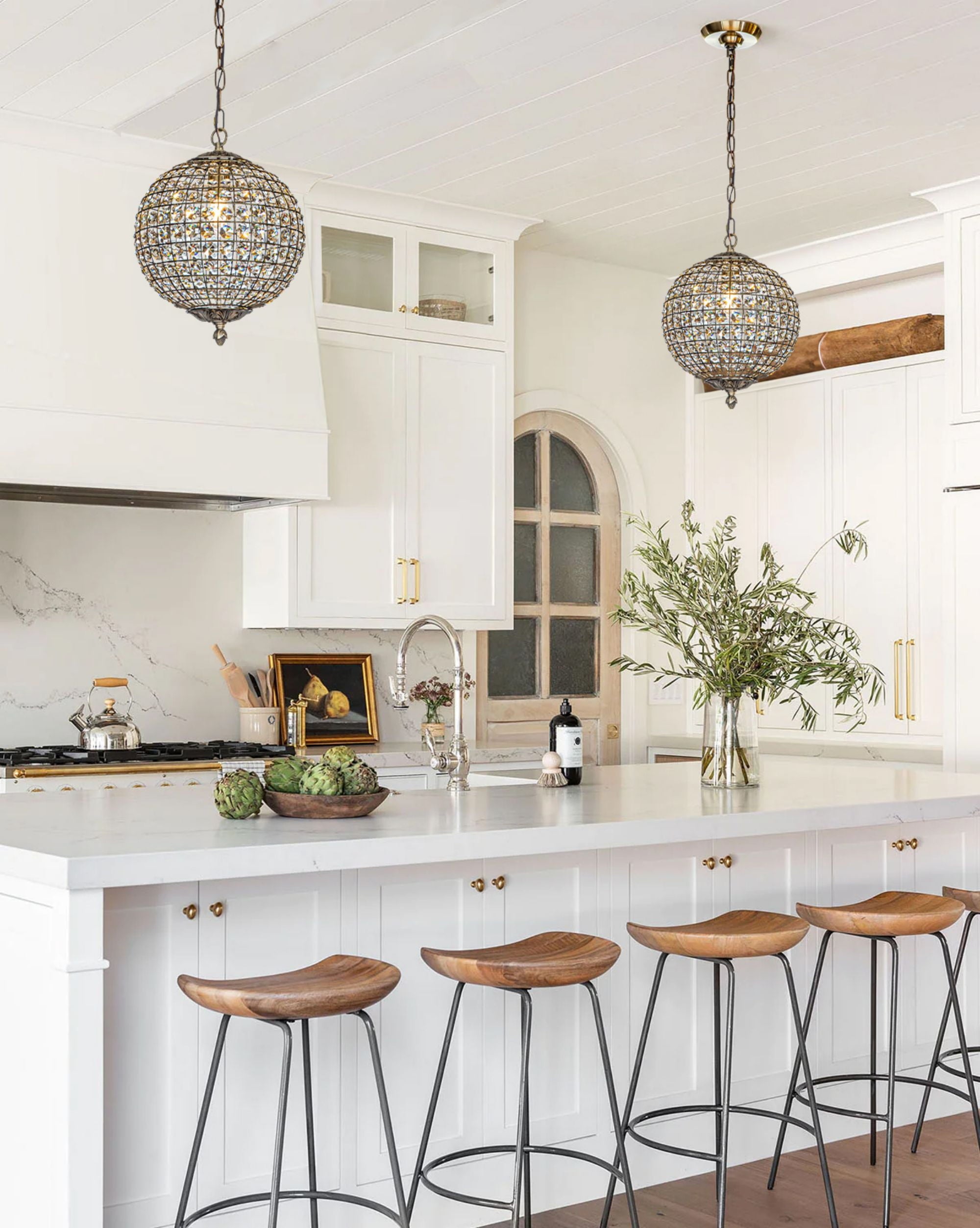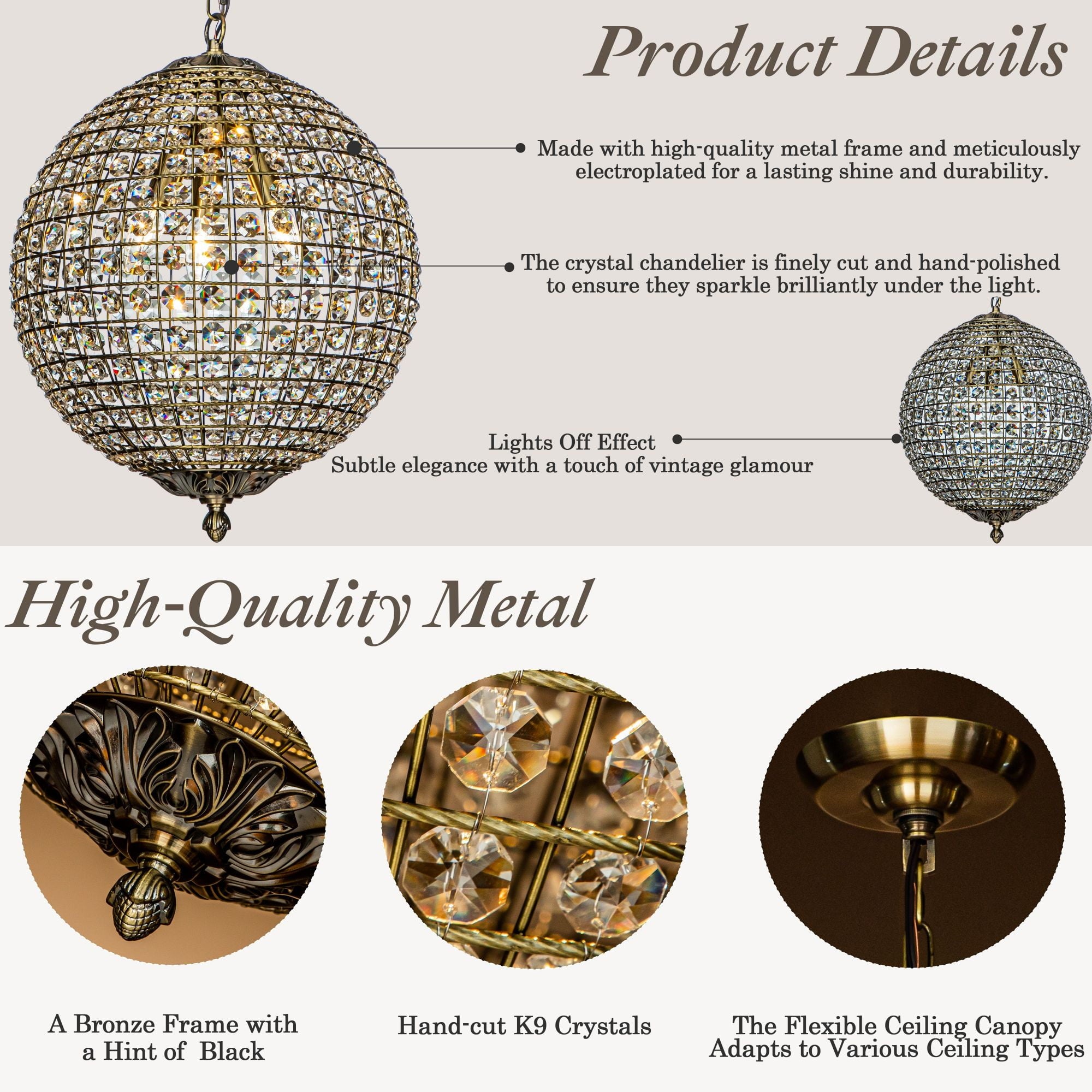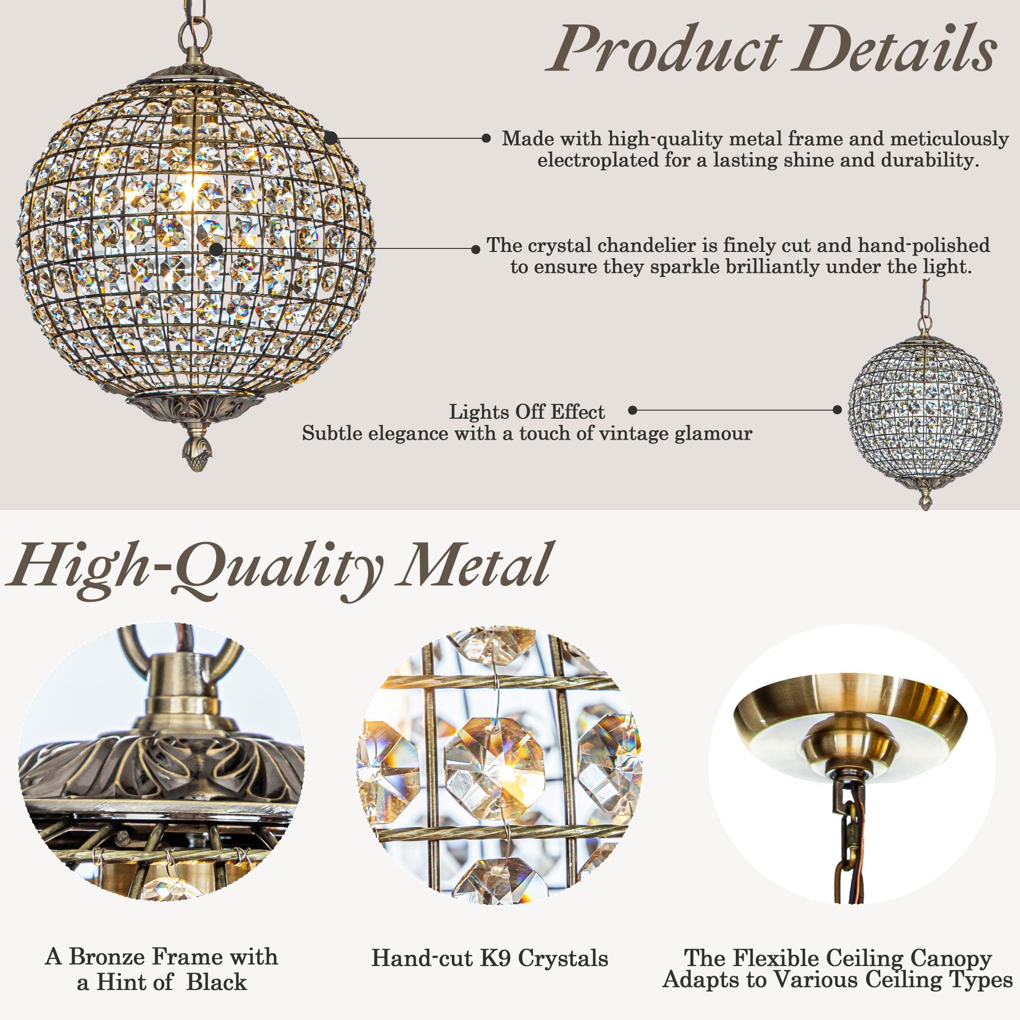 Decor your dining room with elegant scattered light from this crystal globe pendant. Brilliant-cut crystals sit between the lattices in the cage-style shade on this chandelier, delivering maximum refraction and reflection from the glow. Antique goldtone finishing on the strong metal framework adds an extra glam touch. The antique gold frame contrasts the crystals with delicate lattice work that your guests will love it. It only measures 12″ tall, so it can work in space-conscience homes. This fixture hangs from an adjustable chain and has a sloped ceiling-compatible canopy. This small chandelier is ideal for your foyer, living room, dining room, entryway, or studio, both residential and commercial spaces.