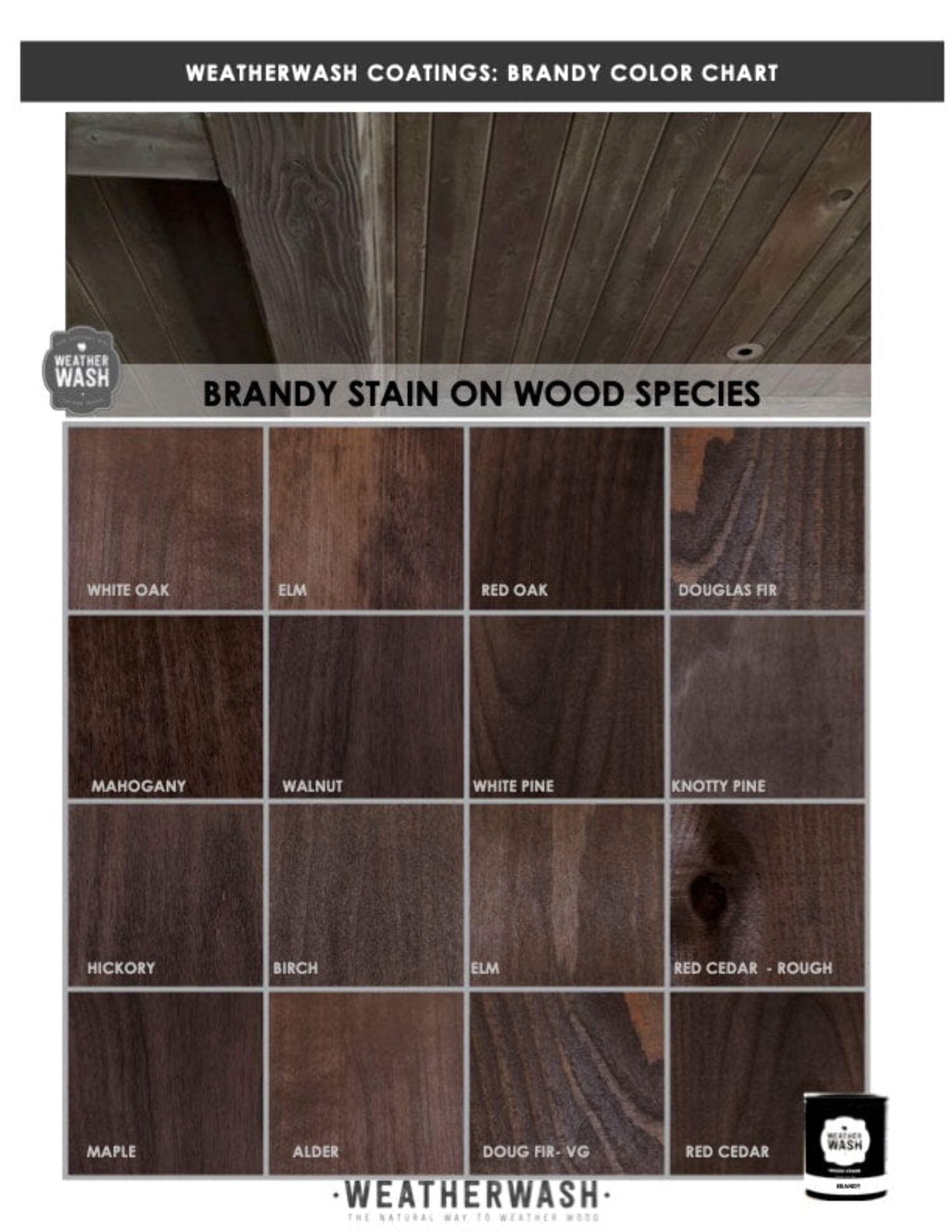 Weatherwash Brandy is a tannin reactive wood stain that oxidizes wood, just like nature! Brandy ages wood to a rich vintage brandy-wine color in just one-step. It’s suitable for wood surfaces, including floors, cabinetry, millwork and furniture! Driftwood is an interior stain, suitable for hardwoods, soft woods, veneers, pressure treated wood & reclaimed wood. Protect with wood and color with Weatherwash Varnish or Polyurethane topcoat. Color results vary based on wood species so check out the Weatherwash color charts!