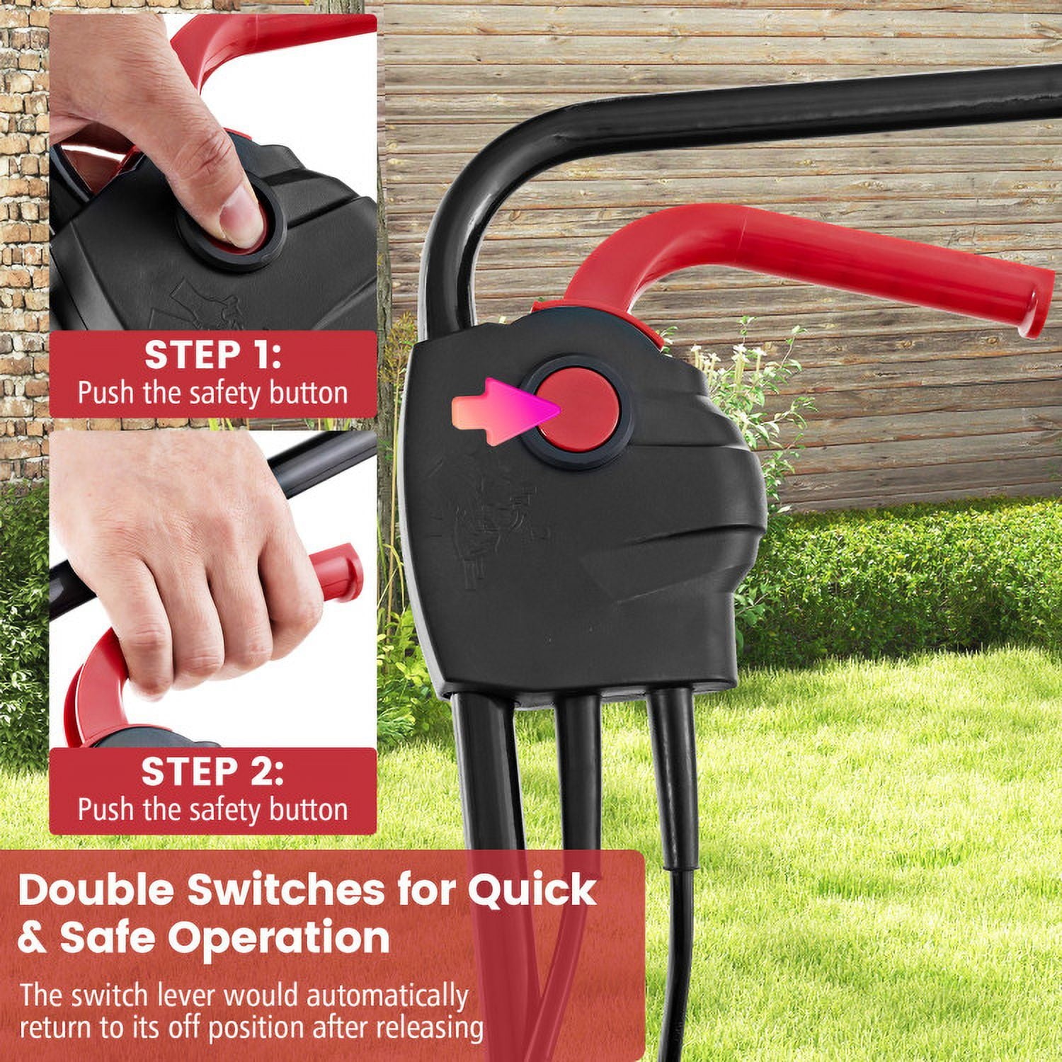 ● Double Guarantee of Security: Designed with a dual safety switch, this lawn mower features safe use with simple operation. Specifically, the machine can only be started when you press the safety button and pull the switch lever together. In addition, the self locking function can cut down the power to prevent over heating.