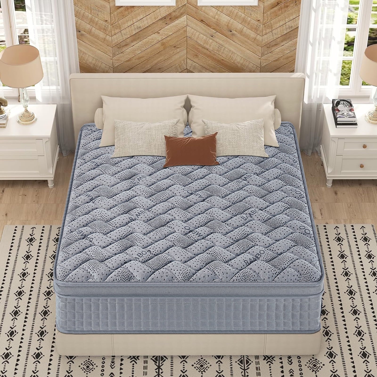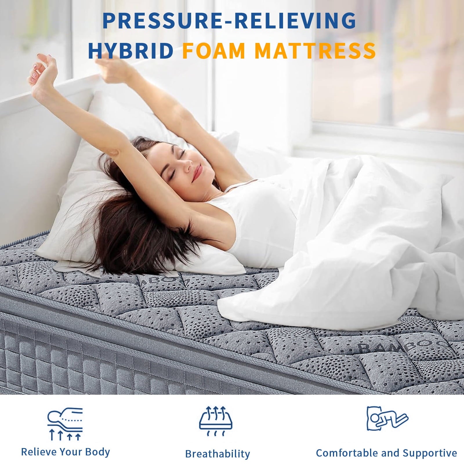 This 10-inch and 12-inch medium-firm hybrid mattress, head-to-toe support.It caters to various sleeping preferences with its balanced combination of firmness and cushioning. Enjoy a quiet, undisturbed sleep with this hybrid memory foam mattress!