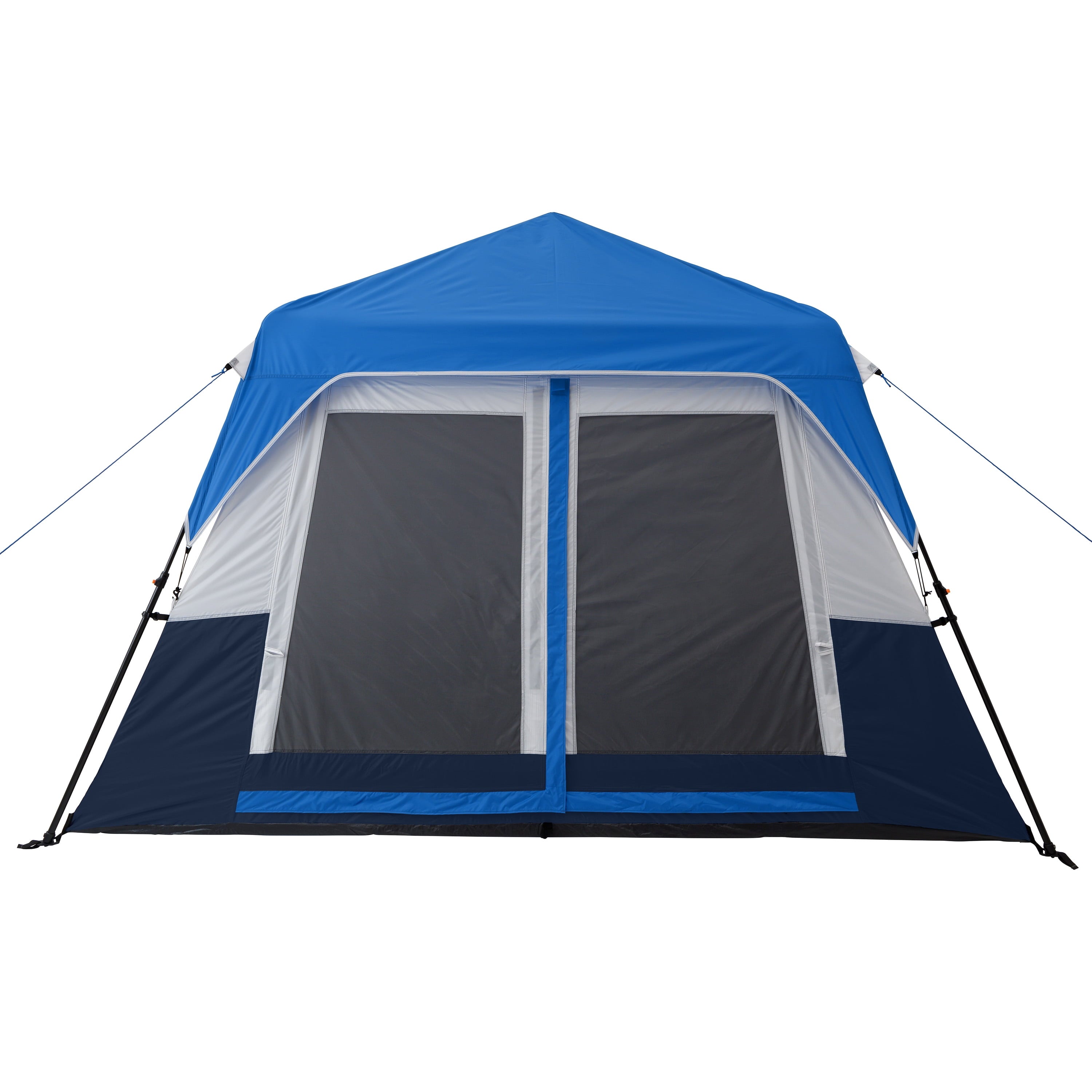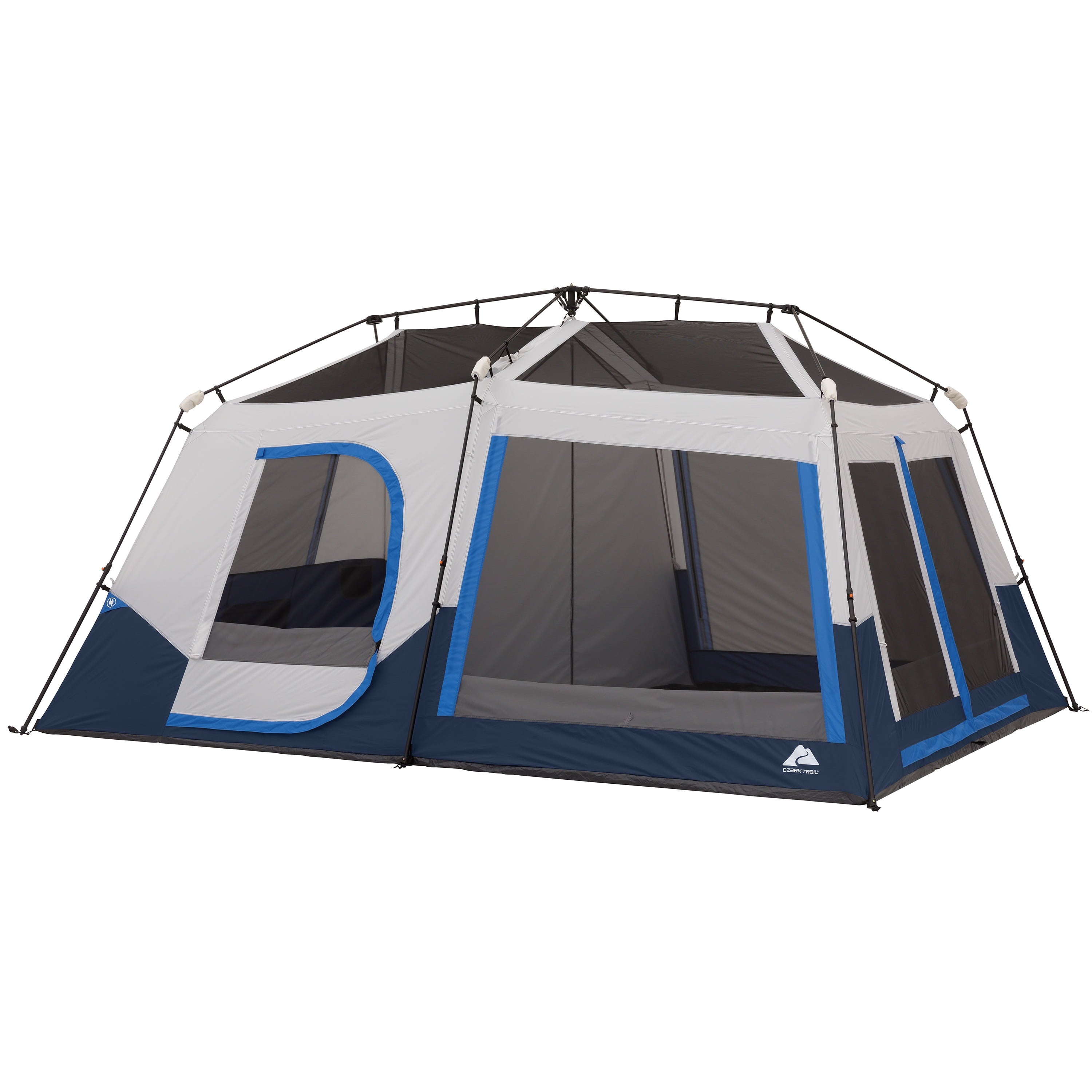 Step up your next outdoor adventure with the Ozark Trail 10-Person Instant Cabin Tent. This spacious two-room cabin-style tent requires no assembly because the poles are pre-attached to the tent, so all you need to do is unpack, unfold, and extend. This tent features seven large mesh windows and one for improved air circulation throughout the tent. This tent comfortably fits two queen airbeds or up to. Keep yourself organized and connected with the included and electrical cord access. The ambient LED-lighted poles allow for amazing light throughout the tent and can be adjusted with the settings. This tent features an anti-snag door zipper, no-see-um mesh, and 1200mm water. This Ozark Trail 10-Person Instant Cabin Tent is perfect for your next family camping adventure.