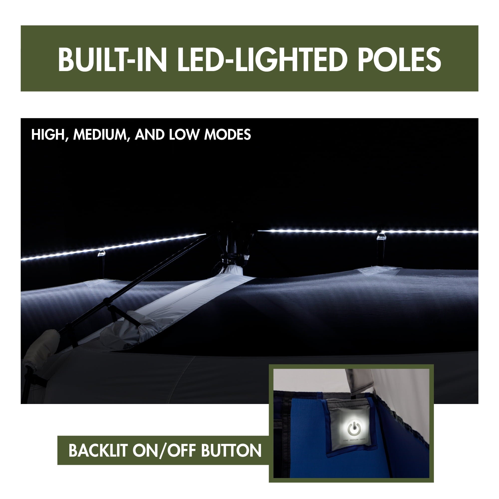 • Built-in LED lighted poles with low, medium, and high-power settings