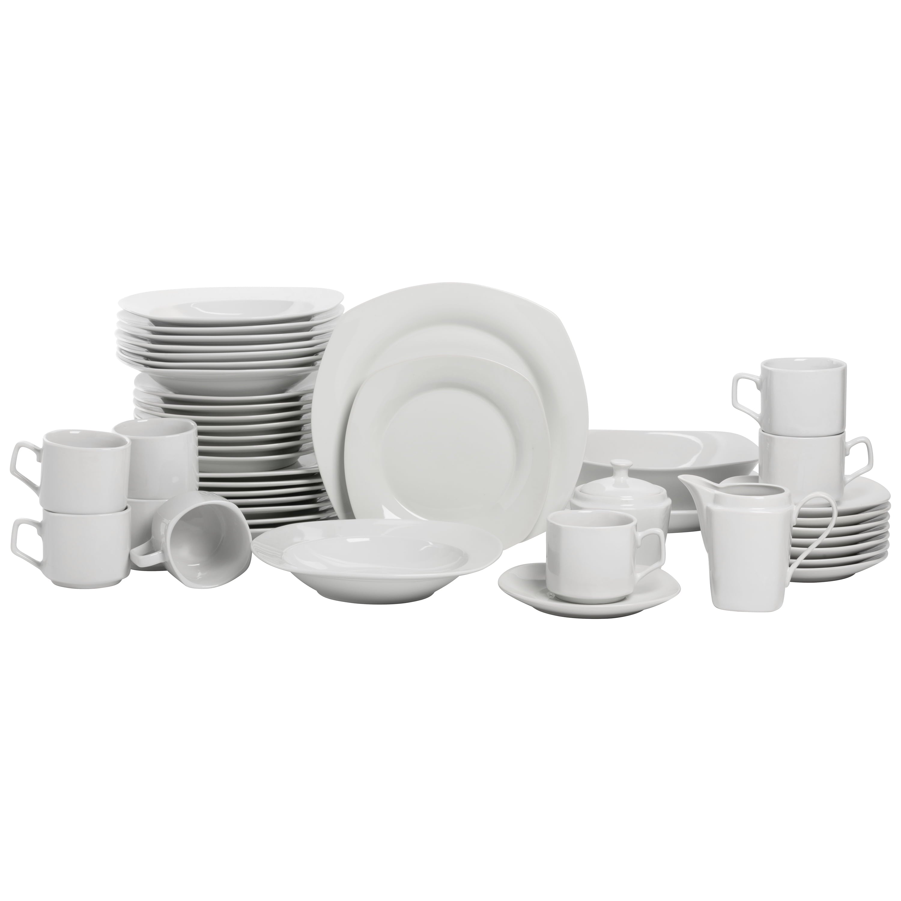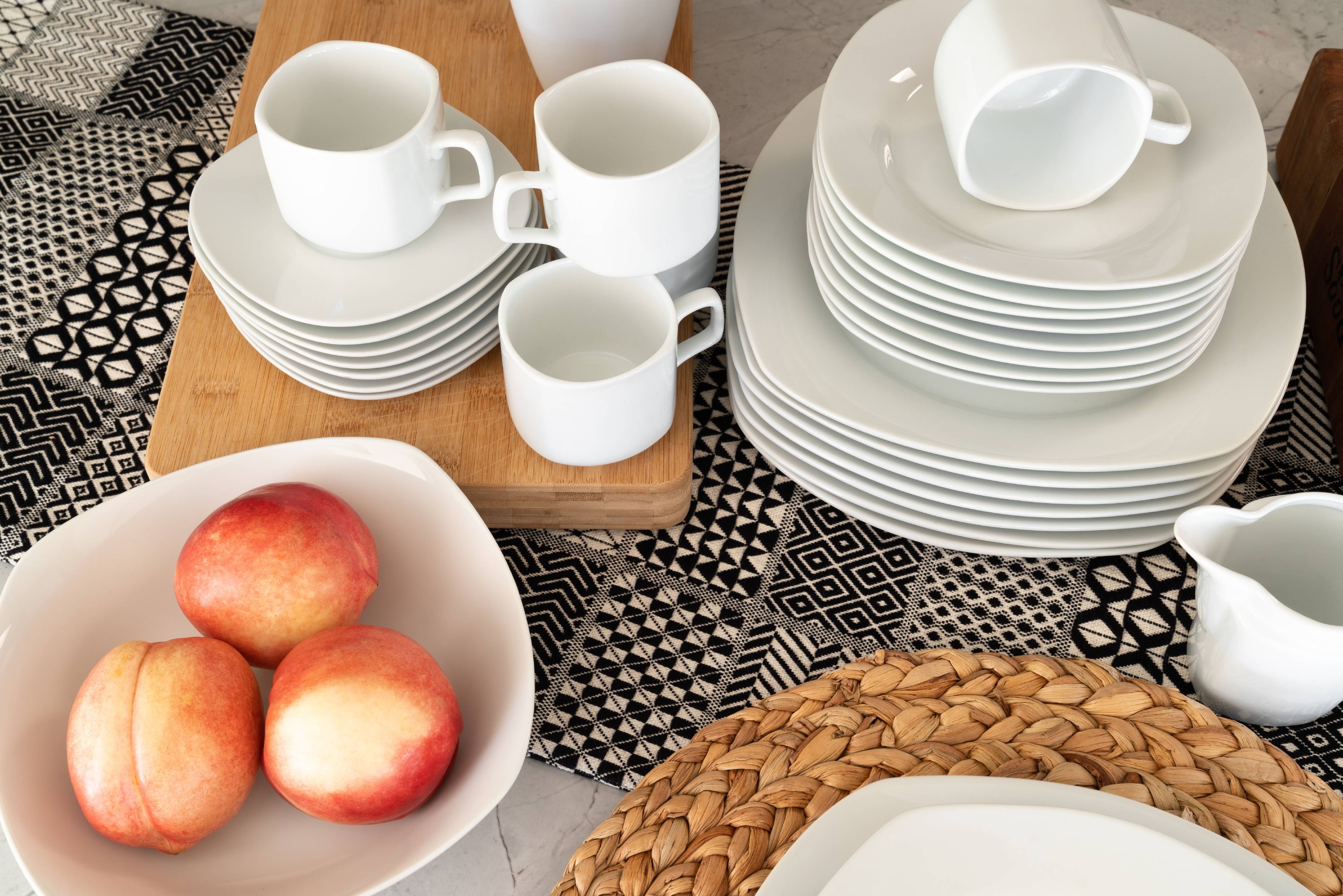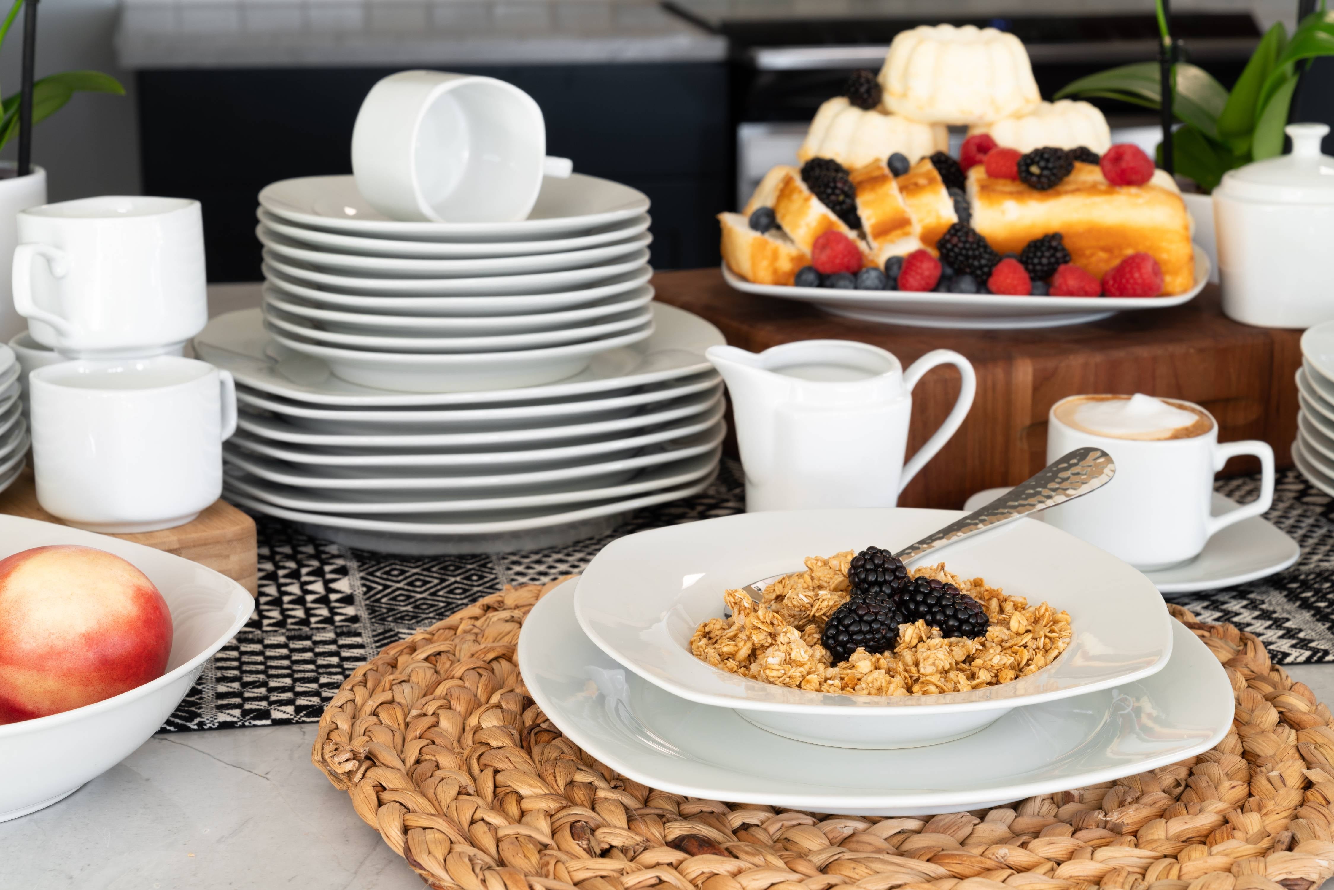 Classic, clean, and durable, this simply square collection is the perfect every day dinnerware set. Made with oven-to-table, microwave, and dishwasher safe porcelain these dishes will be your go-to for breakfast, lunch, dinner, and snacks in between. Service for 8 plus matching serving and accessory pieces makes for a perfect cupboard refresh, housewarming gift, or entertaining set.