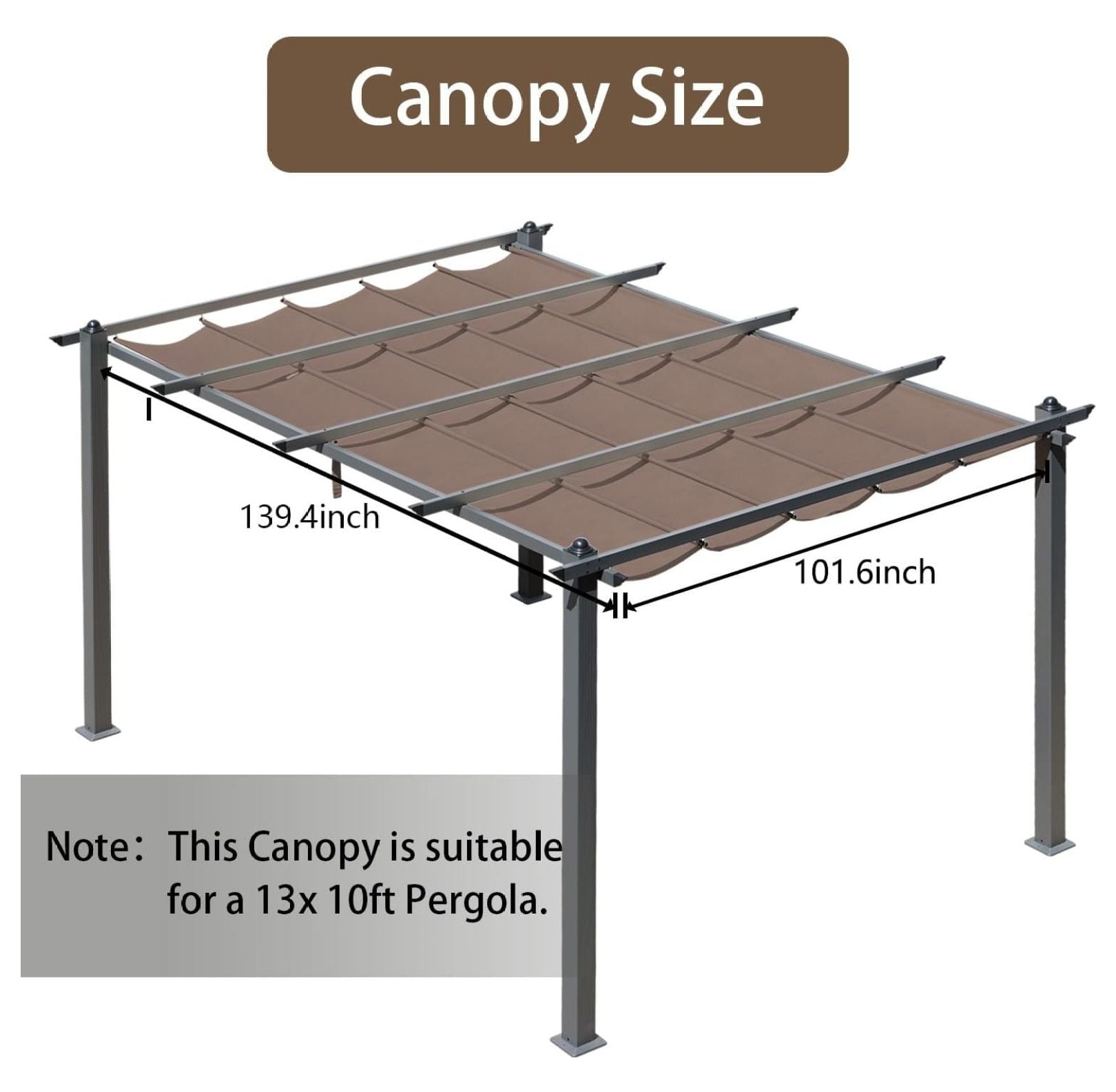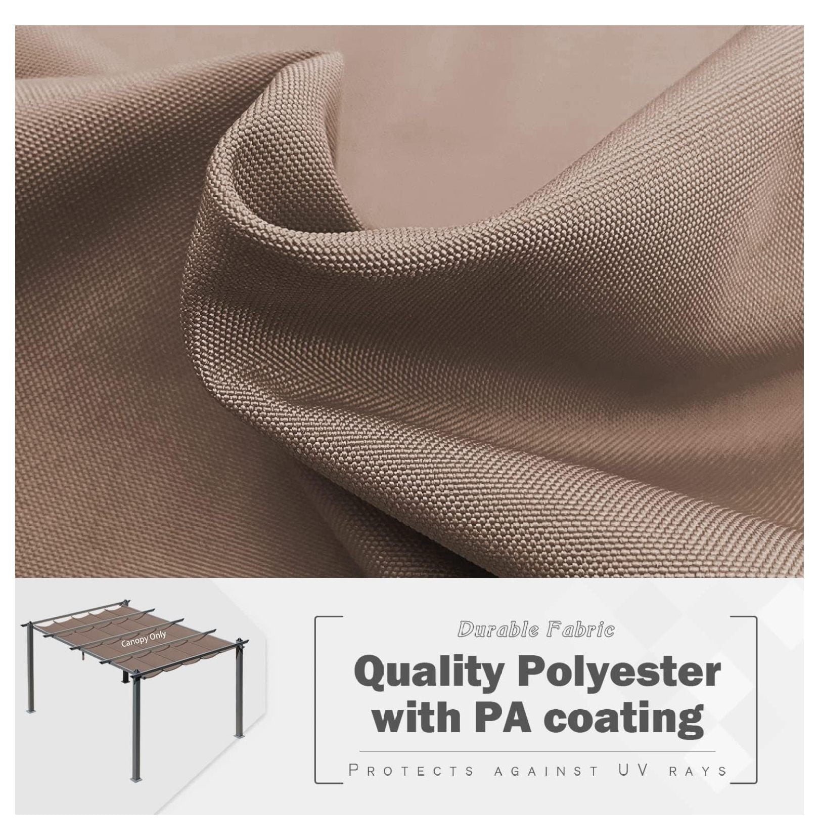 - Fabric Dimension: Unfolding to a generous 8.46 x 11.61 ft, the canopy is suitable for most 10 x 13 ft pergolas. Before making a purchase, measure the interior dimensions of your pergola to ensure a
