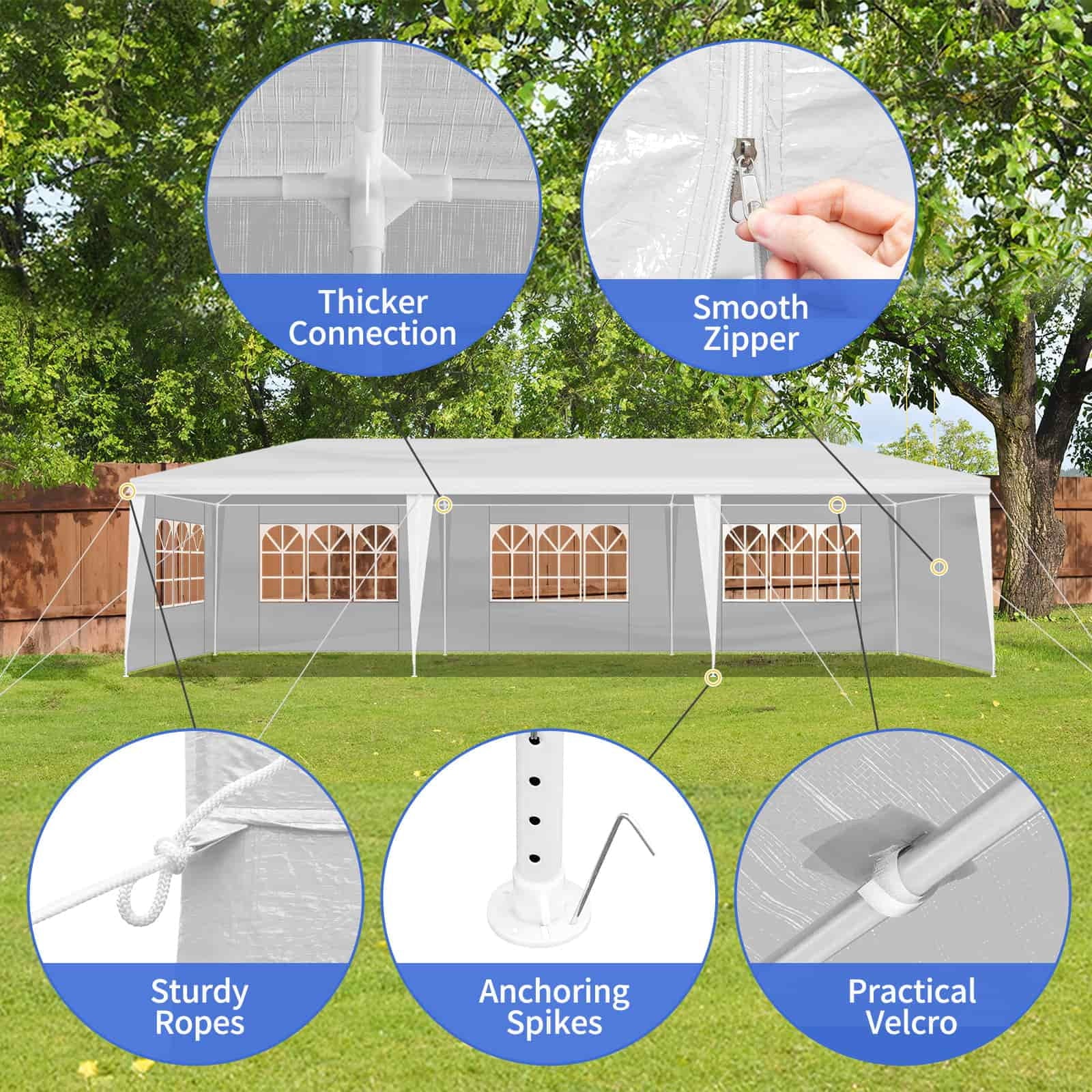 • 【Big and spacious】10’X30′ (3m*9m) outdoor party tent can hold up to 50 people, making it a wonderful choice for a variety of outdoor events like party, wedding, graduation, flea market, small business, picnics, sporting events, arts and crafts tables and much more.