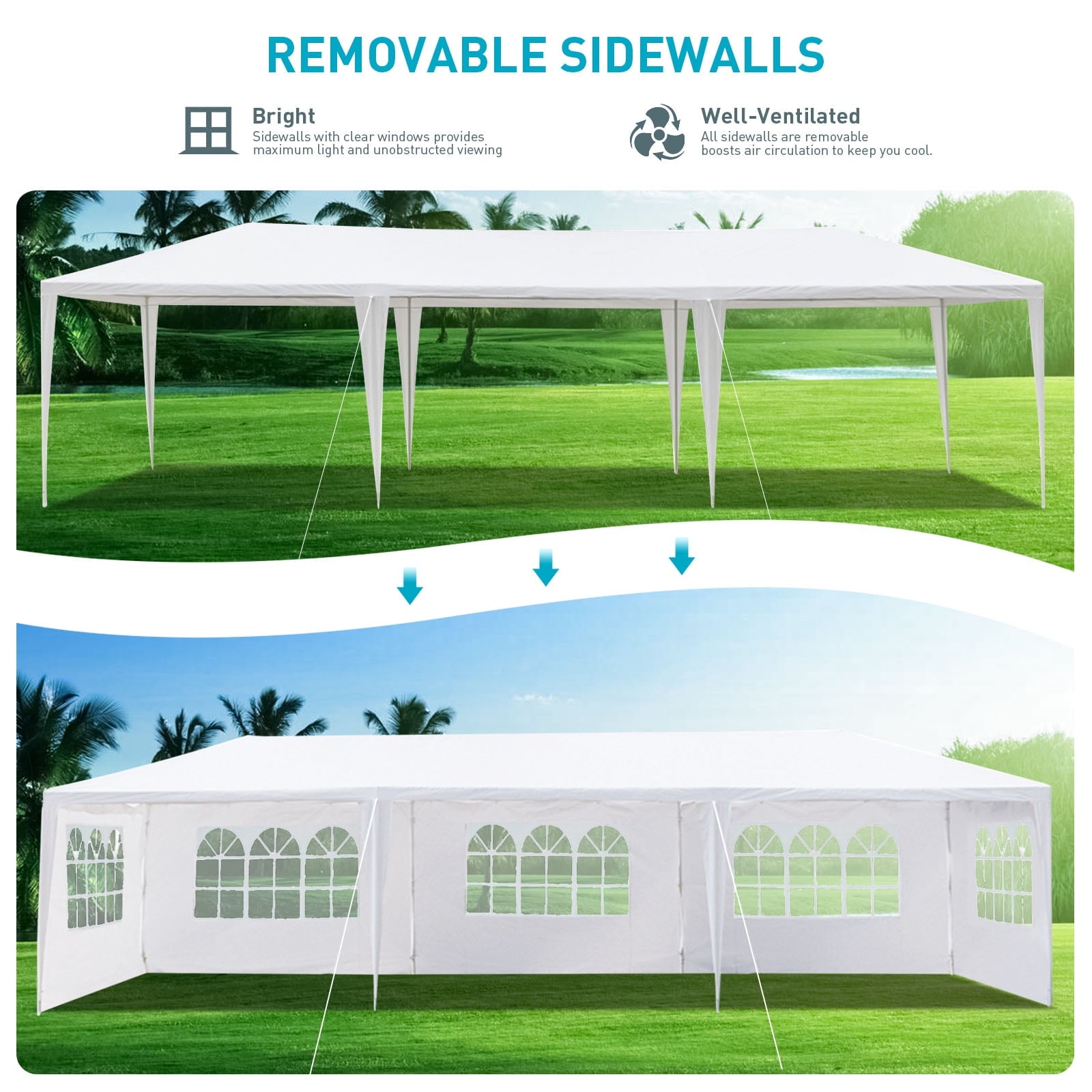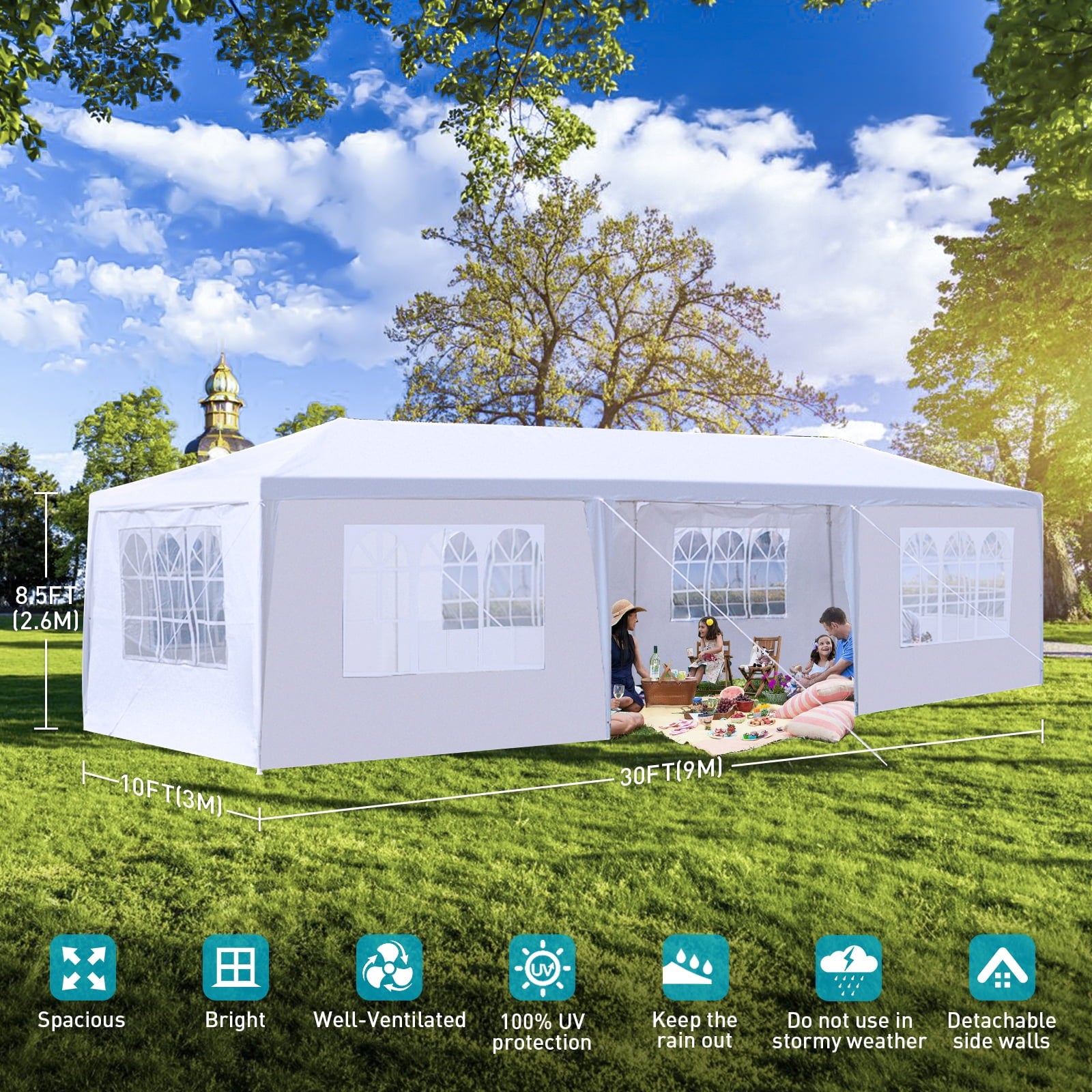 1.【Big and spacious】10’X30′ (3m*9m) outdoor party tent can hold up to 50 people, making it a wonderful choice for a variety of outdoor events like party, wedding, graduation, flea market, small business, picnics, sporting events, arts and crafts tables and much more