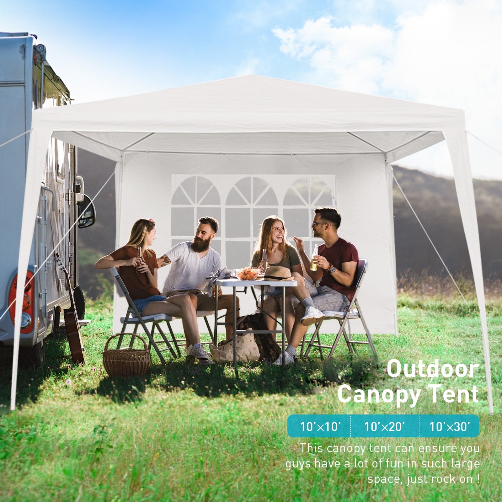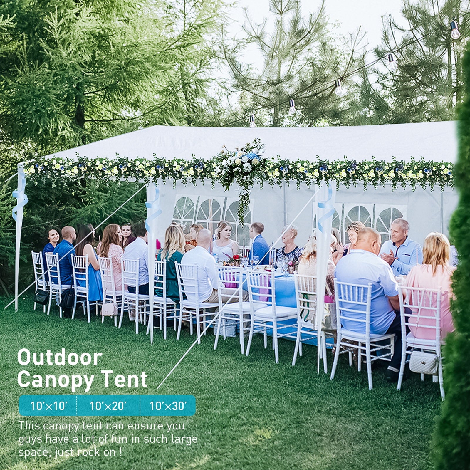 • ⛺ EXTRA LARGE SPACE: The 10’x30′ outdoor party tent is spacious enough to accommodate approximately 30-50 people or place 3 85×70 inch tables and 35 chairs for dining or party purposes. Therefore, it can be used as a garden wedding tent, outdoor event tent, and birthday party tent. You can also use it for backyard barbecues with your friends. Additionally, the outdoor gazebo tent is an excellent choice for baby showers