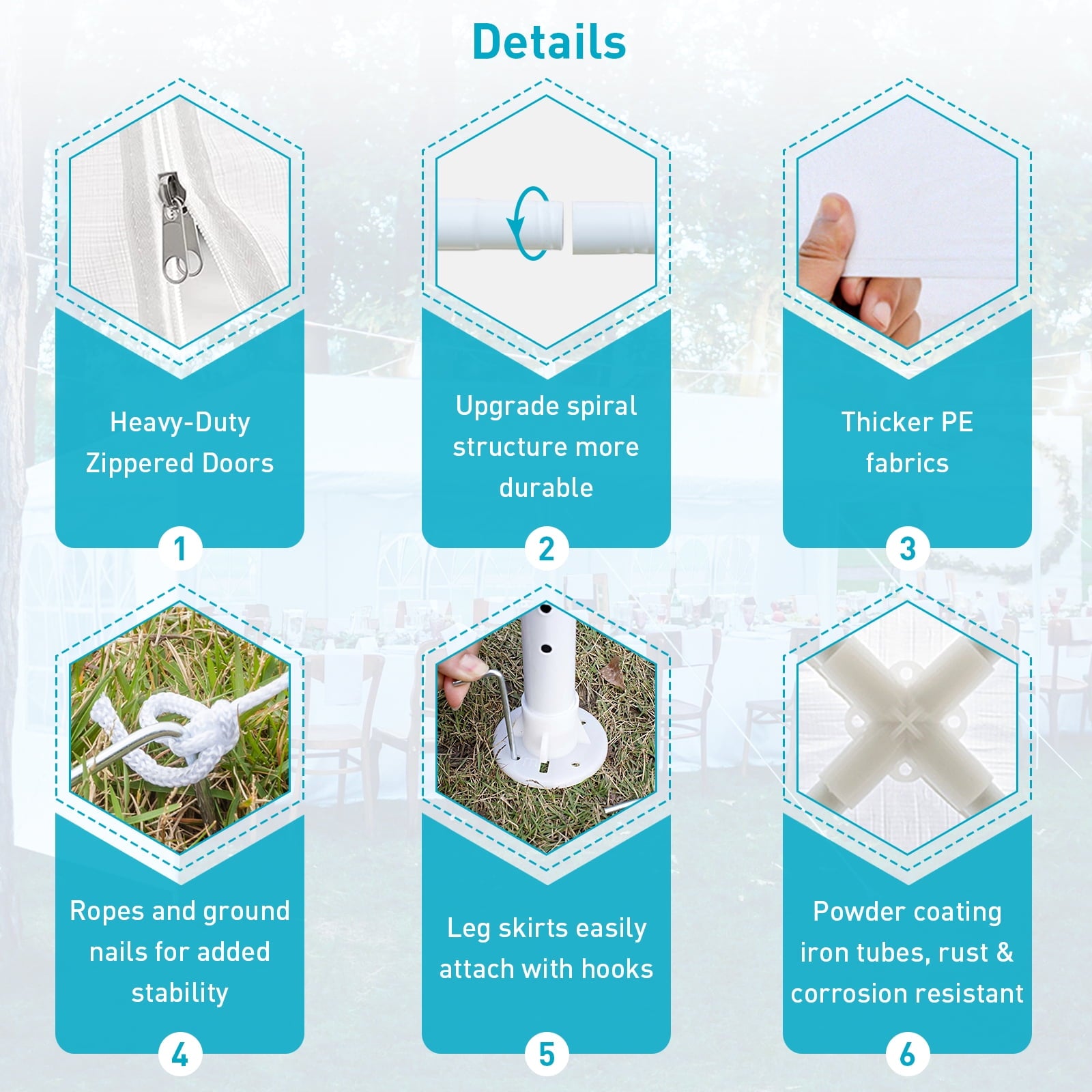 3.【Upgraded pipe connection for better stability】Our event tent uses threaded pipe connection to offer stronger support. Also come with ropes and ground stakes for keeping your tent firmly