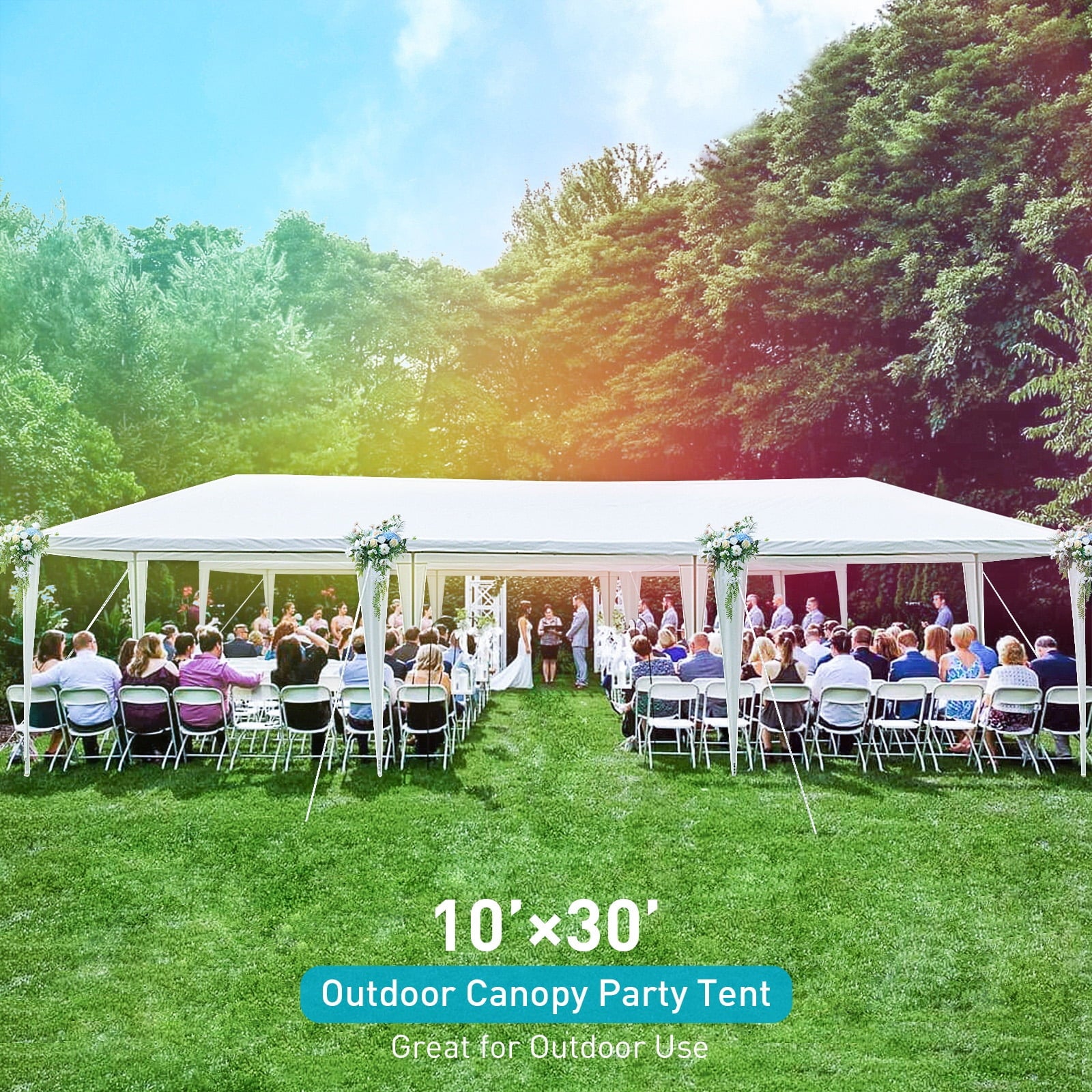 Complete your party with this spacious and versatile Outdoor Party Tent! It is definitely a must-have for a party in your backyard or for a commercial event outdoors. Our 10×30 tents for parties offers shelter from the sun rays and light rain, so as to provide the perfect space for serving food and drink. And the tent is a wonderful choice to add party atmosphere that will put all of your guests in the mood to celebrate