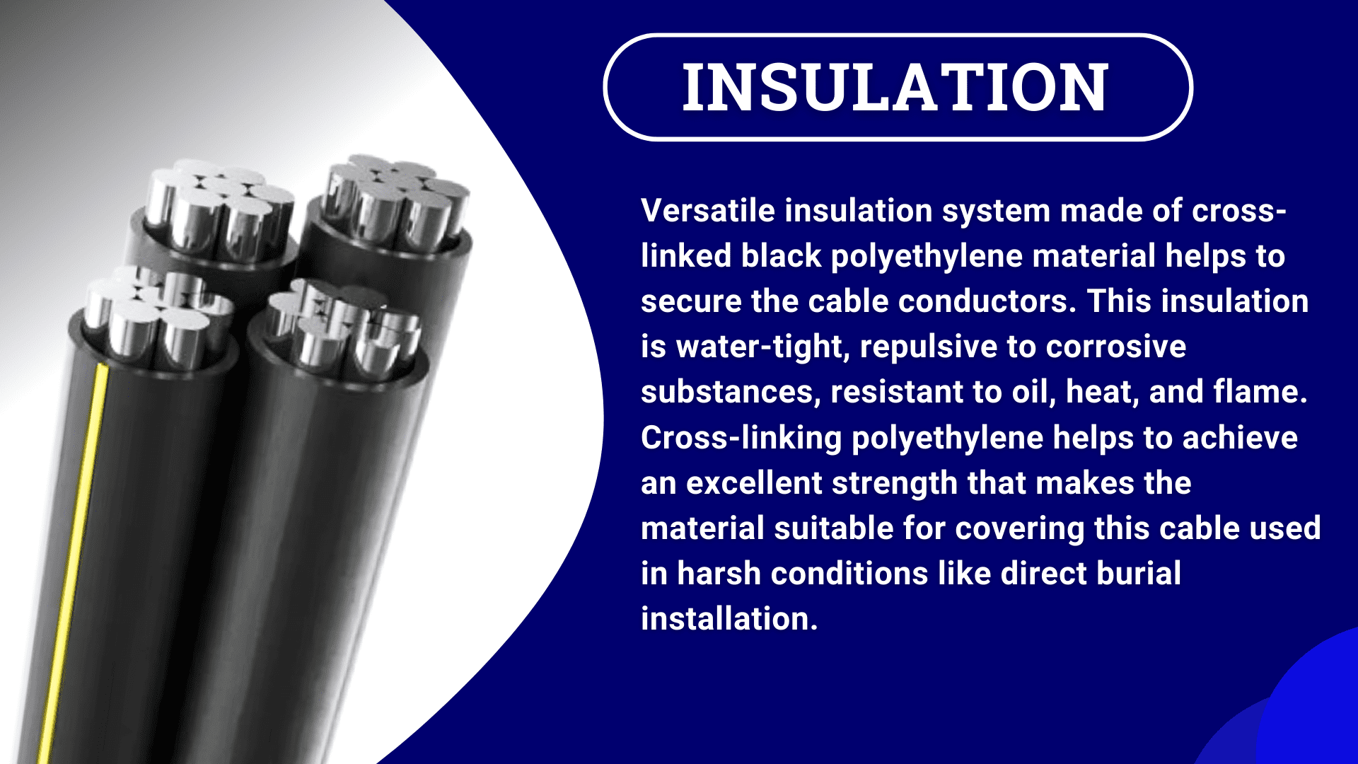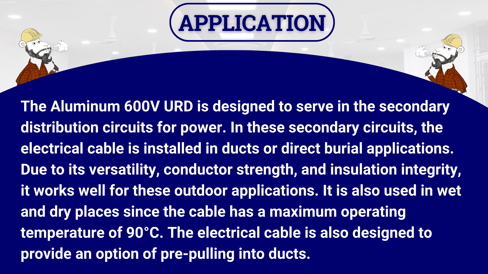 The Aluminum 600V URD is designed to serve in the secondary distribution circuits for power. In these secondary circuits, the electrical cable is installed in ducts or direct burial applications. Due to its versatility, conductor strength, and insulation integrity, it works well for these outdoor applications. It is also used in wet and dry places since the cable has a maximum operating temperature of 90°C. The electrical cable is also designed to provide an option of pre-pulling into ducts.
