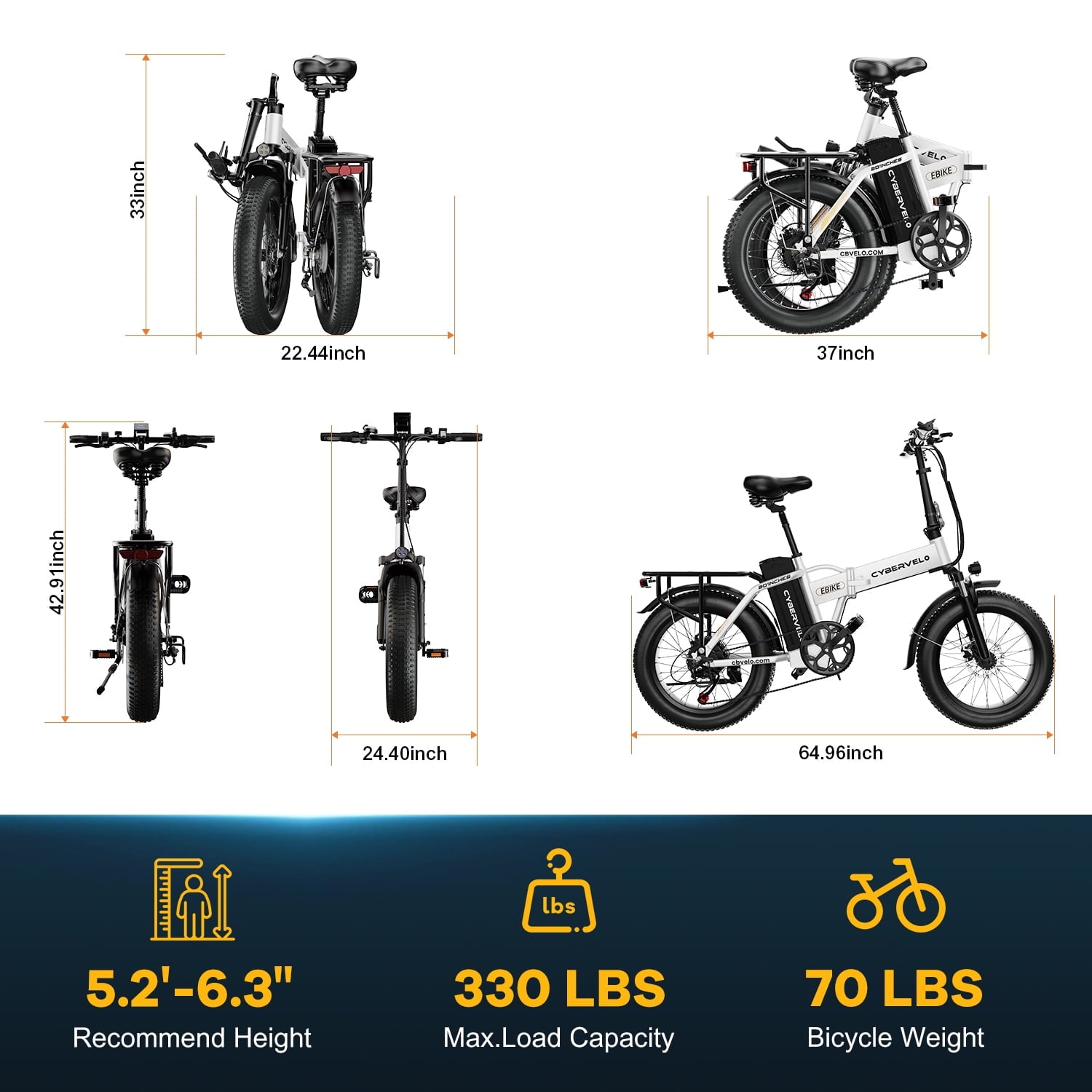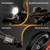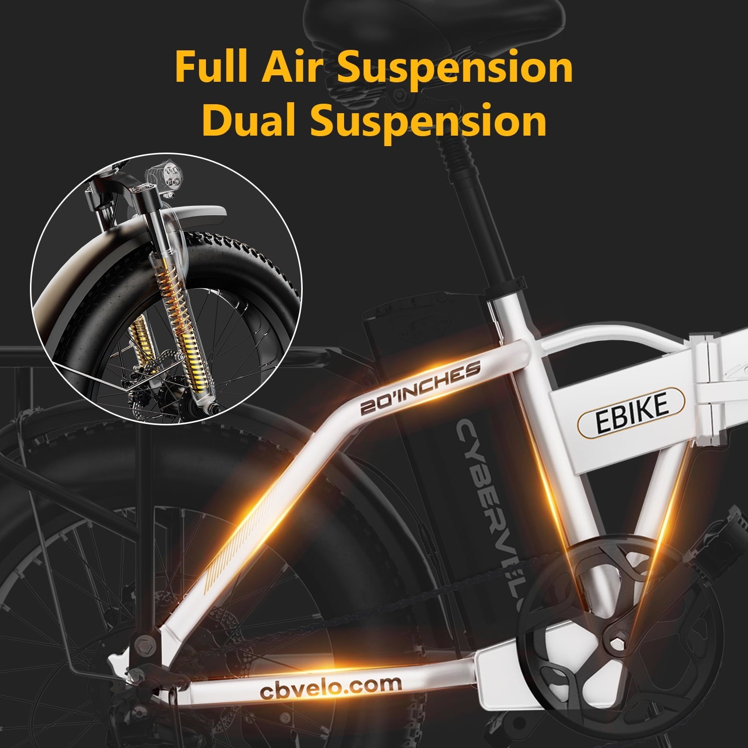 Braking & Shock Absorption: Make sure the safe and comfortable. The 20″ fat tires are anti-slip and puncture-proof, ensuring you can ride on roads, snow, beaches, and rugged mountain roads. Cybervelo electric bike adopts front and rear double disc brakes and EABS power-off brake for sensitive braking, which can make sure strong off-road performance, reliable braking force and high safety factor. The high-strength shock-absorbing front fork and seatpost absorb the bumps of long, rough roads
