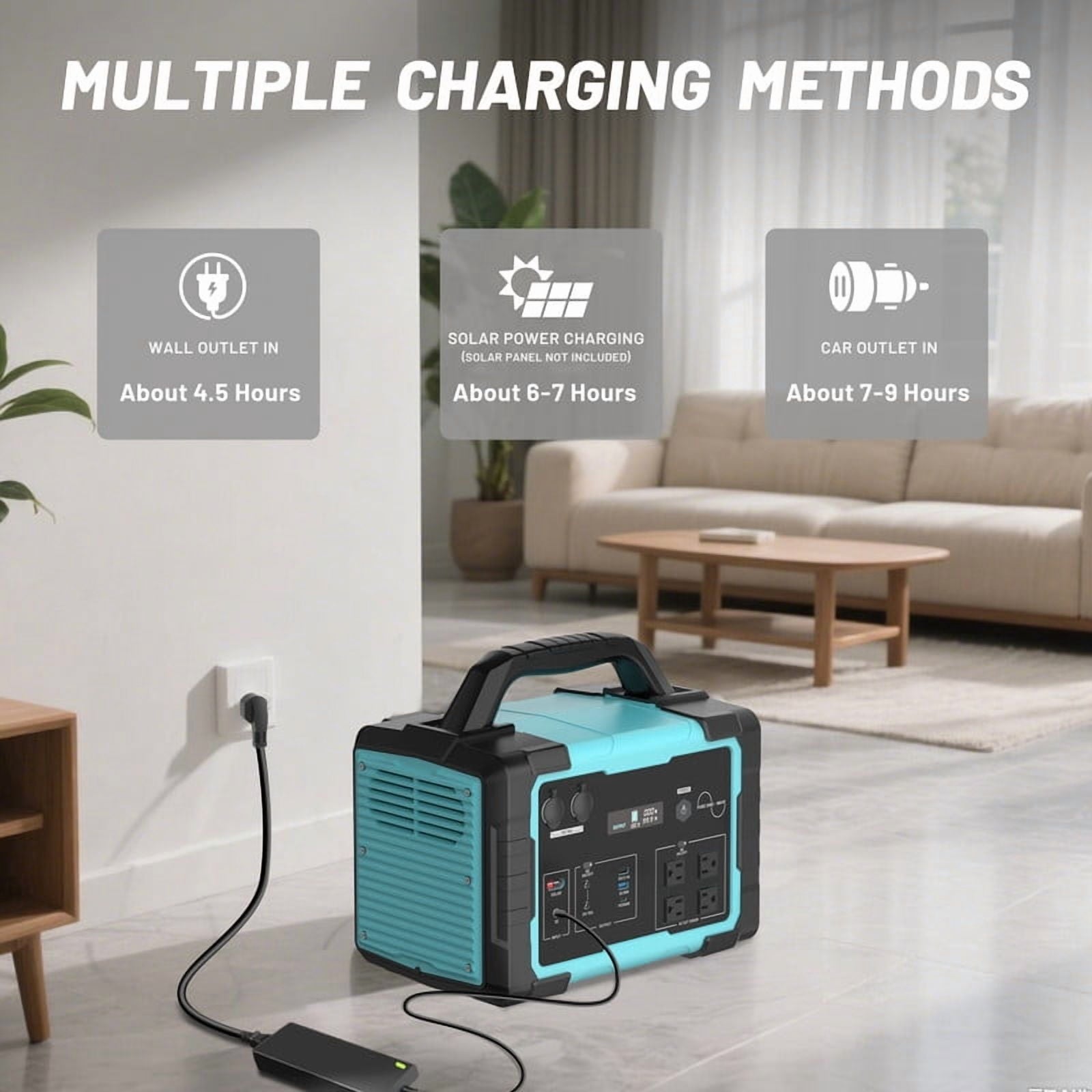 Recharge the portable power station 1000Wh via wall outlet, car charger, or solar panel for endless flexibility.