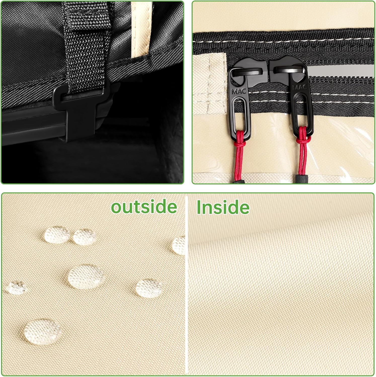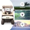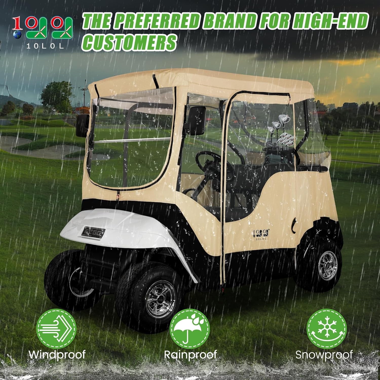 10L0L golf cart cover designed for most 2-Person EZGO TXT RXV golf cart. As long as your golf cart roof is 58in in length, 40in in width and 57in in height. Use the high quantity material polyester, tear-resistant and UV-resistant. With PU water-proof layer inside to enhance the overall water-resistant. The golf cart enclosure cover protection against all weather situation and keeps golf carts clean and dry in storage. Clear PVC windows provides you the best visibility. This portable golf cart enclosures 2 passenger with a zippered side opening which ensures easy in and out, the side door can be zippered both inside and outside. Roll-up doors can be easily fixed by magic tape. Two hooks at the bottom, you do not have to worry about bad weather(dust, rain, snow, sun, water) damage to your car when you outdoor activities.