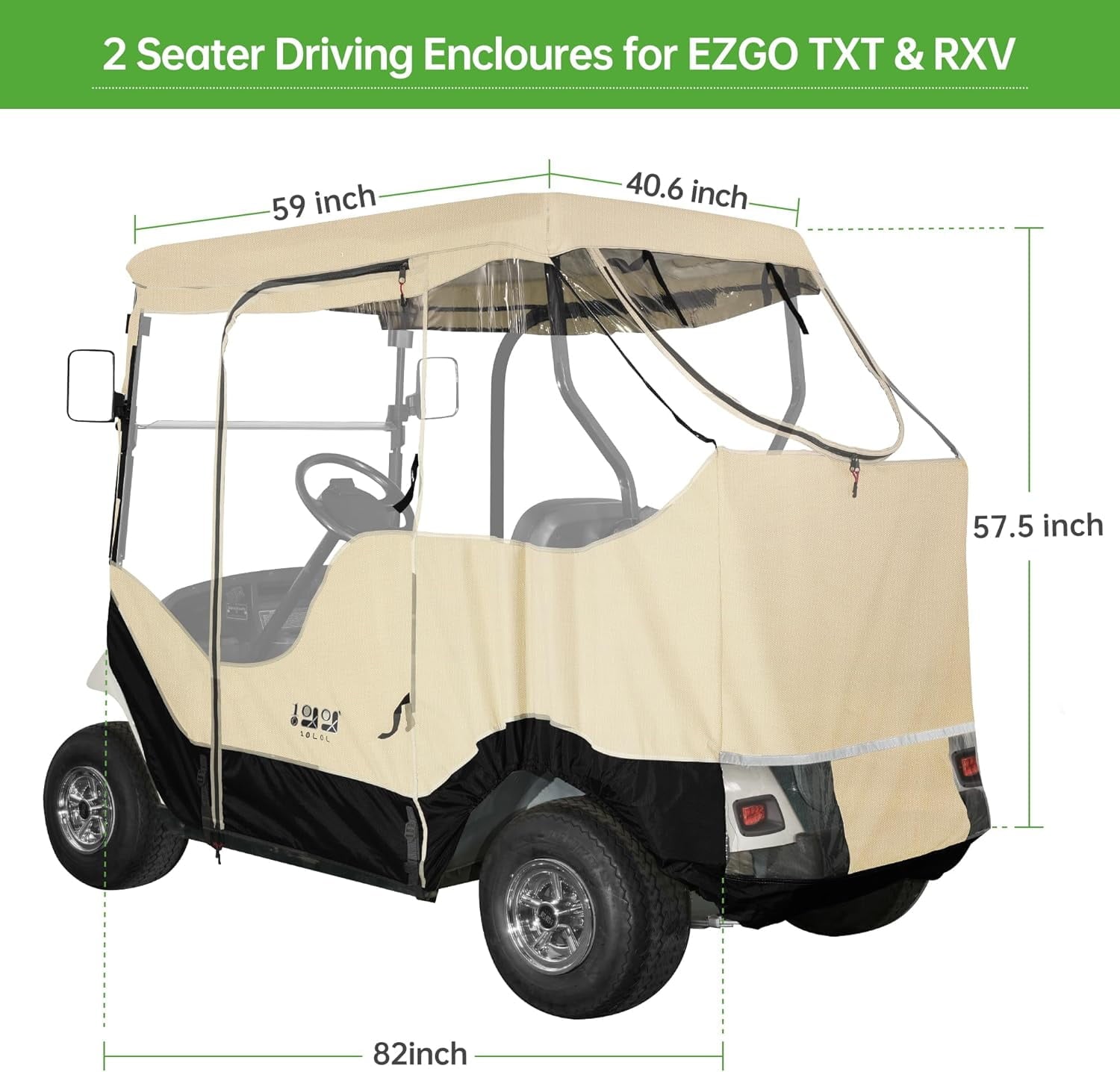 - 2 passenger golf cart enclosure size:58L x 40W x57H inch. Universal cover fits for EZGO TXT RXV 2-person golf cart