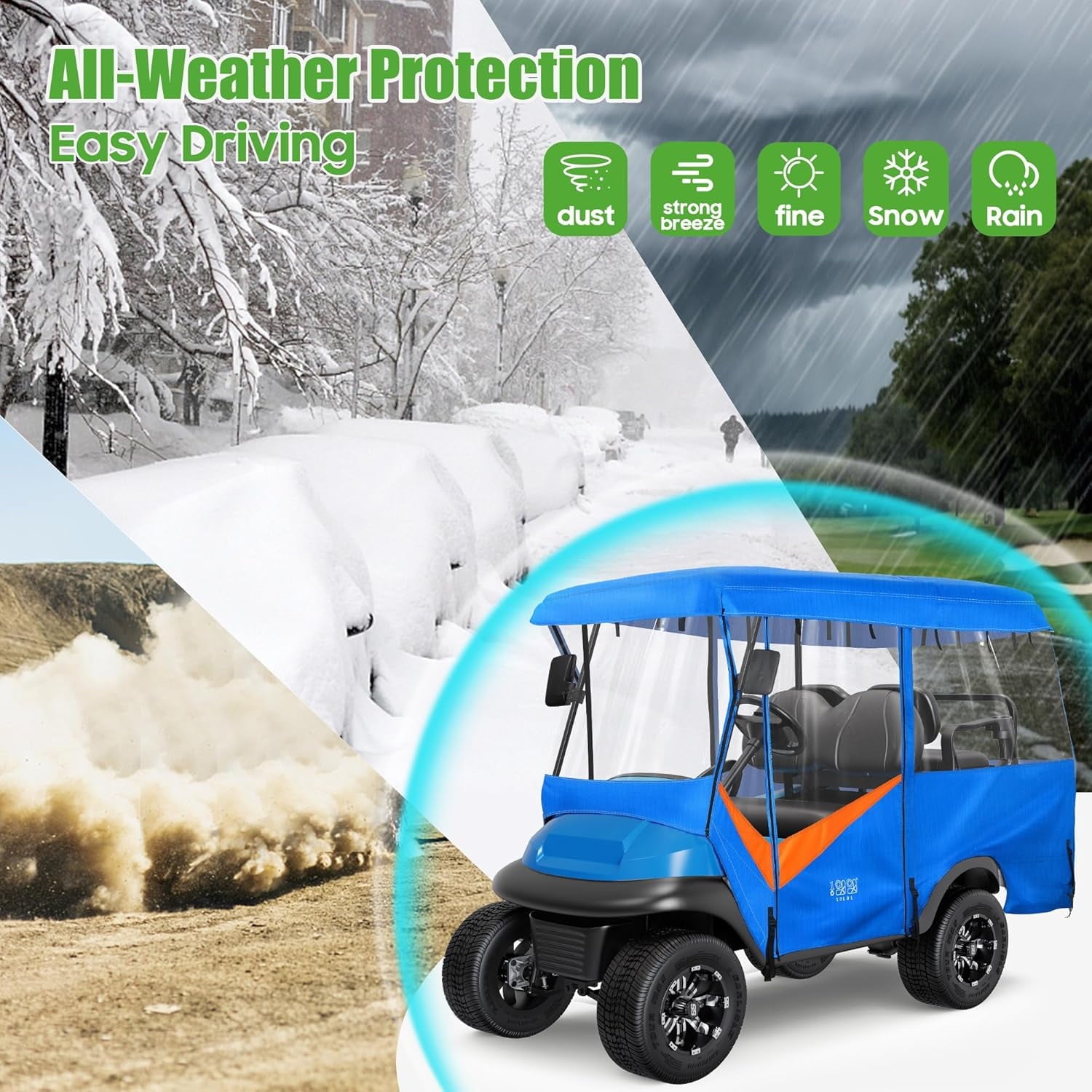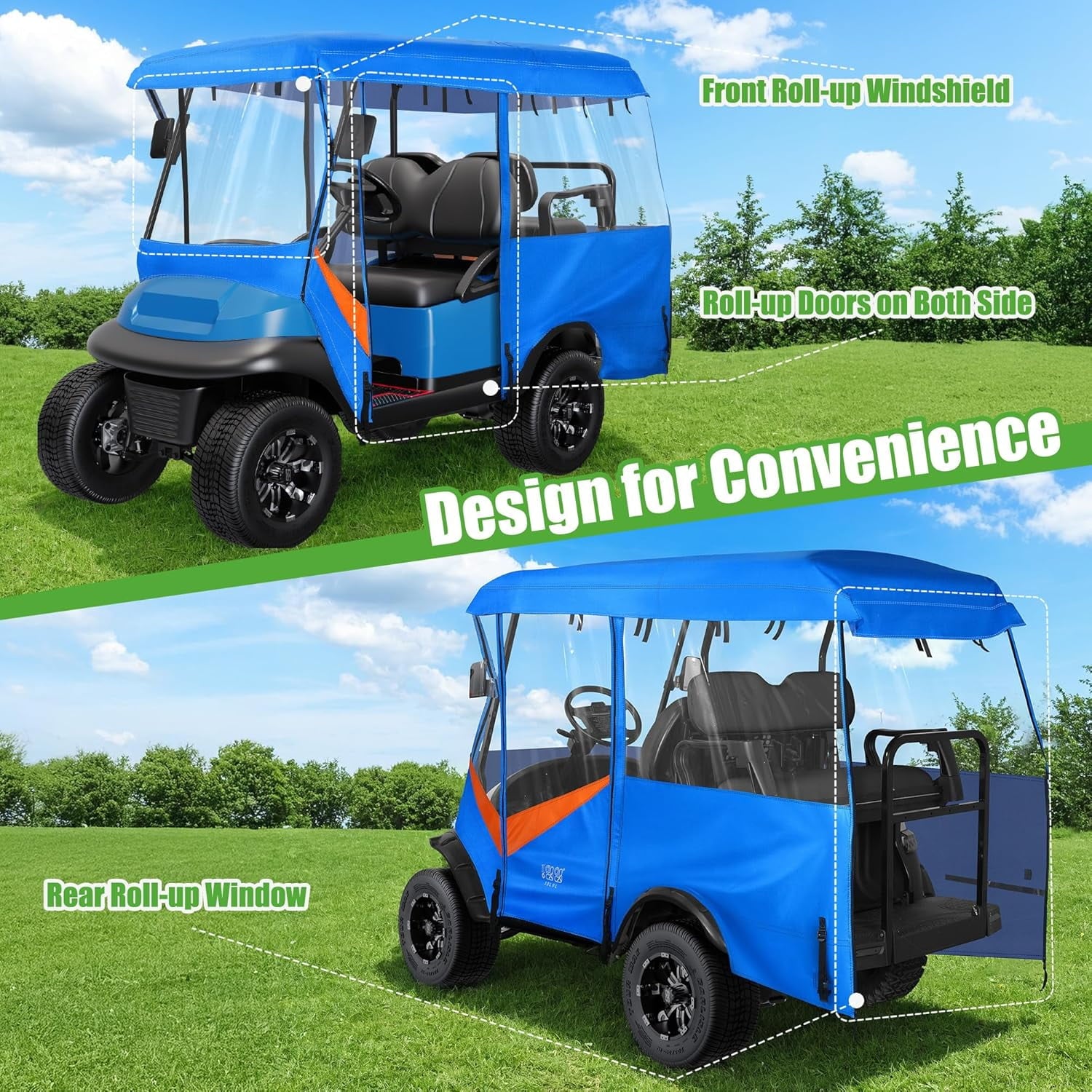 - The golf cart enclosure is designed for 4 person golf carts cover with 86-inch roof, Universal for Yamaha, EZGO, and Club Car golf cart.