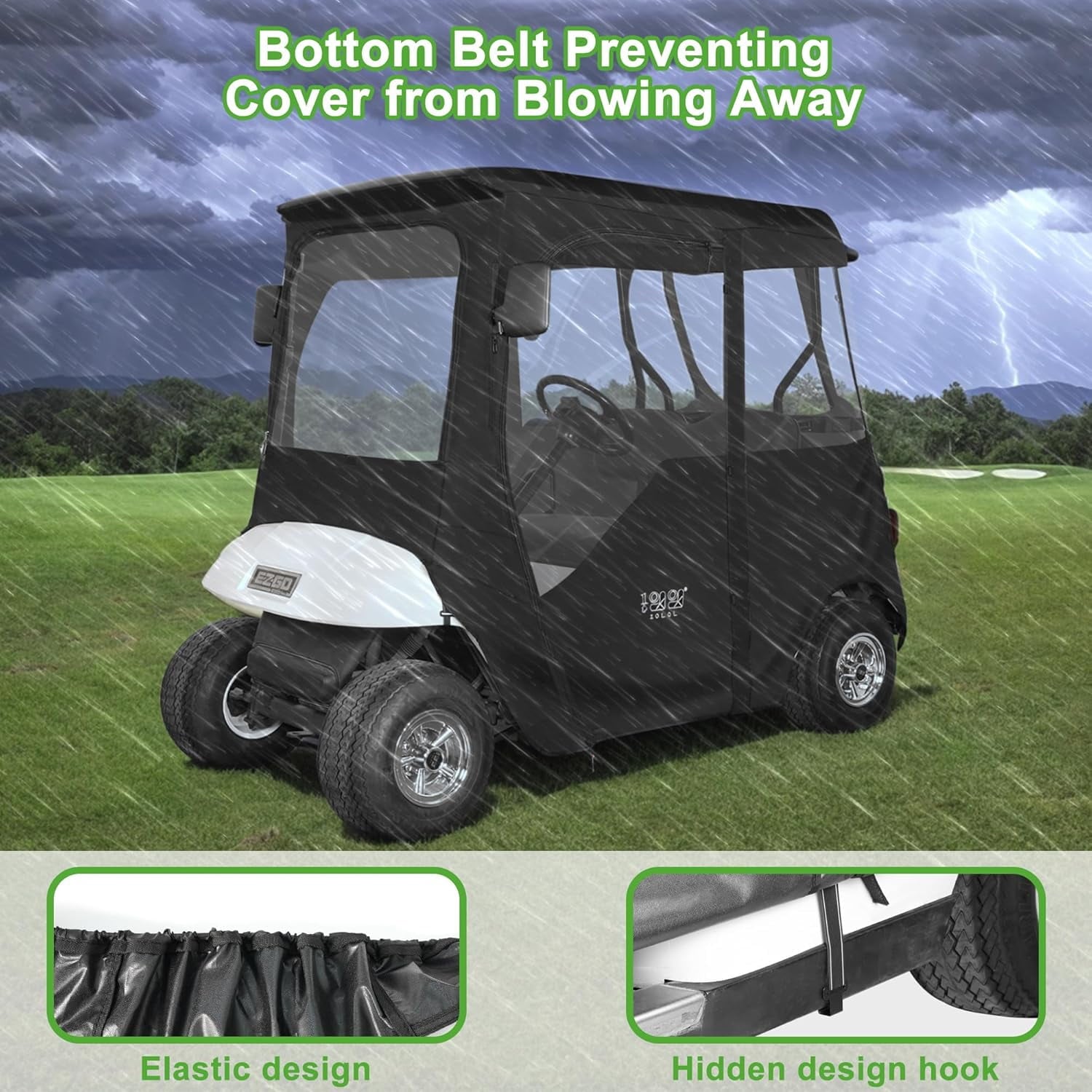 - Installs in minutes without tools, just fit the enclosure cover over cart roof, and roll down the sides, the bottom hooks to help you fix your cart tightly, ensure extra-secure placement, even on windy days