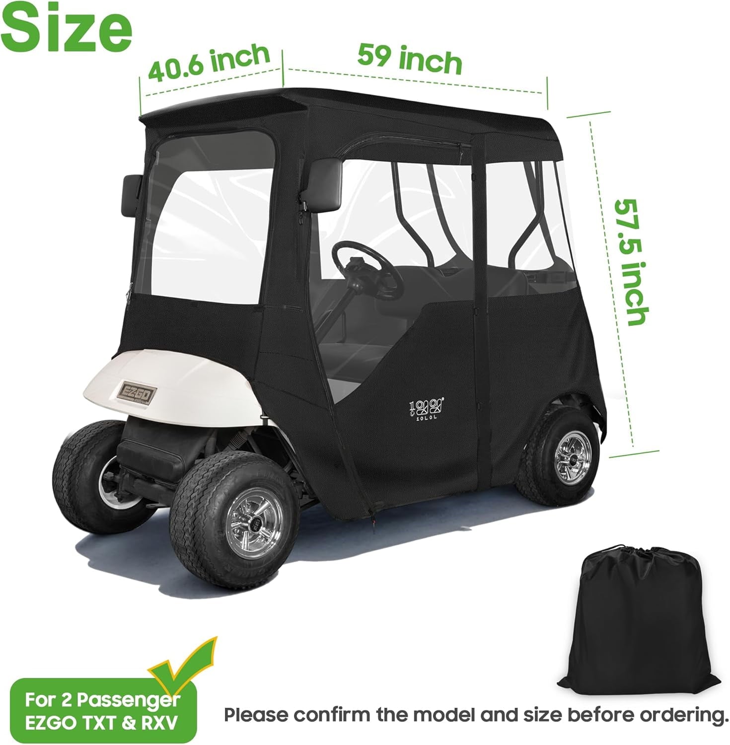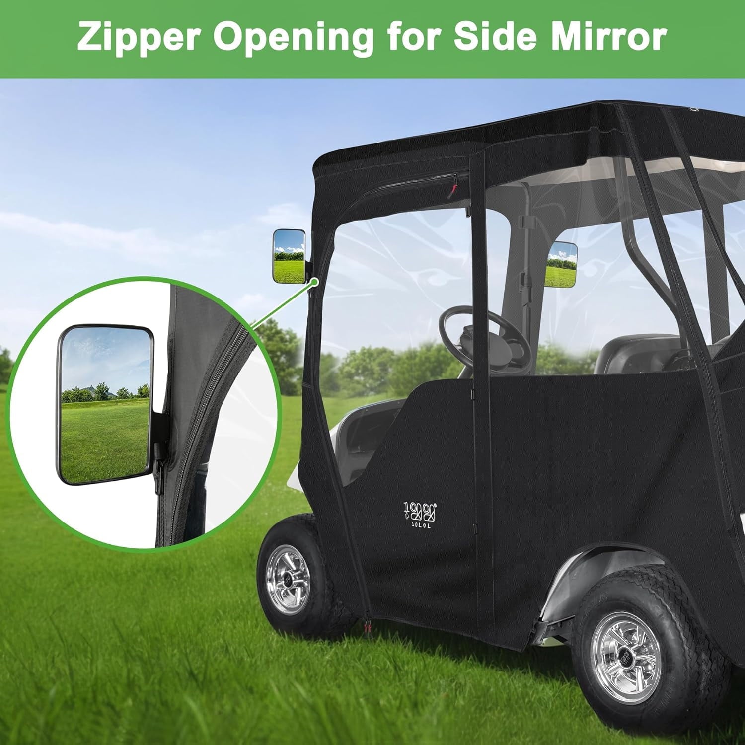 10L0L Deluxe golf cart enclosure fit for EZGO TXT 2 passenger golf cart, not fits 2+2 or extended roof cart. This black golf cart enclosure size 59” length * 39.5″width* 57″ height. This EZGO TXT golf cart enclosure made of heavy-duty polyester, can be used as long-term outdoor storage golf cart cover, full protection windproof rainproof. This Golf Cart Deluxe Driving Enclosure have a reserve place for the side view mirror. Let you have safety while having comfort.