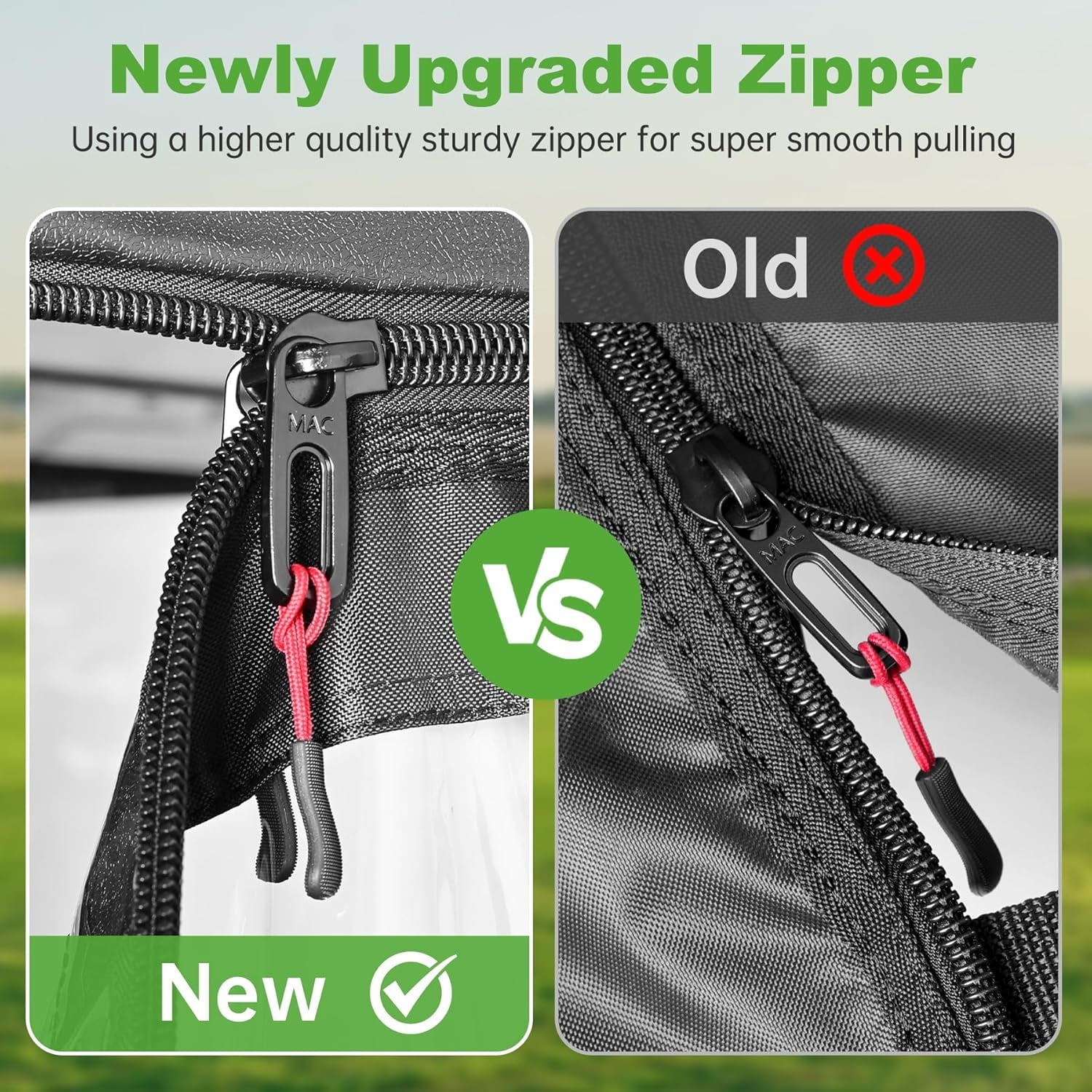 - 4-side clear PVC windows keeps a good visibility, patented design front side zipper opening can extend out the side mirrors and visible of rear lights zone, good for driving safety and meet the street legal requirements