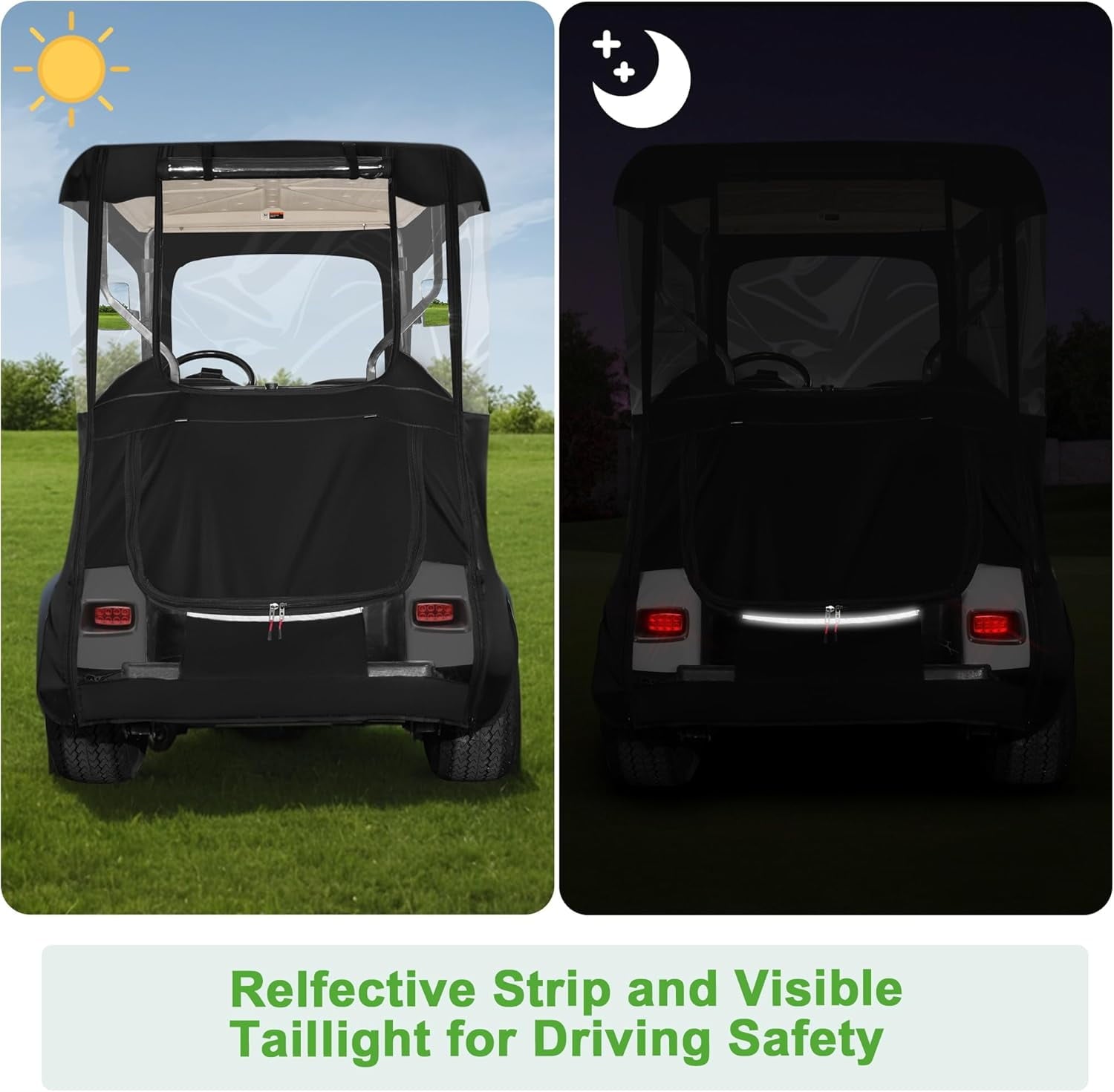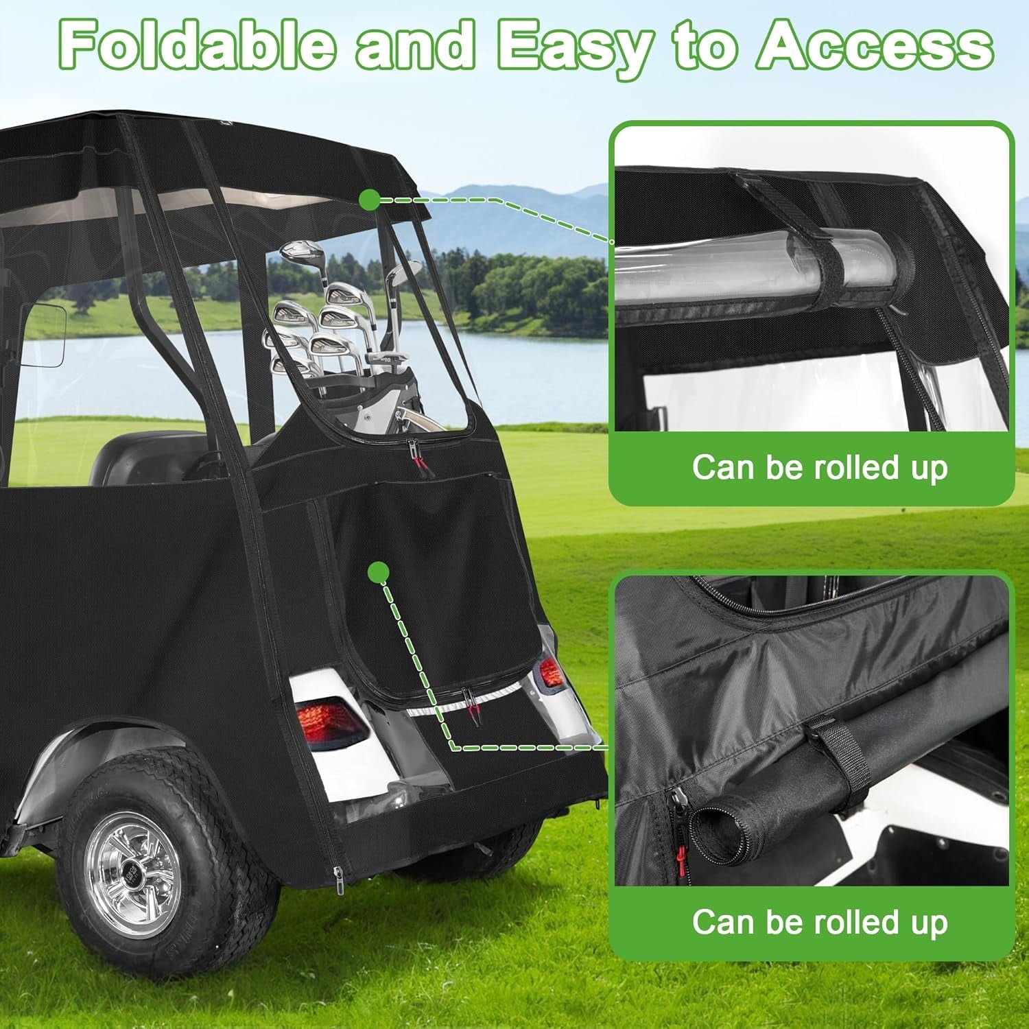 - 2 side doors and front rear windows can be zippered both inside and outside, roll up and easily fixed by magic tape, keep the golf cart ventilated and breathable