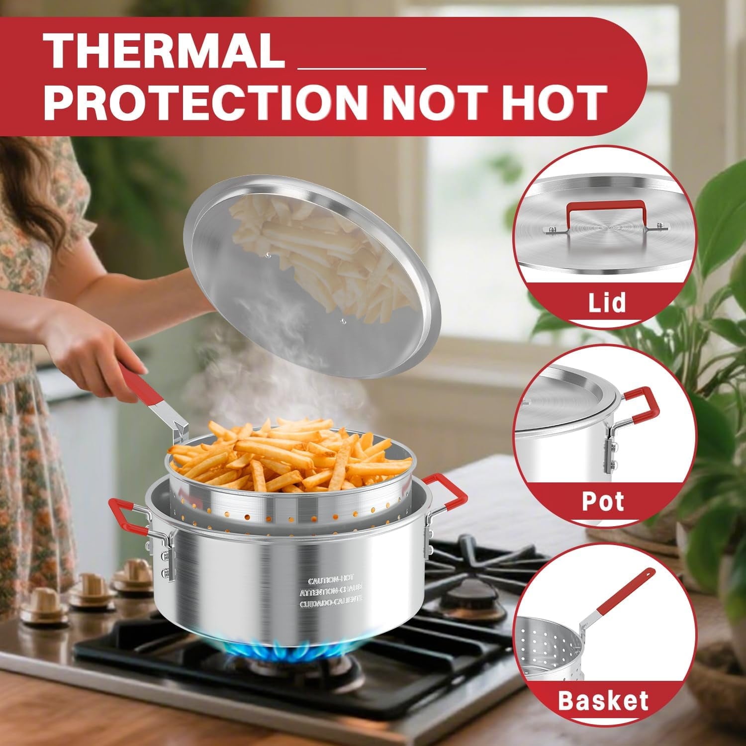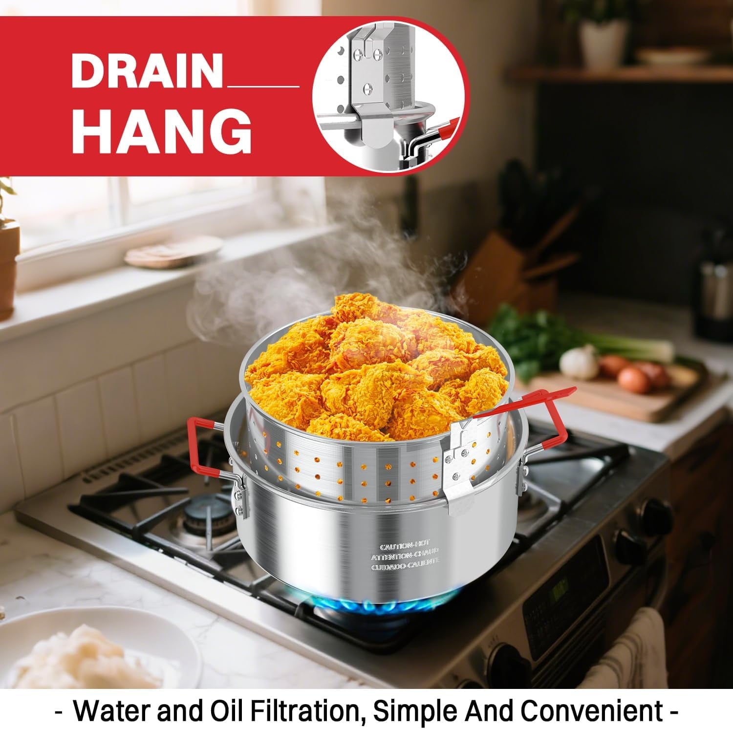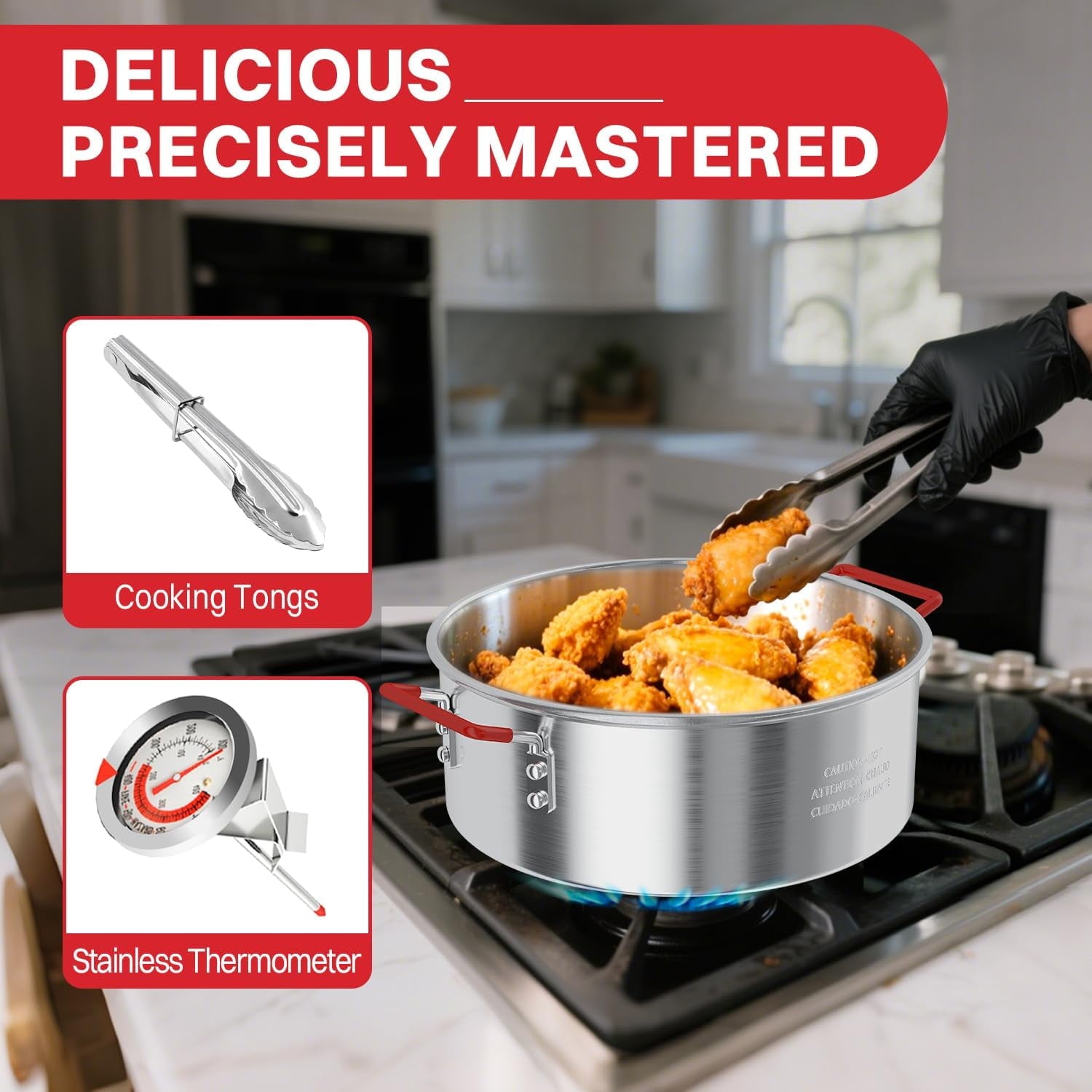 - 【𝟵 𝗜𝗡𝗖𝗛 𝗙𝗥𝗬𝗘𝗥 𝗧𝗢𝗡𝗚𝗦】Pipopa Fish Fryer Pot with Lid Basket and Burner also comes with 9-inch Grill Tongs.