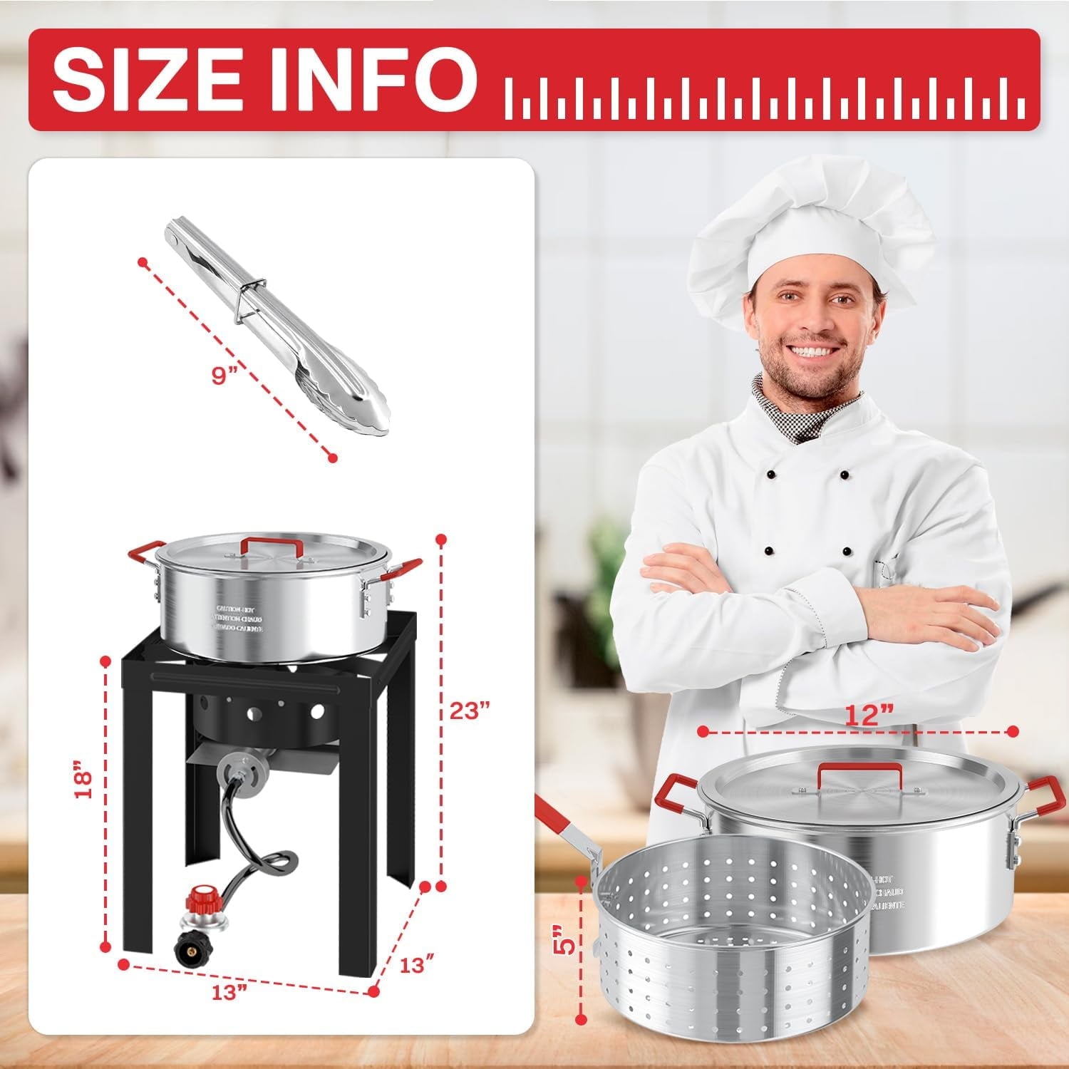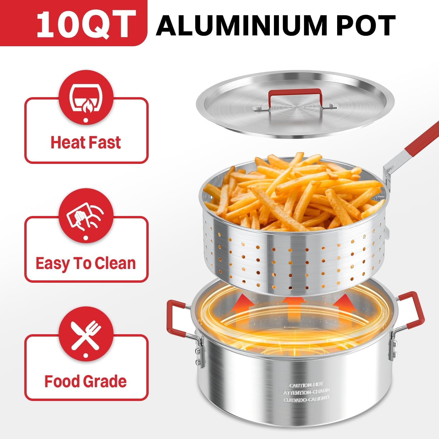 - 【𝟭𝟬𝗤𝗧 𝗣𝗘𝗥𝗙𝗘𝗖𝗧 𝗣𝗢𝗧 𝗞𝗜𝗧】The spacious 10-quart fish pot and matching basket are perfect for outdoor cooking, family BBQ, camping or professional chefs! No more wasted time and effort with multiple refills!