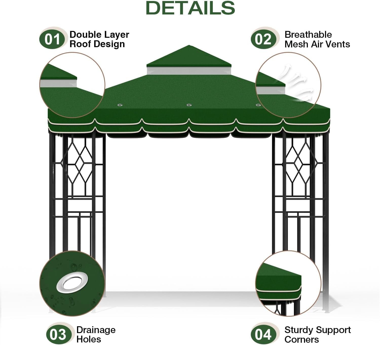 ⛺【Nice Additional Features】In order to be able to drain well in rainy days, the canopy replacement top is designed with 16 drainage holes on top, which will not lead to water accumulation in the tent; PVC coating has good resistance to high temperature, which can resist strong sunlight and prevent harmful UVA and UVB rays.