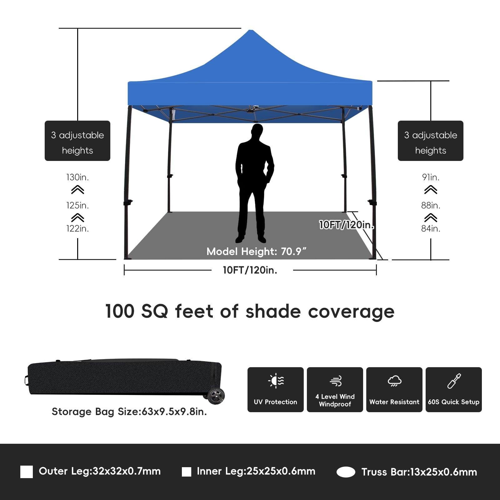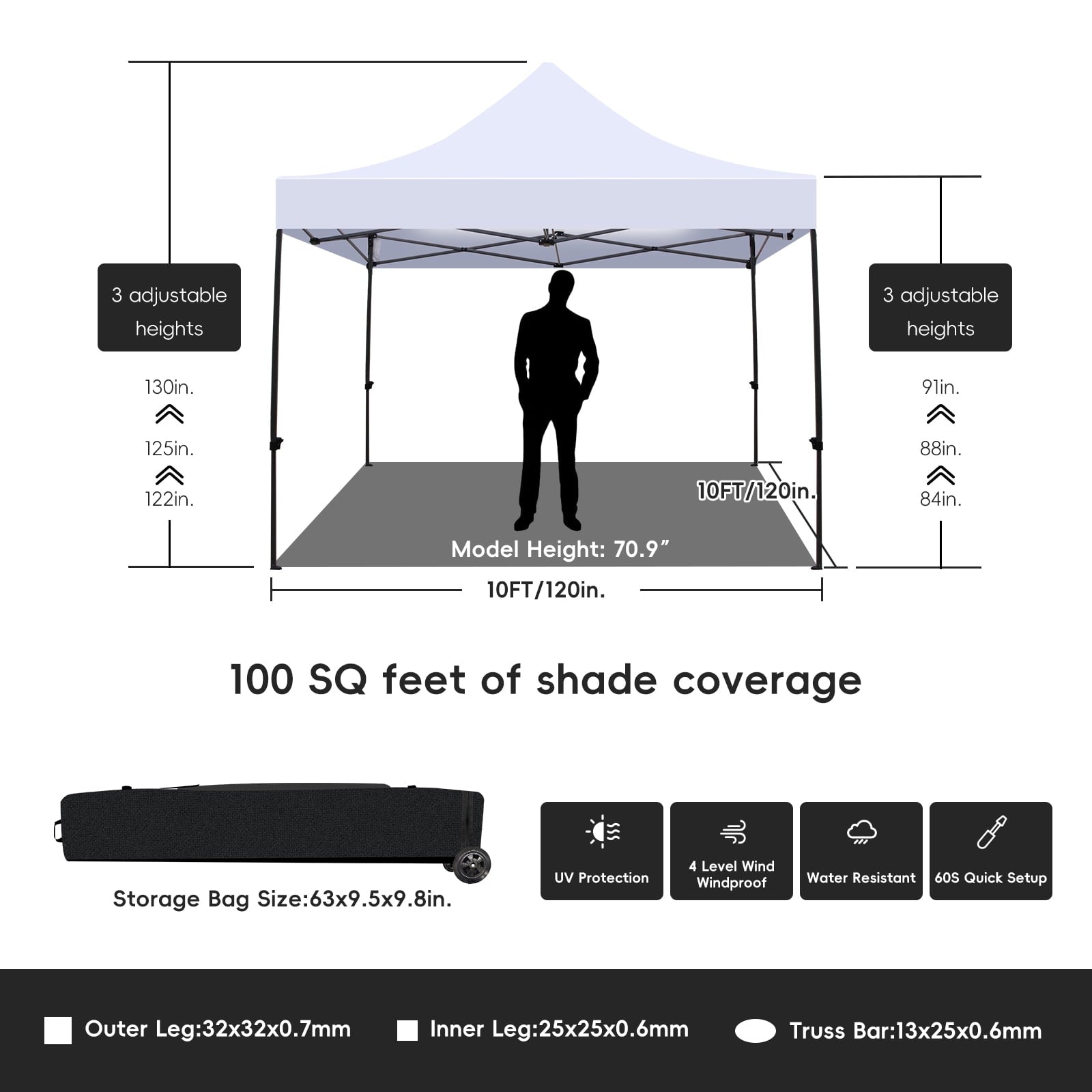 - Adjustable Height–Customize your canopy tent with 3 adjustable height settings. You can effortlessly modify the tent’s height with a simple press of a button, guaranteeing maximum comfort for you and your guests.