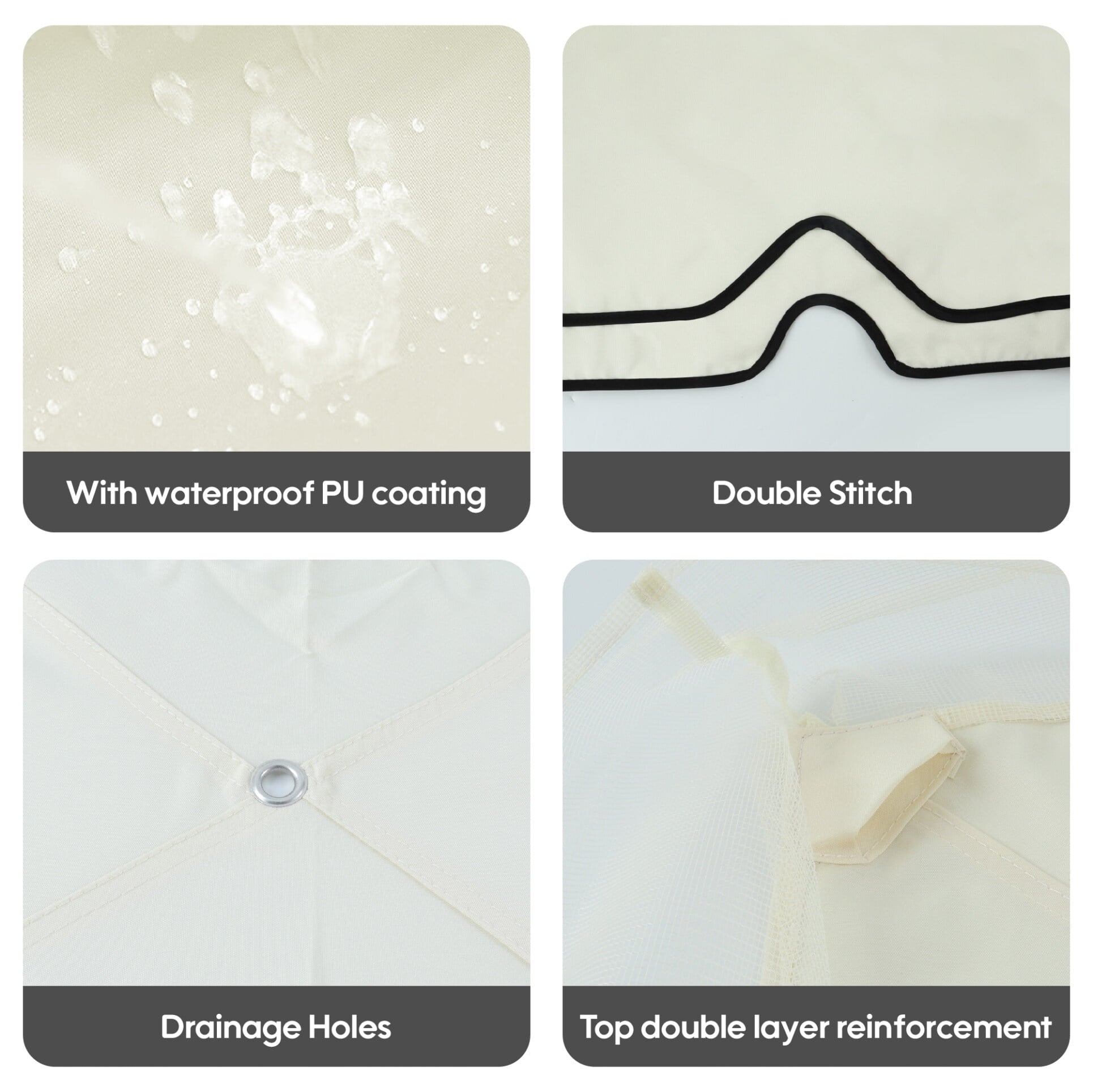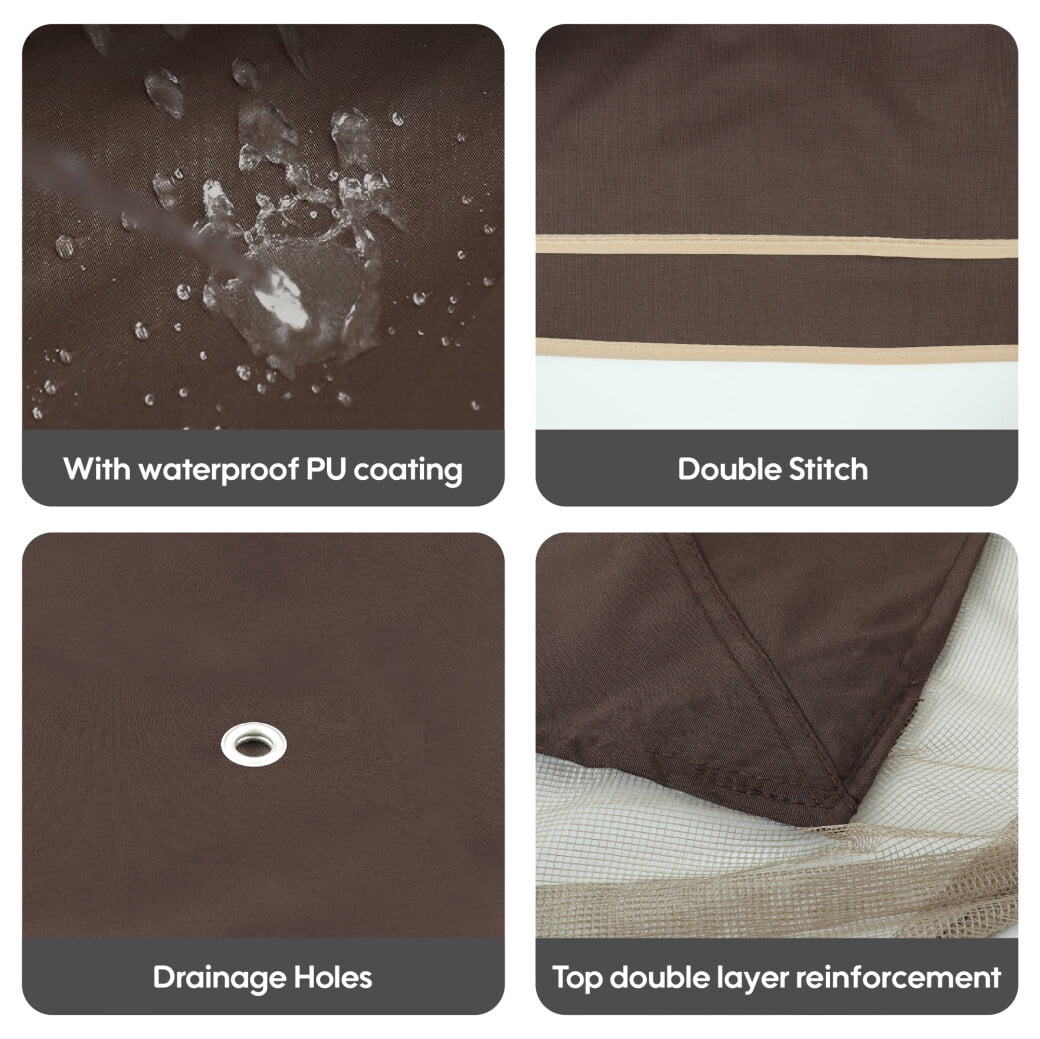 - 4 drainage holes on canopy sides quickly channel rainwater away, maintaining dry seating areas even during moderate showers