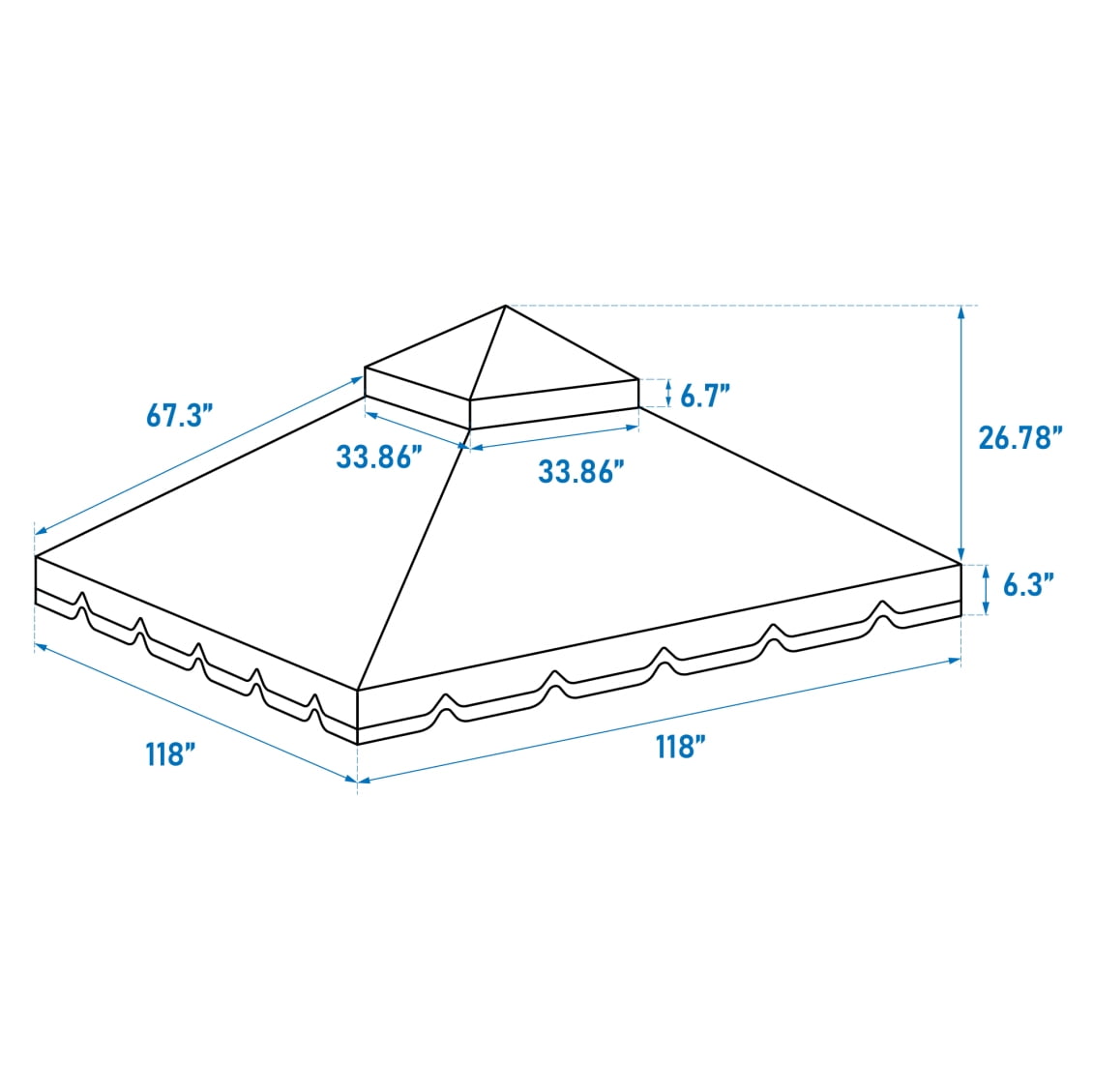 Compatible with standard 10×10 foot gazebo frames (not included), this replacement canopy measures 118″x118″ at the base and stands 33″ tall when installed. Weighing just 5.5 lbs, it’s easy to handle and store. The compact packaging (16.53″L x12.99″W x3.15″H) ensures hassle-free shipping and storage. Perfect for creating shaded retreats in patios, decks, or parks while protecting against sun, light rain, and flying insects.