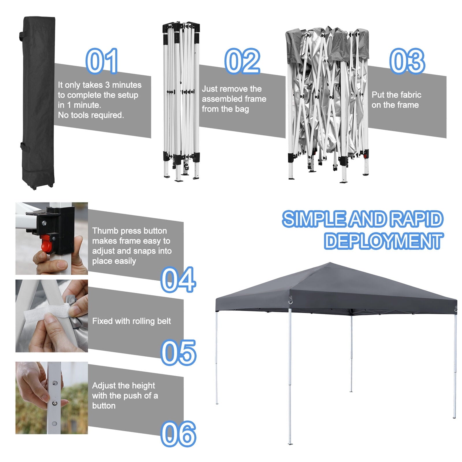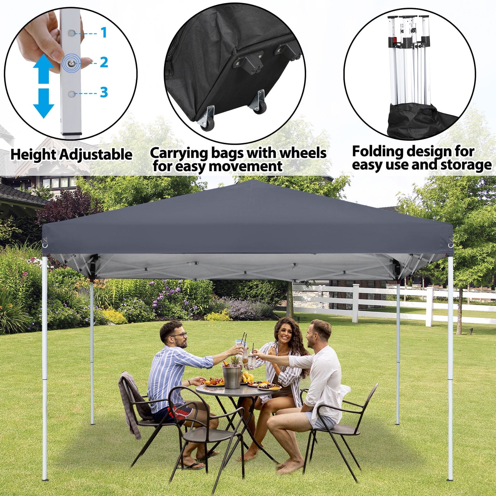 LIGHTWEIGHT: It is designed lightweight for portable uses, easy to carry around in the Wheeled carrying bag come with the tent. Perfect for family gathering or holding up events while hiding from the sun.