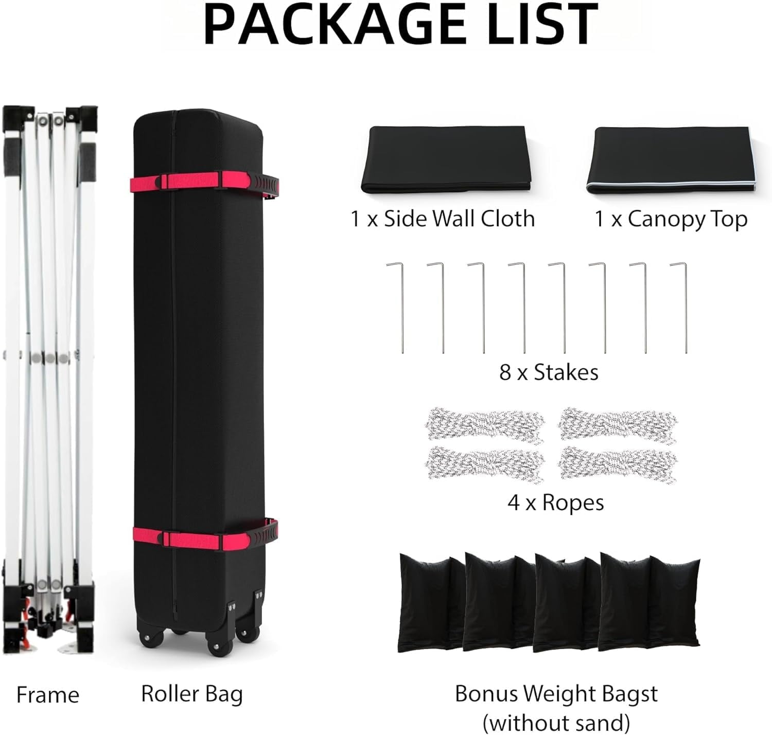 - Effortless Setup: Designed for quick and easy assembly, the tent can be set up by two people in minutes without any tools required. Simply remove the frame and roof from the wheeled bag, unfold the top canopy, place it over the frame, extend the legs to your desired height, and optionally attach the side wall