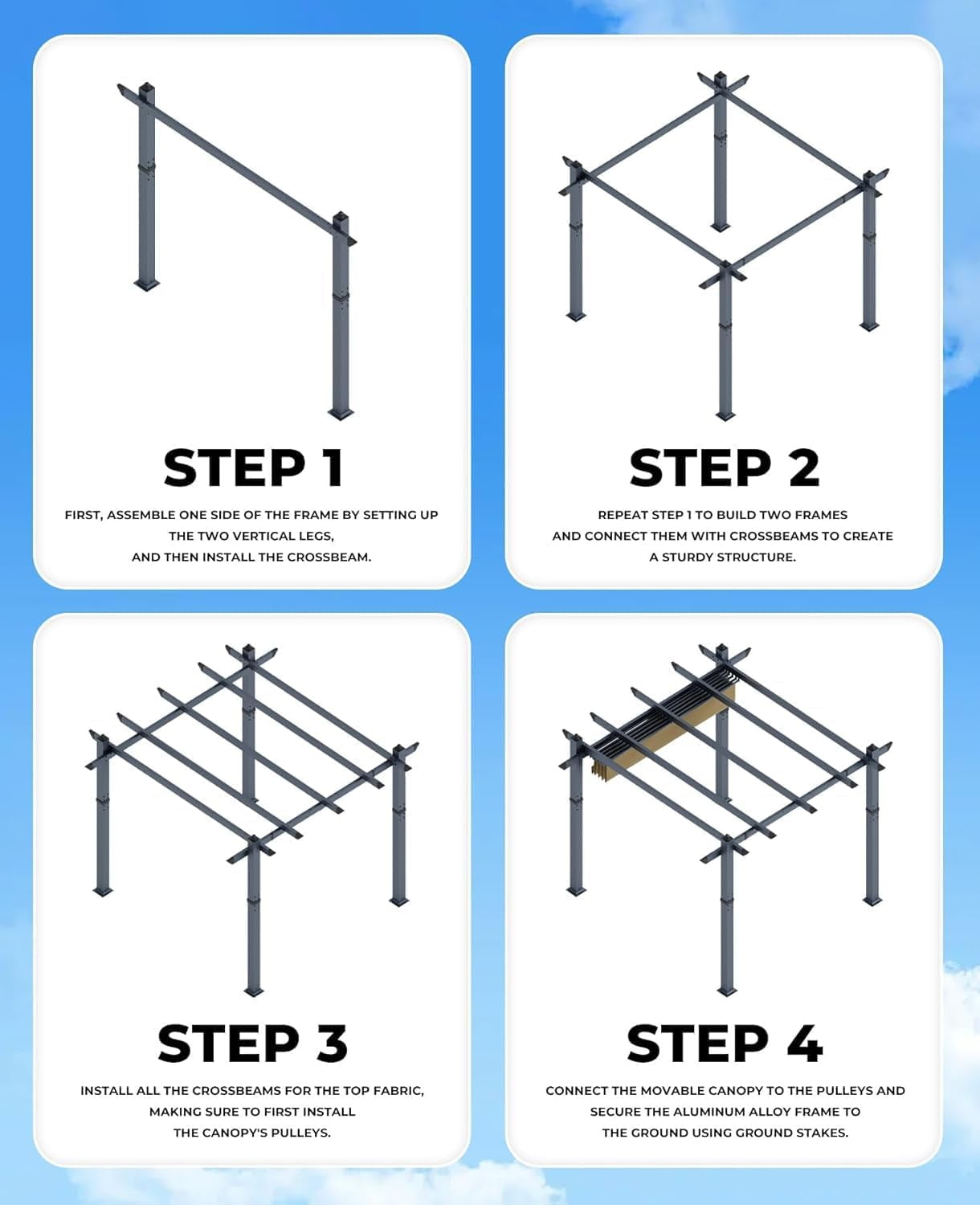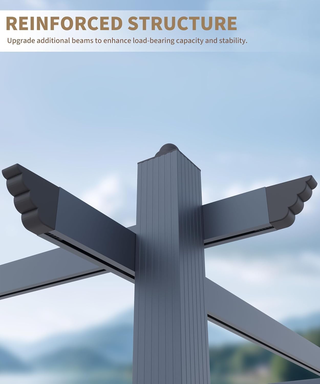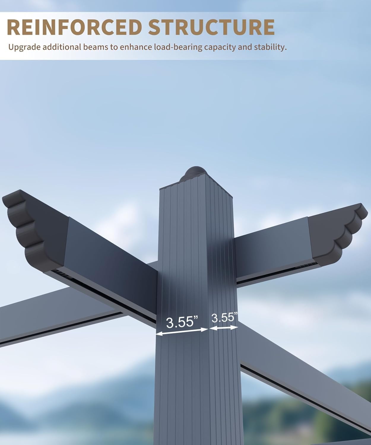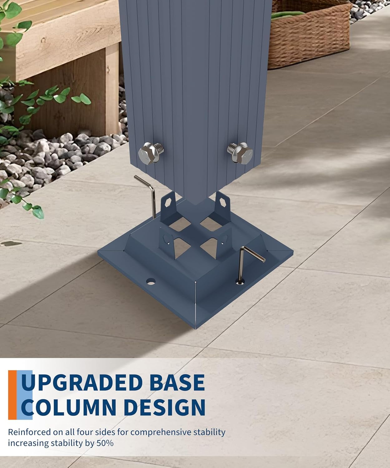 • 【Improved Base Supporting】- This aluminum pergola with retractable canopy has been upgraded for improved stability. Unlike ordinary base columns that only secure two sides, GarveeLife secures all four sides, preventing the entire trellis from wobbling and maintaining perfect stability even in windy conditions.