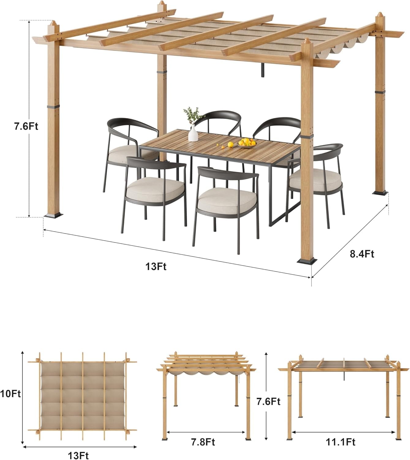 10×13 Ft Aluminum Pergola,Outdoor Metal Gazebo with Adjustable Canopy,Reinforced Frame Outdoor Shelter for Backyard,Patio Lawn and Deck – Wood grain beige