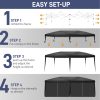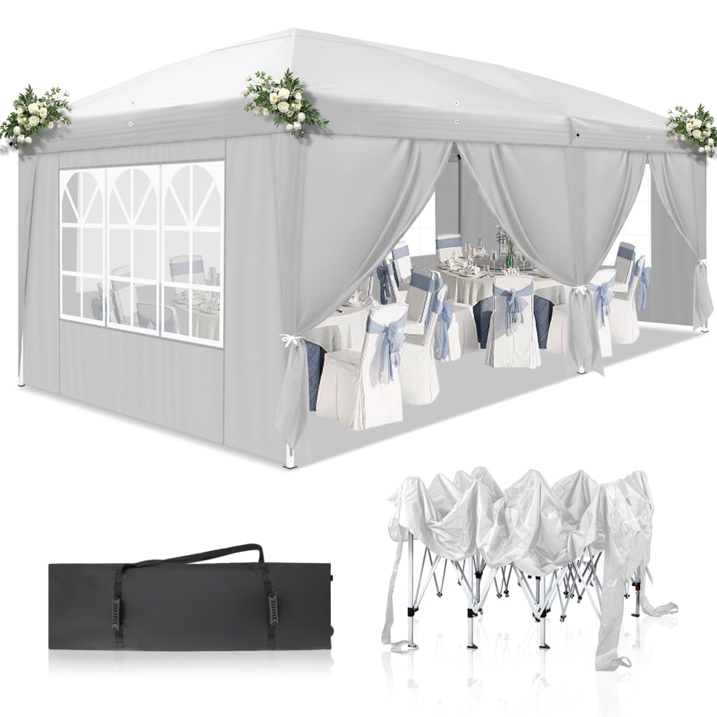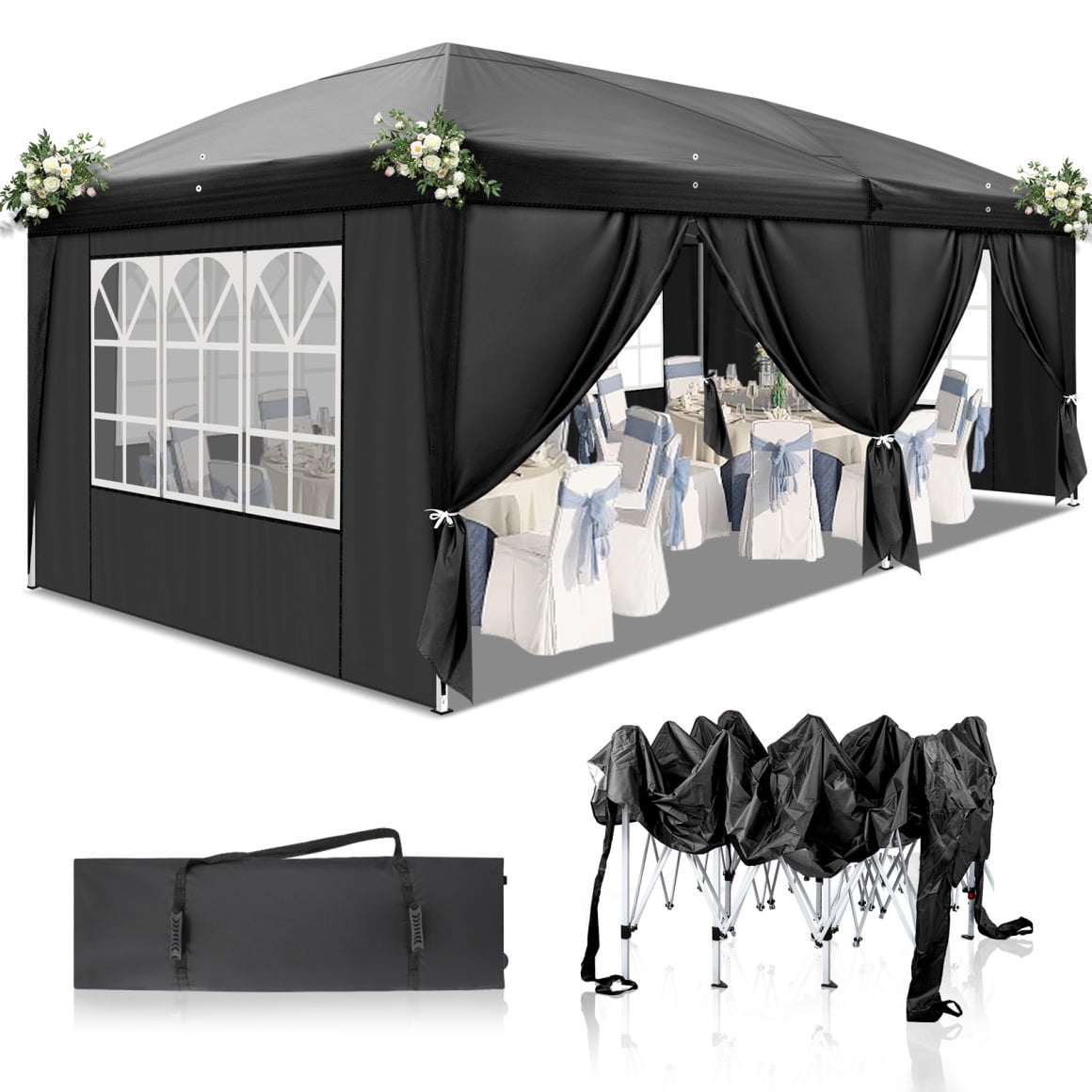 - 【Ultra-Stability】10 x 20 pop up canopy tent with 6 sidewalls + 4 windows, this canopy tent 10×20 is made of powder-coated aluminum and thicken steel frames to enhance stability. The D rings on the corners can be easily attached to the ropes and post to increase stability and windresistance when rains or snows.