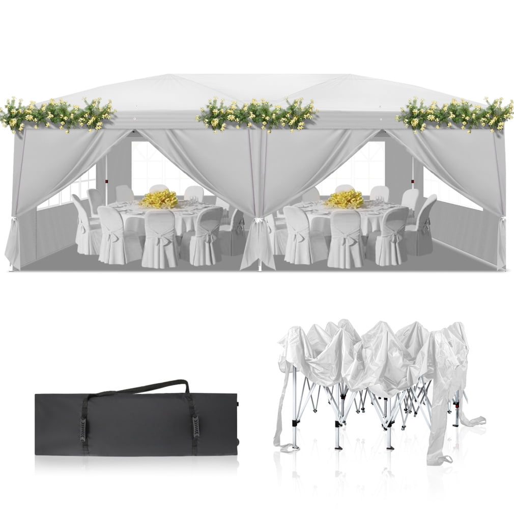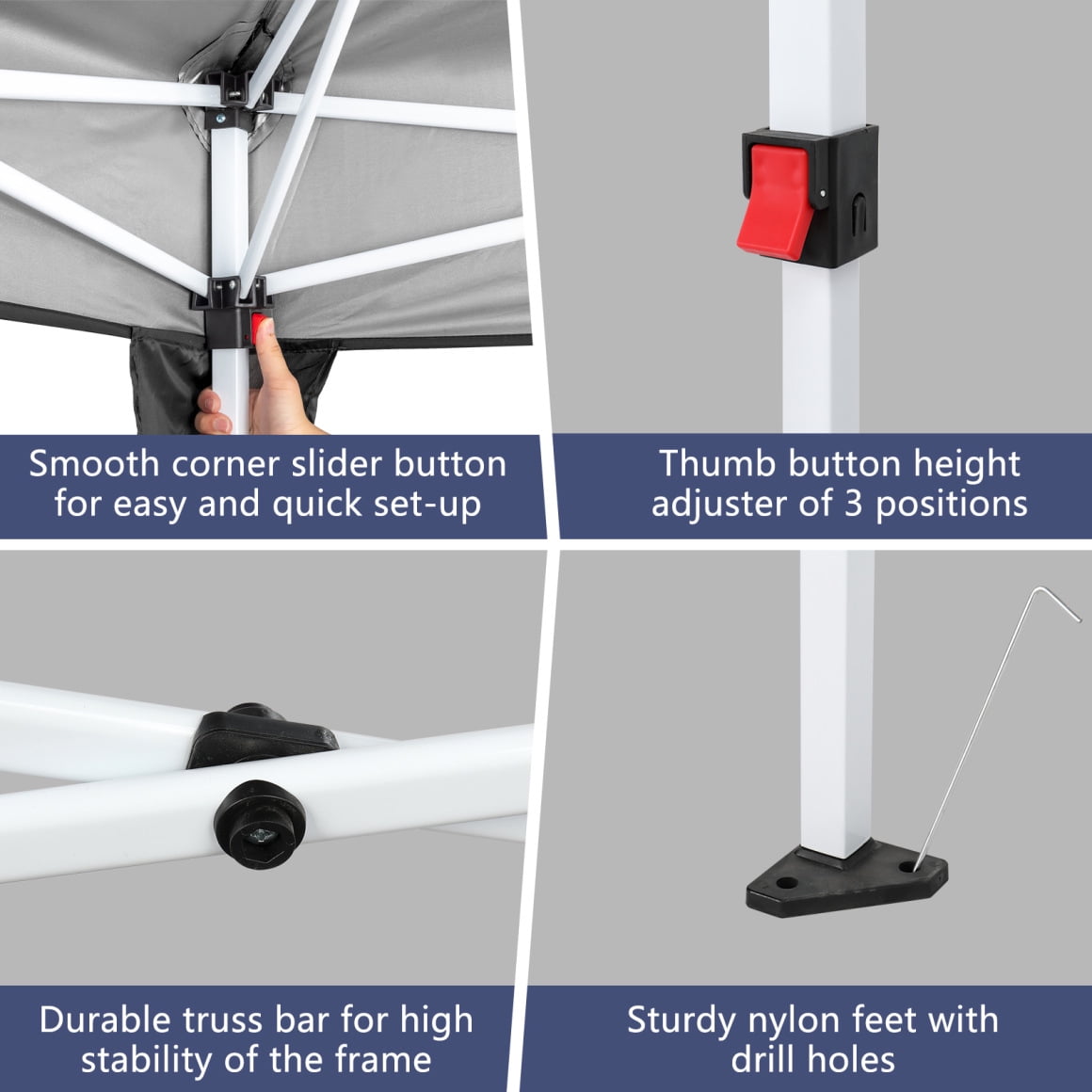 - 【Adjustable Height】10×20 canopy with sidewalls works great for family outdoor events, market stall and kids’ sporting events. The easily adjustable height with 3 different positions makes it a versatile tent.