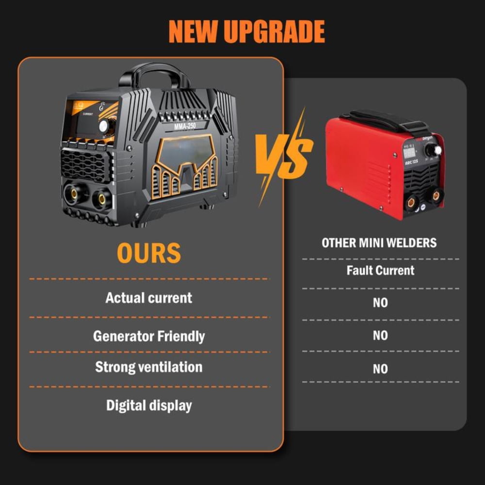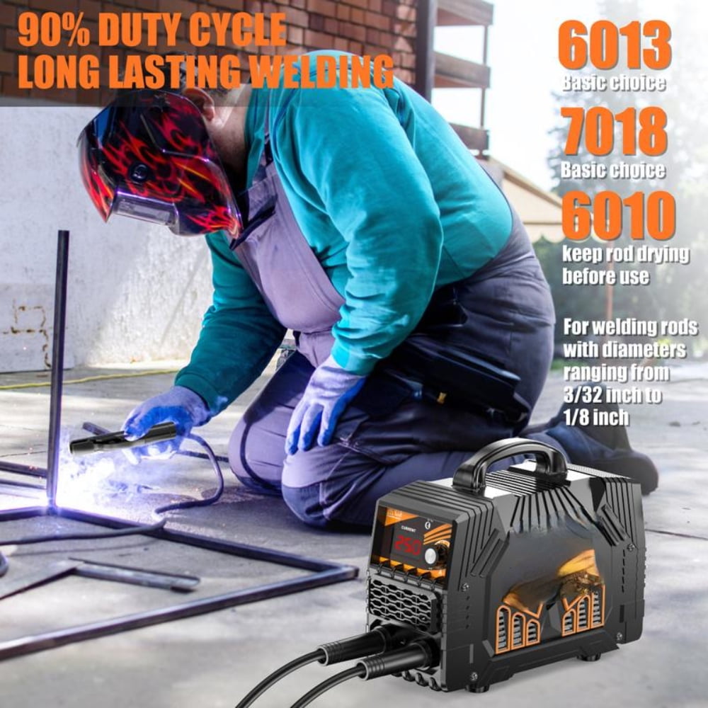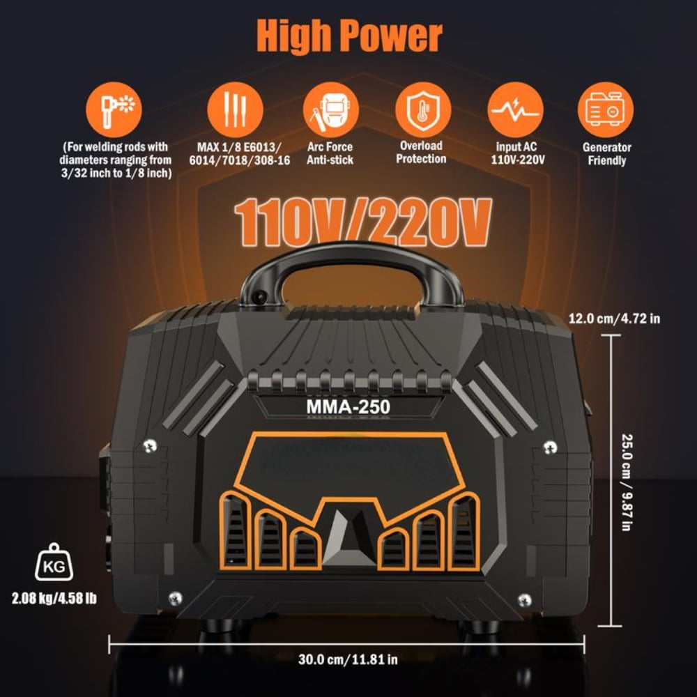 ·Dual Voltage (110V/220V): The Welder Supports both 110V and 220V Power inputs, making it versatile for different power sources. This allows it to be used in both home and industrial environments.·250A Maximum Current: With a maximum output of 250Amps, the welder can handle a wide range of welding jobs, from light to medium-duty tasks.·5000 Watt Power Output: The welder provides a total of 5000 watts of power, ensuring effective welding with good penetration.·Handheld Design: The welder is lightweight and portable, designed for easy handling during welding tasks.·Large LED Display: The large LED screen provides clear and easy-to-read settings, helping users to monitor and adjust the welding parameters.·Included Accessories:·Electrode Clamps: For secure attachment of electrodes during welding.·Work Clamps: Helps hold the workpiece in place for stability.·Brushes: Included for cleaning and finishing the weld area.·Rods: A selection of welding rods for different materials.·Gloves: Protective gloves to ensure safety during welding operations.·Applications:·This welder is suitable for a variety of tasks, such as:·Metal repair and fabrication.·DIY projects and home use.·Automotive or small welding jobs.·Suitable for welding mild steel, stainless steel, and other materials depending on the rods used.·Portability: Easy to carry and use, perfect for DIY enthusiasts and professionals who need flexibility.·Versatility: Can be used for various welding applications with adjustable power settings.·Safety Features: The welder comes with protective gloves and safety accessories to reduce risks while welding.