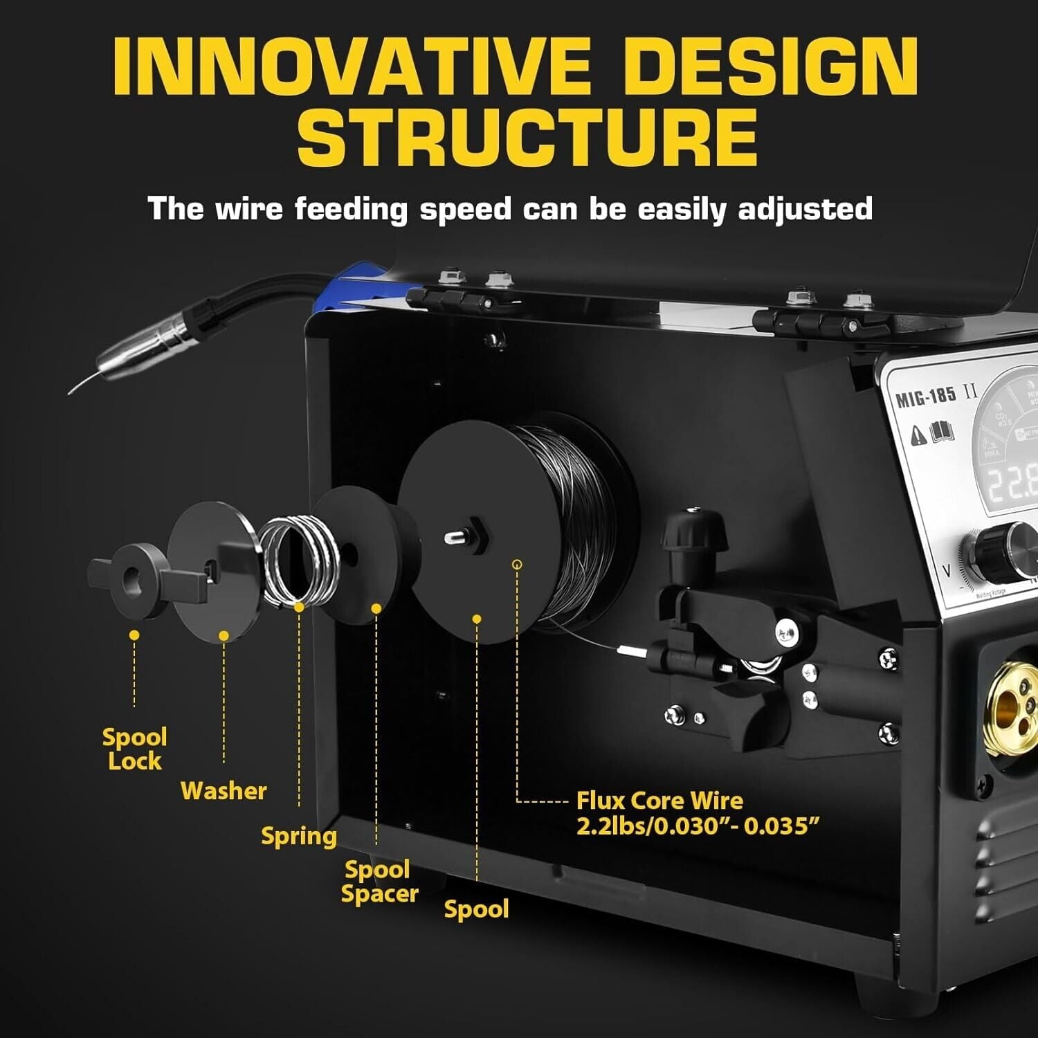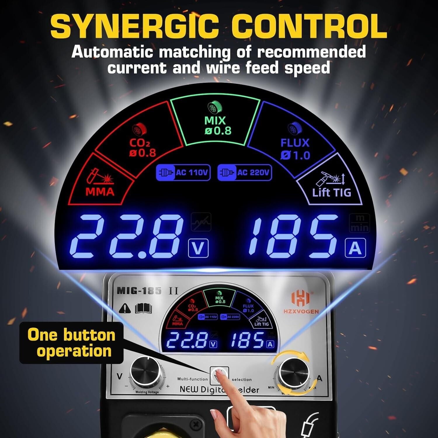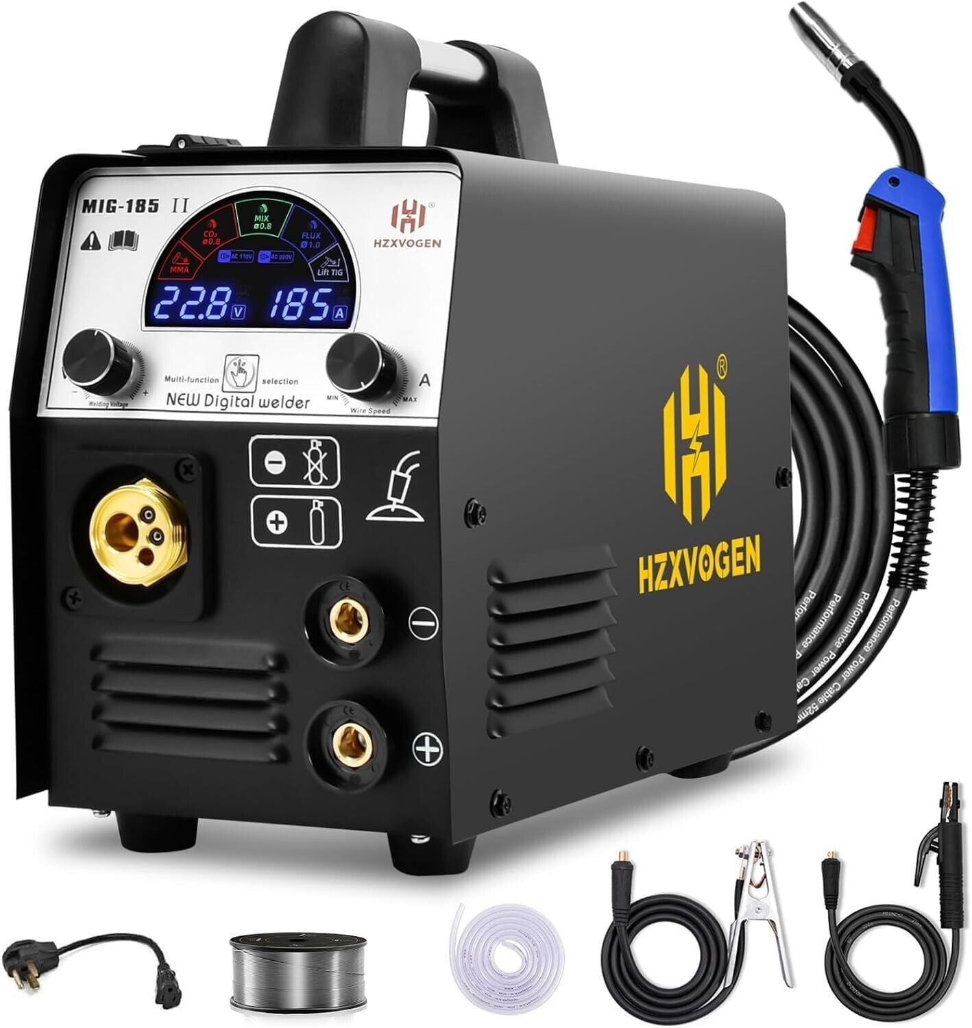✔ 5 IN 1 MIG WELDER MACHINE – HZXVOGEN MIG-185II Dual voltage 110/220 Multiprocess welder machine integrates the most innovative design structure and technology and includes all functions of every welding machine: MIG, ARC/MMA, Mix gas and gasless MIG, Flux Core MIG and Lift-TIG. Suitable for all kinds of welding requirements: 023”/.030”/.035” solid wire, .023”/.030”/.035” flux core wire.
