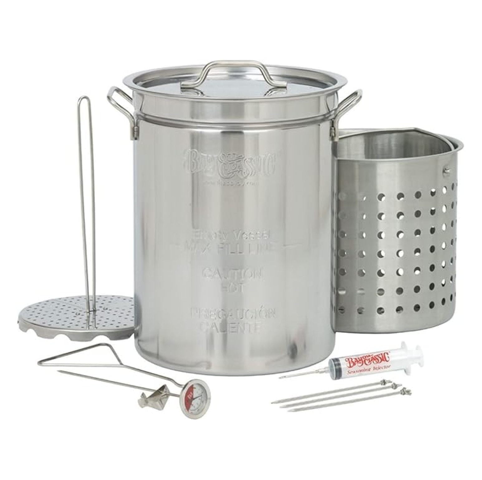 1118 32-qt Stainless Turkey Fryer Features Vented Lid Perforated Poultry Rack 12-in Stainless Fry Thermometer 2-oz Seasoning Injector