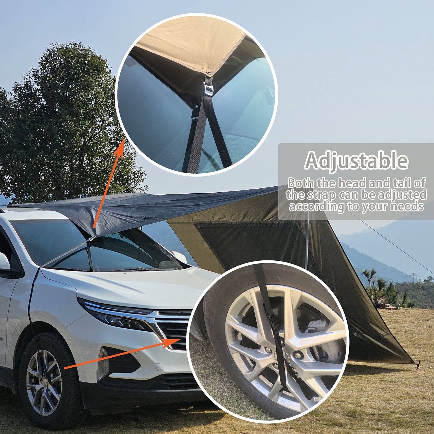 - Secure and Stable Setup: Equipped with robust buckle straps, our awning guarantees a secure attachment to your vehicle.The buckle straps provide stability, ensuring your awning remains steadfast against wind and movement.