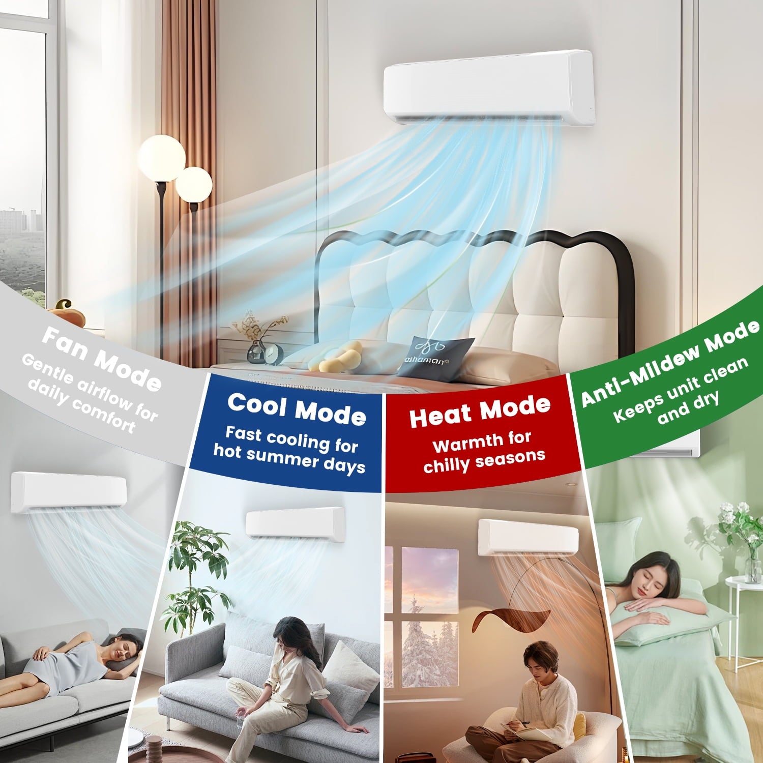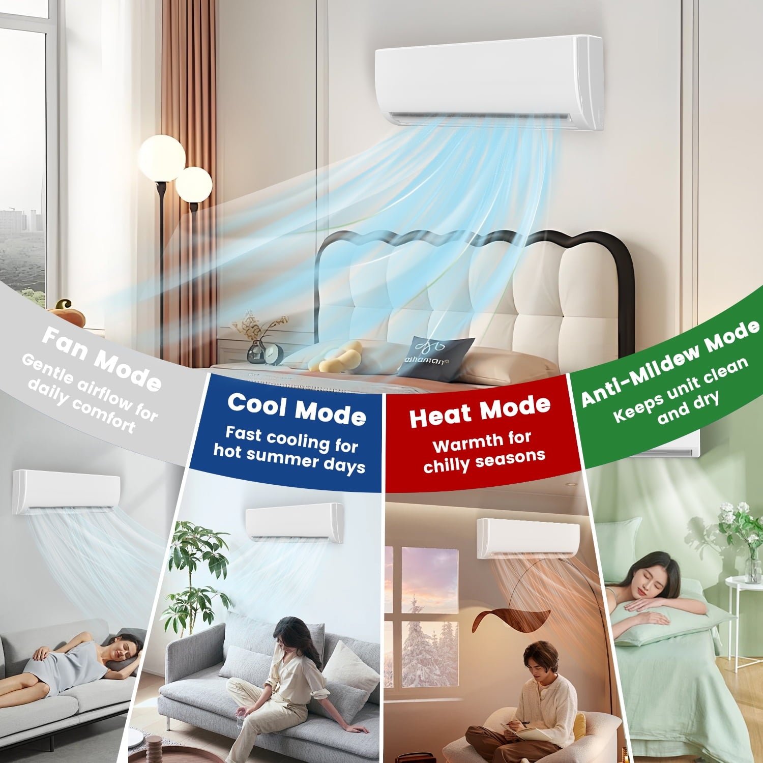 - 4 Modes for All-Season Comfort: Choose from Cool, Heat, Dry, and Fan modes to match the season. Customize airflow with 4 fan speeds (Low/Medium/High/Auto). Features Sleep Mode (as low as 26dB), ECO Mode (saves up to 30% energy), and Turbo Mode for fast temperature changes.